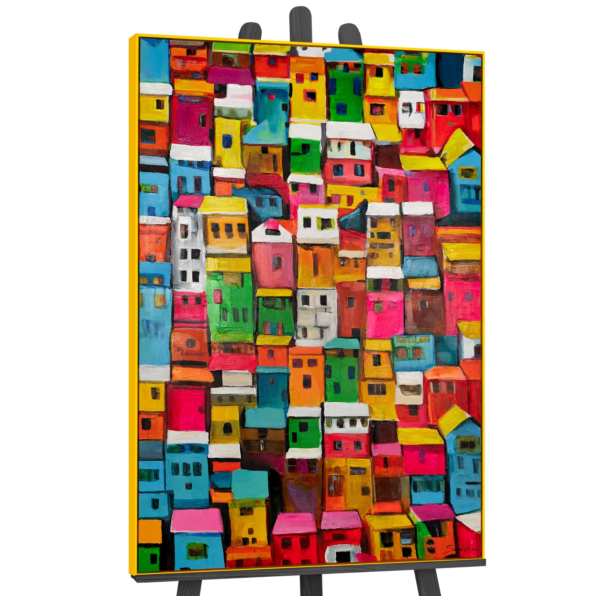 • Pintura Abstracta de la Ciudad "Pequeña Ciudad Colorida" con Marco - Arte Moderno para Sala de Estar