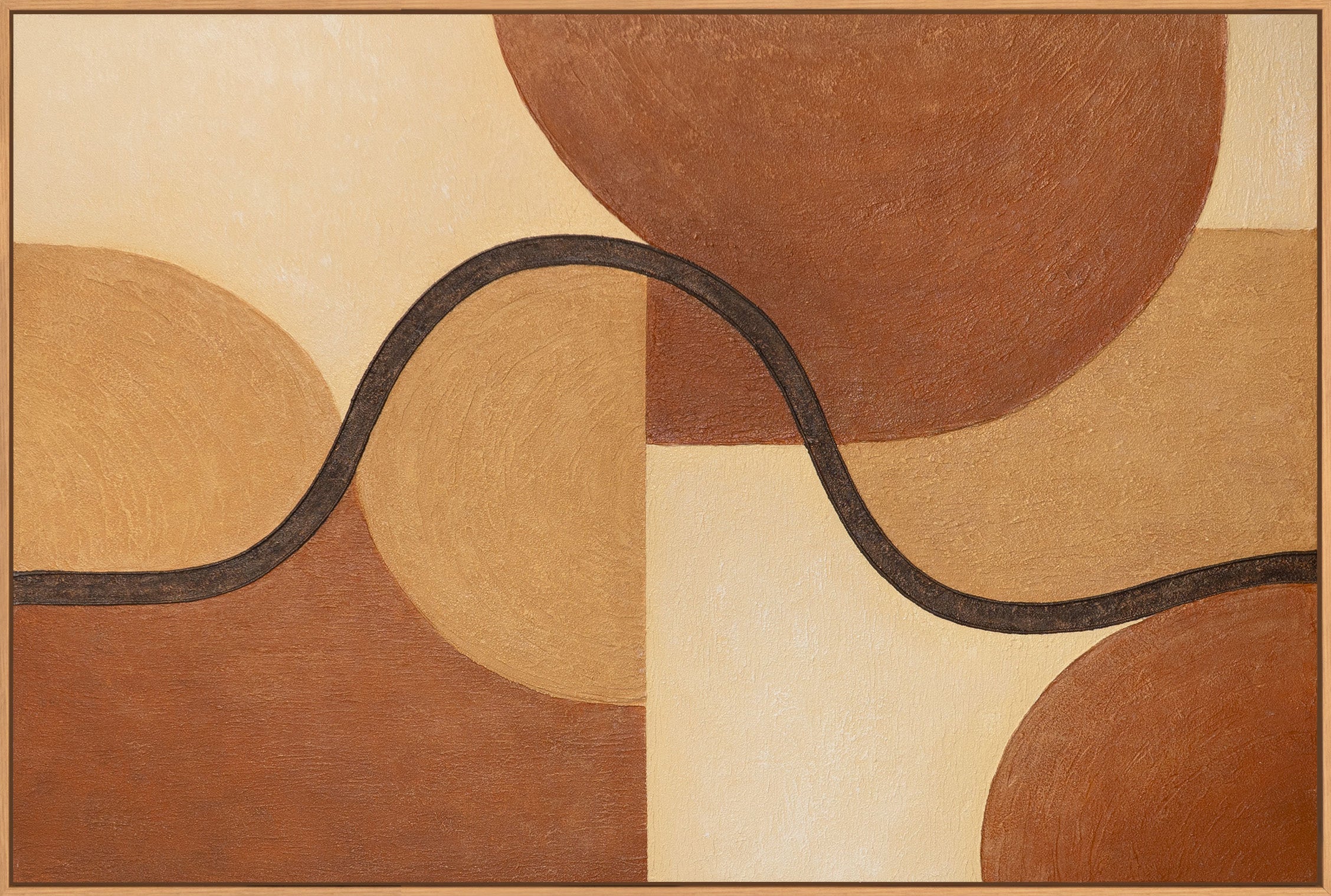 "Entrelazamiento de Formas" es una pintura acrílica abstracta con formas geométricas nítidas y líneas suaves y fluidas. Los cálidos tonos beige, ocre y marrón se combinan armoniosamente, creando una composición equilibrada y serena con una claridad moderna.