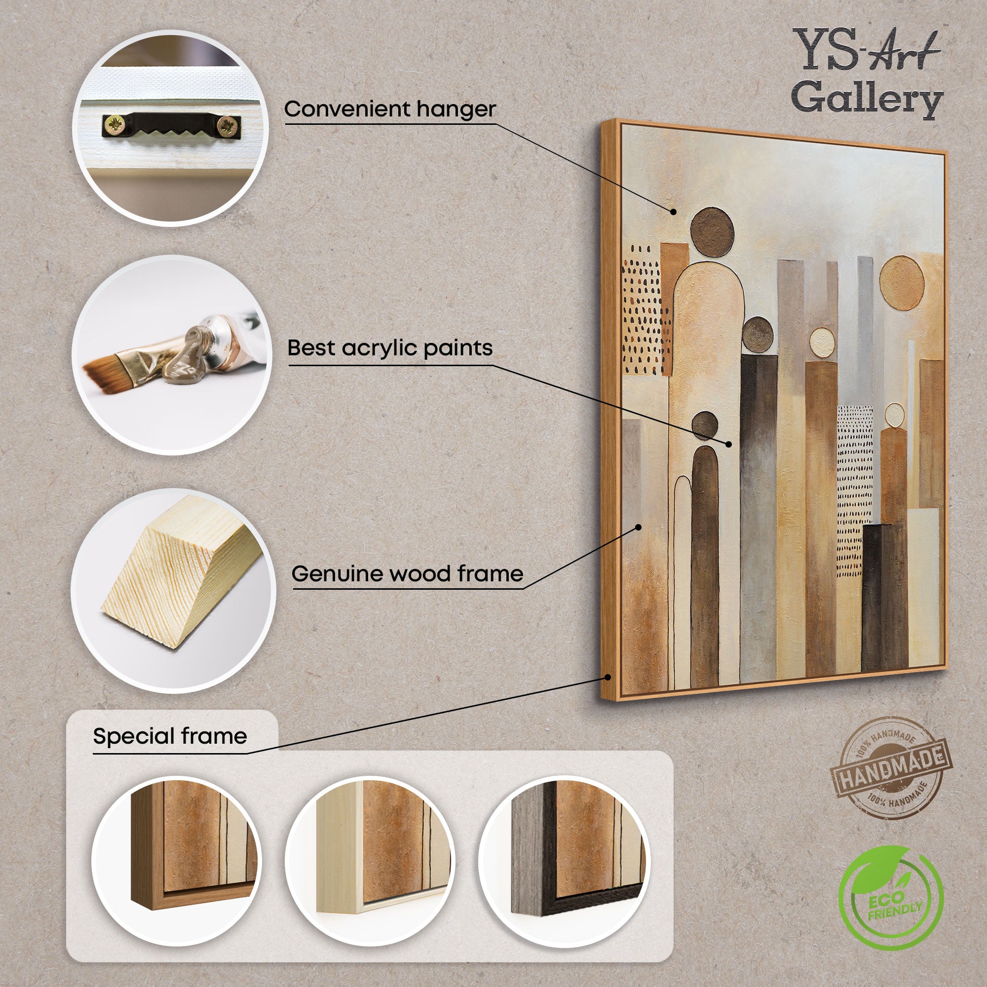 «Ciudad de Figuras» es un homenaje a la vida urbana, reducida a forma, ritmo y relación. Líneas verticales se elevan como casas hacia el cielo, mientras que los círculos simbolizan la presencia humana. La composición en tonos cálidos beige, marrón y ocre transmite movimiento y tranquilidad. En su estructura definida, evoca el latido de una ciudad, pulsando entre la proximidad y la distancia.