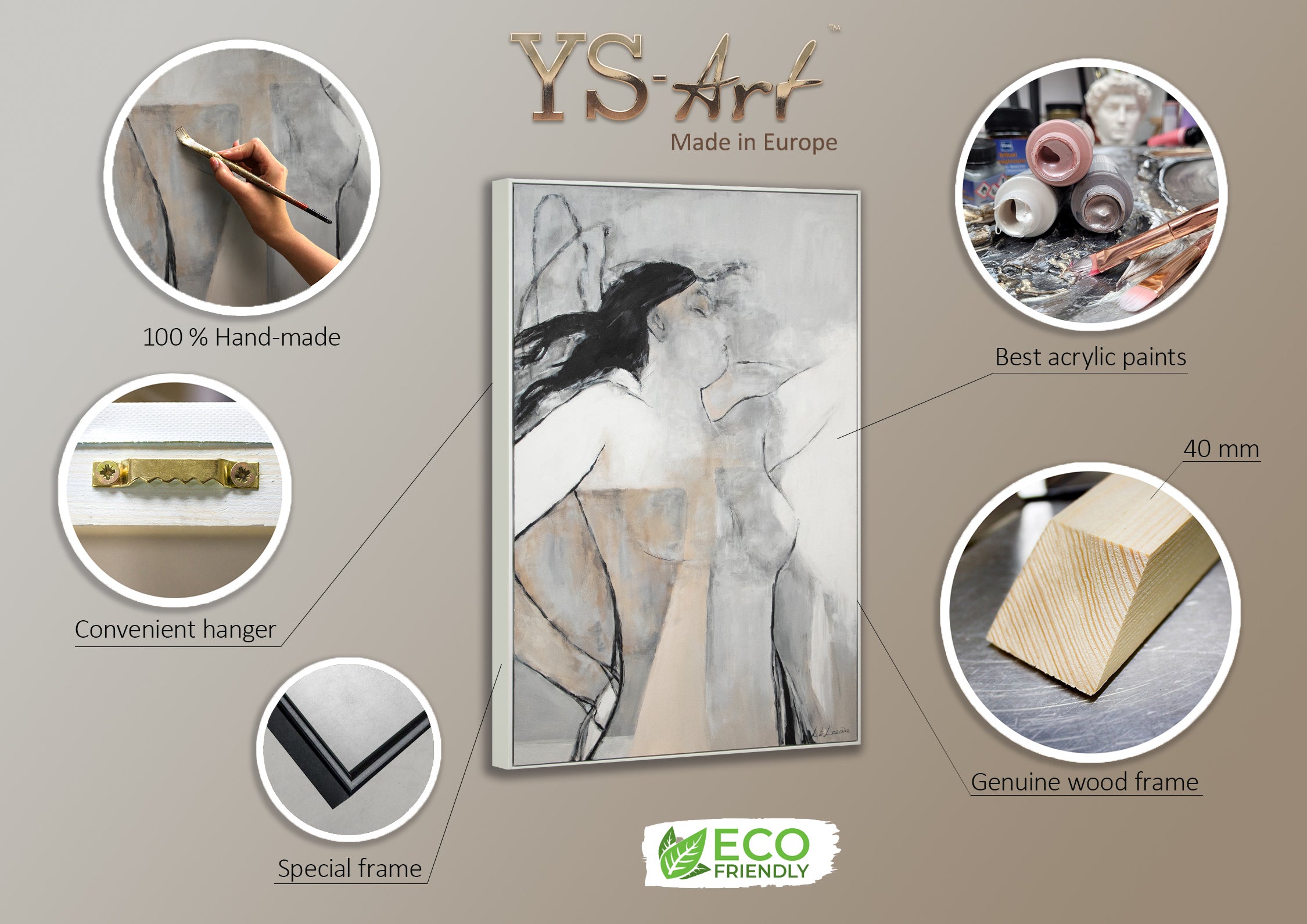 Una serie refinada, elegante y a la vez audaz de cuadros enmarcados. En esta colección no encontrarás motivos triviales para interiores grises y aburridos, ya que estas obras de arte representan una nueva y exclusiva tendencia en la pintura de interiores. Todos los cuadros acrílicos abstractos de esta serie vienen con marcos sencillos y claros, con dos ganchos metálicos ya montados en la parte posterior, listos para colgar.