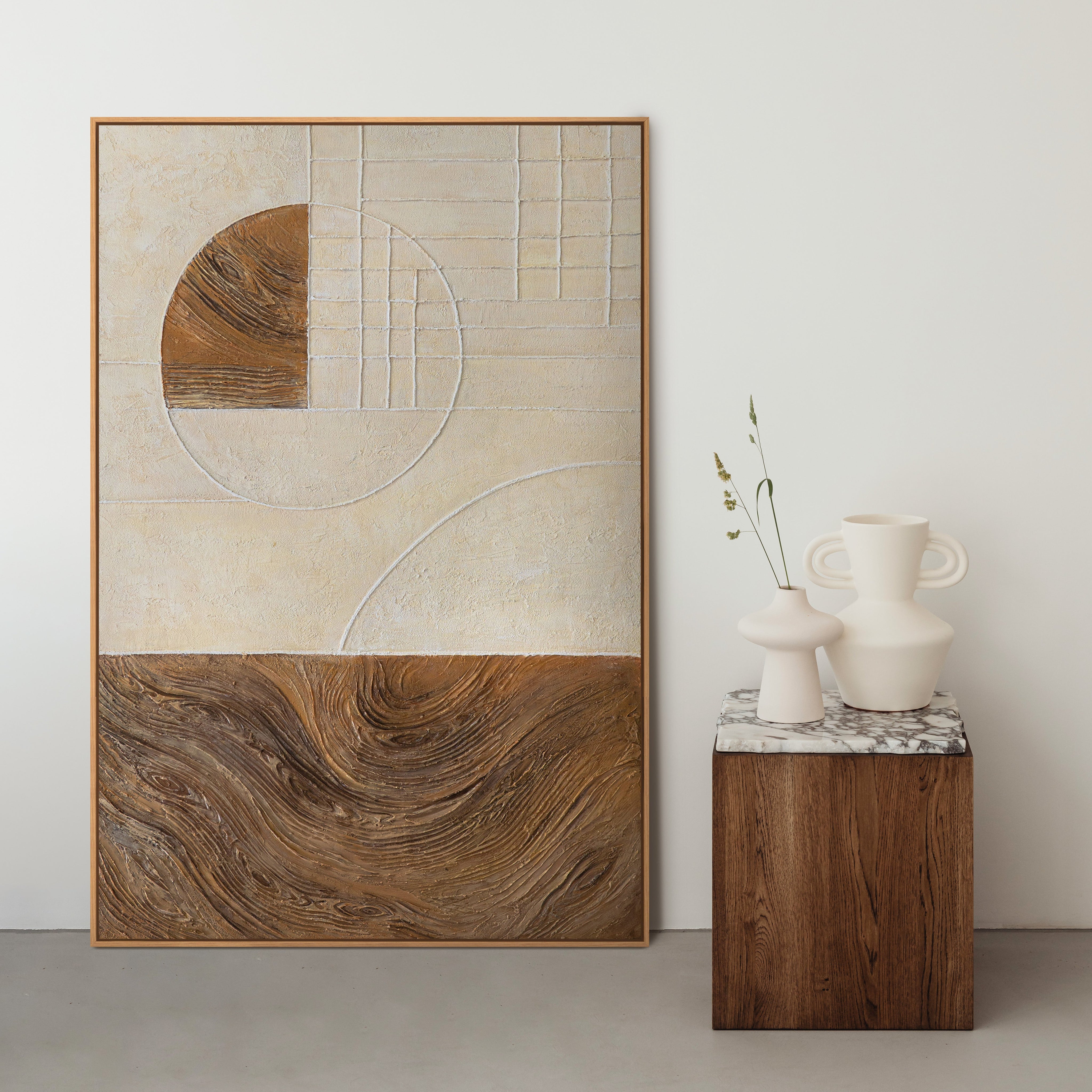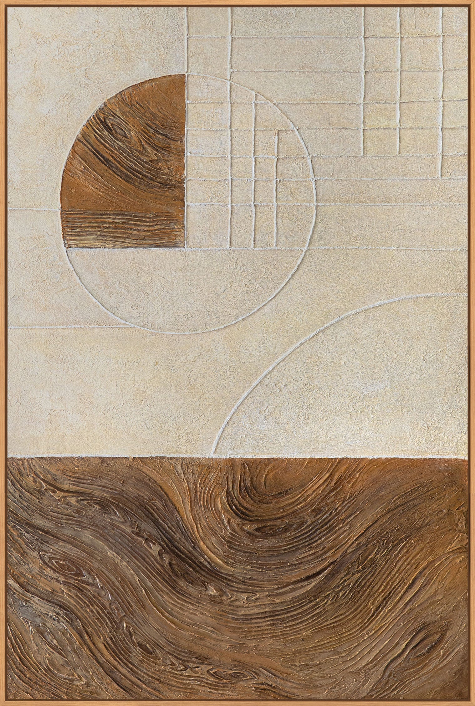 "Líneas y Círculos" es una pintura abstracta pintada a mano con una clara estructura geométrica y un impactante efecto superficial. La serenidad de los tonos beige y arena se combina con una audaz forma circular y finas cuadrículas lineales, complementadas con una textura contrastante en relieve en la parte inferior.