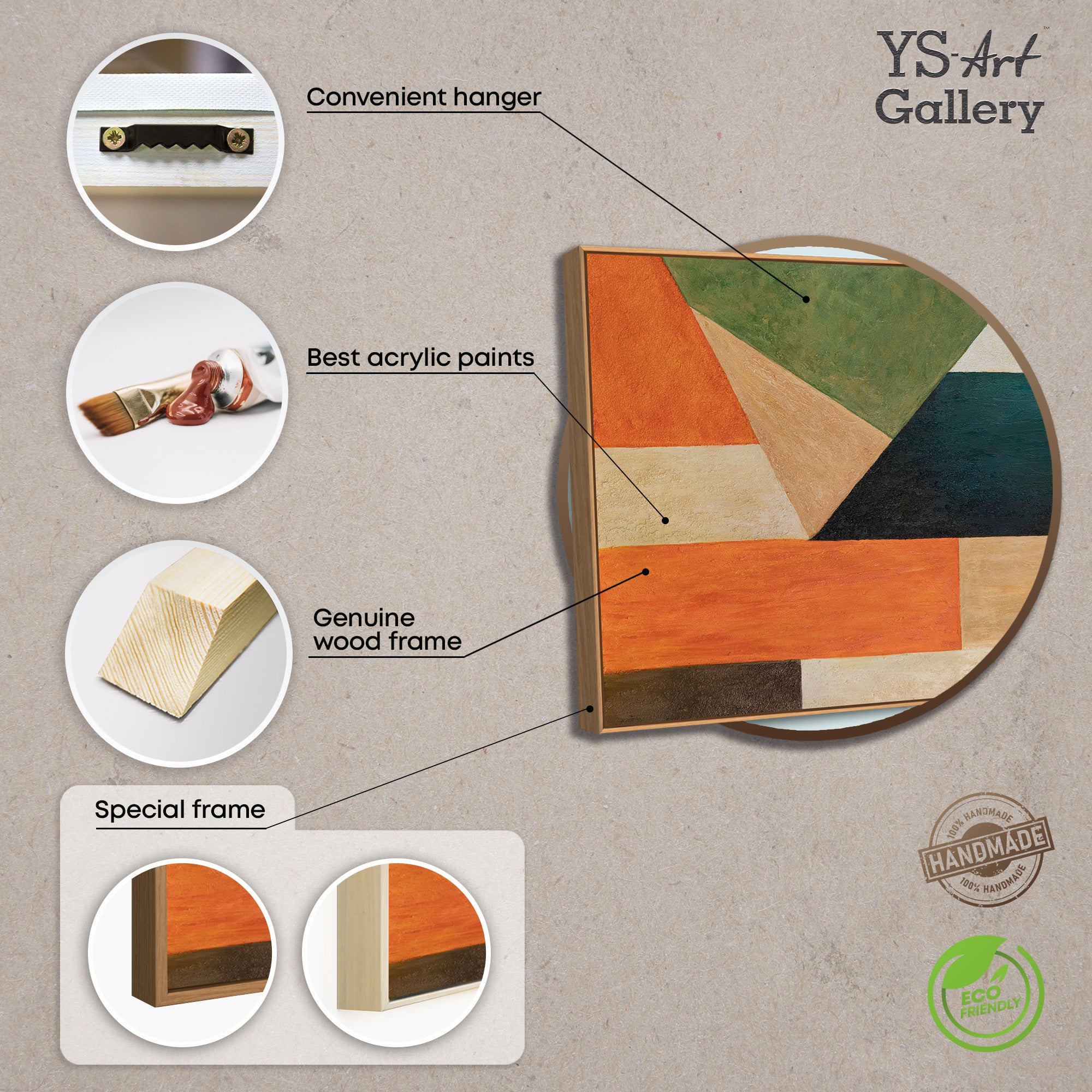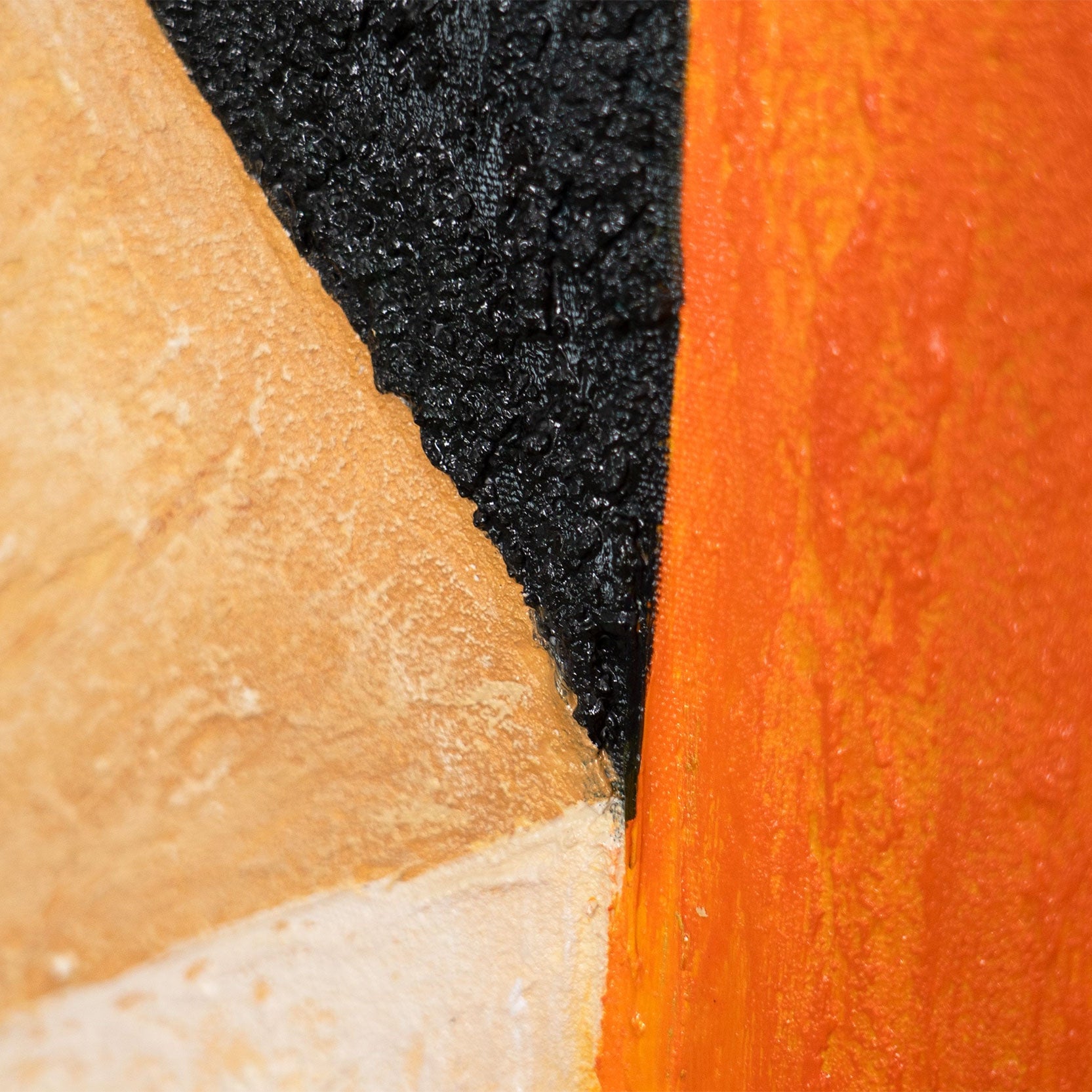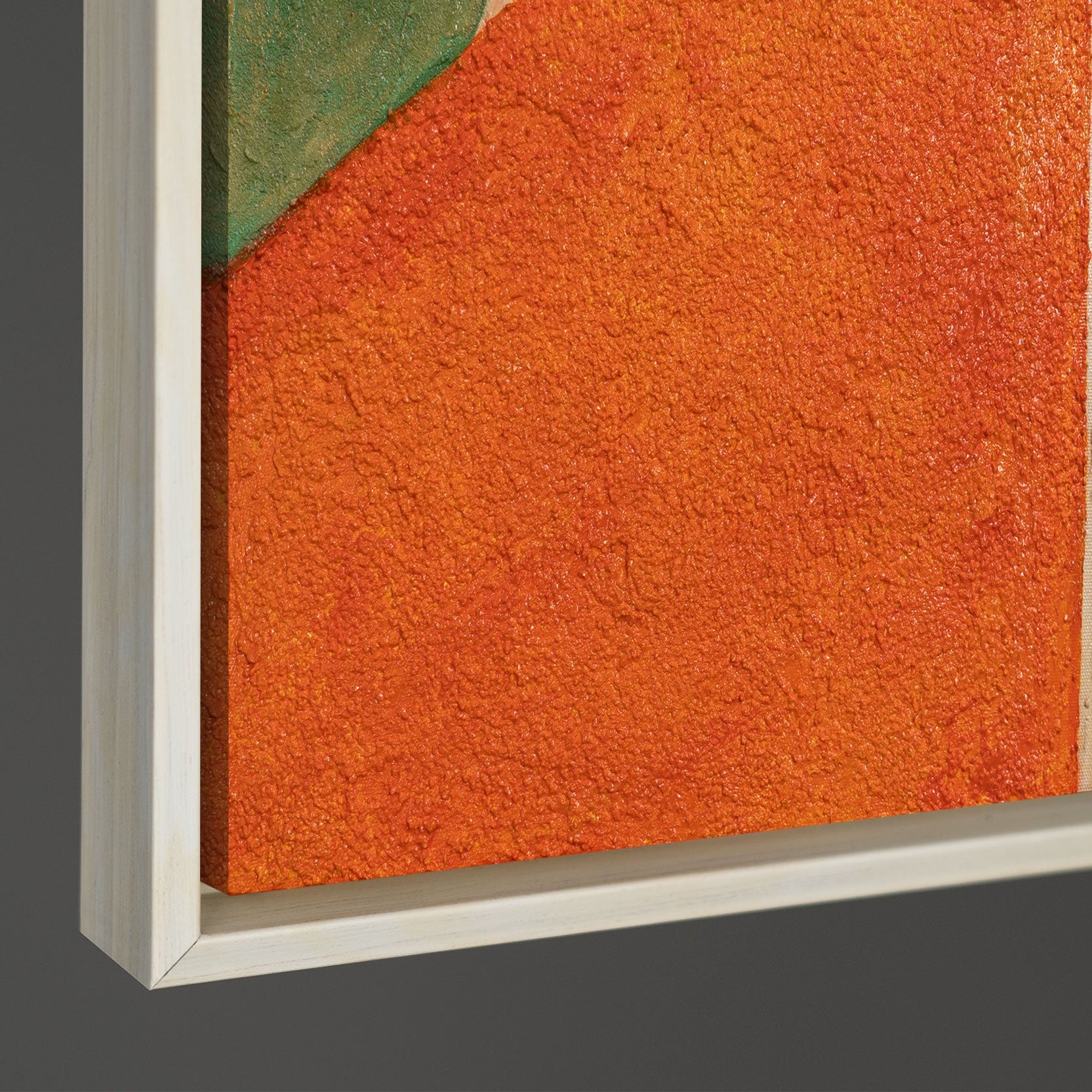 "Orden y Movimiento" presenta una clara composición geométrica de formas y líneas contrastantes. Tonos cálidos de naranja y beige se combinan con azules y verdes intensos, creando una impresión general dinámica y equilibrada. Las pinceladas visibles aportan profundidad y una superficie vibrante.