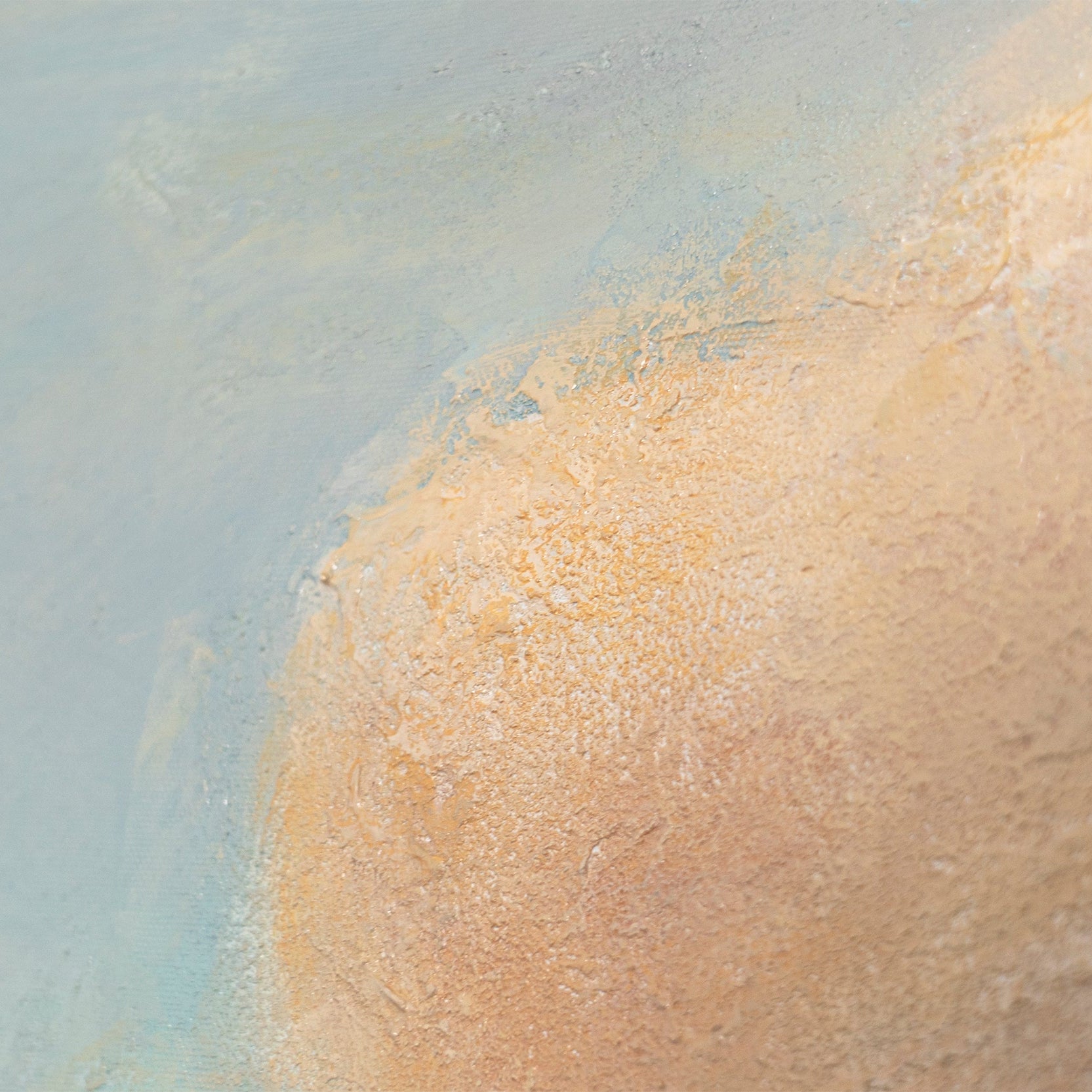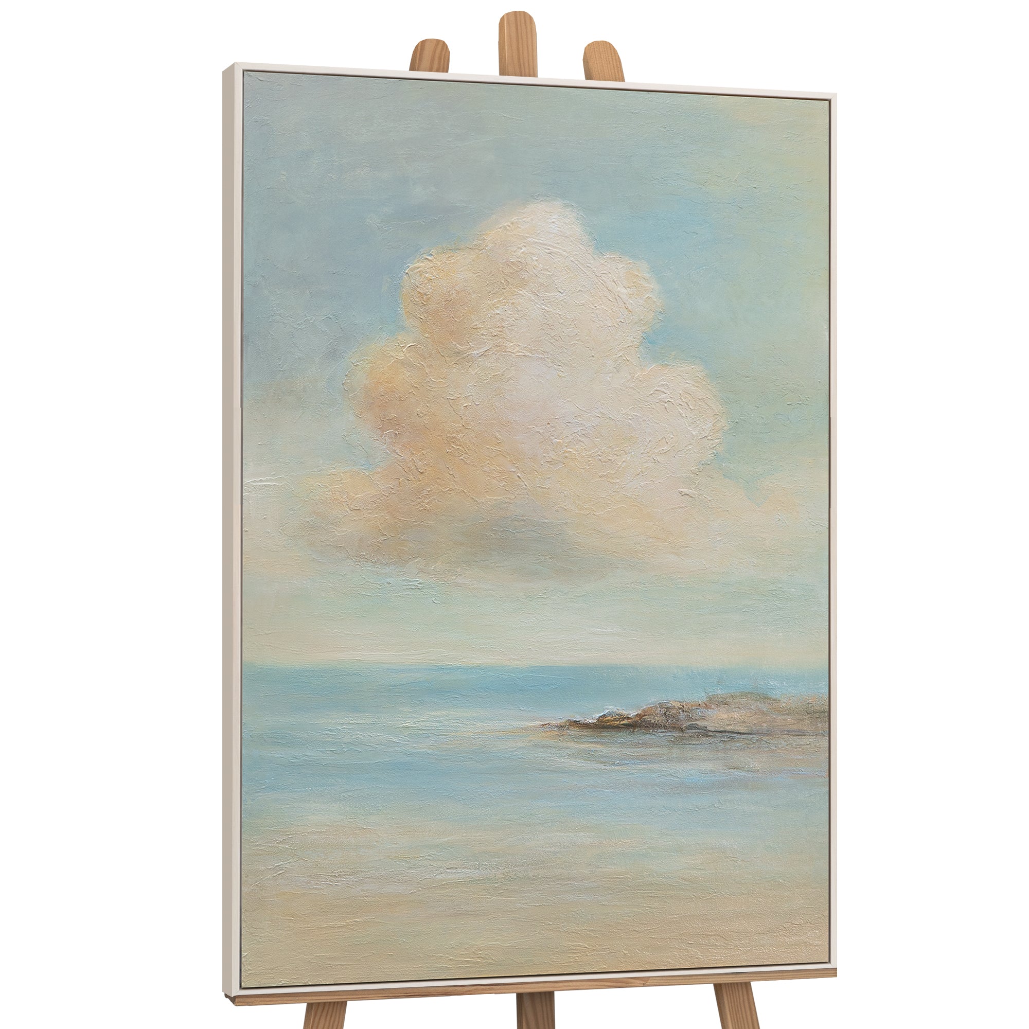 «La ligereza del ser» plasma un instante de perfecta tranquilidad. Suaves nubes flotan sobre el delicado azul del mar, mientras que sutiles texturas y tonos pastel de beige y crema reflejan delicadamente la luz. La superficie pintada a mano da vida a la imagen y llena la estancia de una energía apacible.