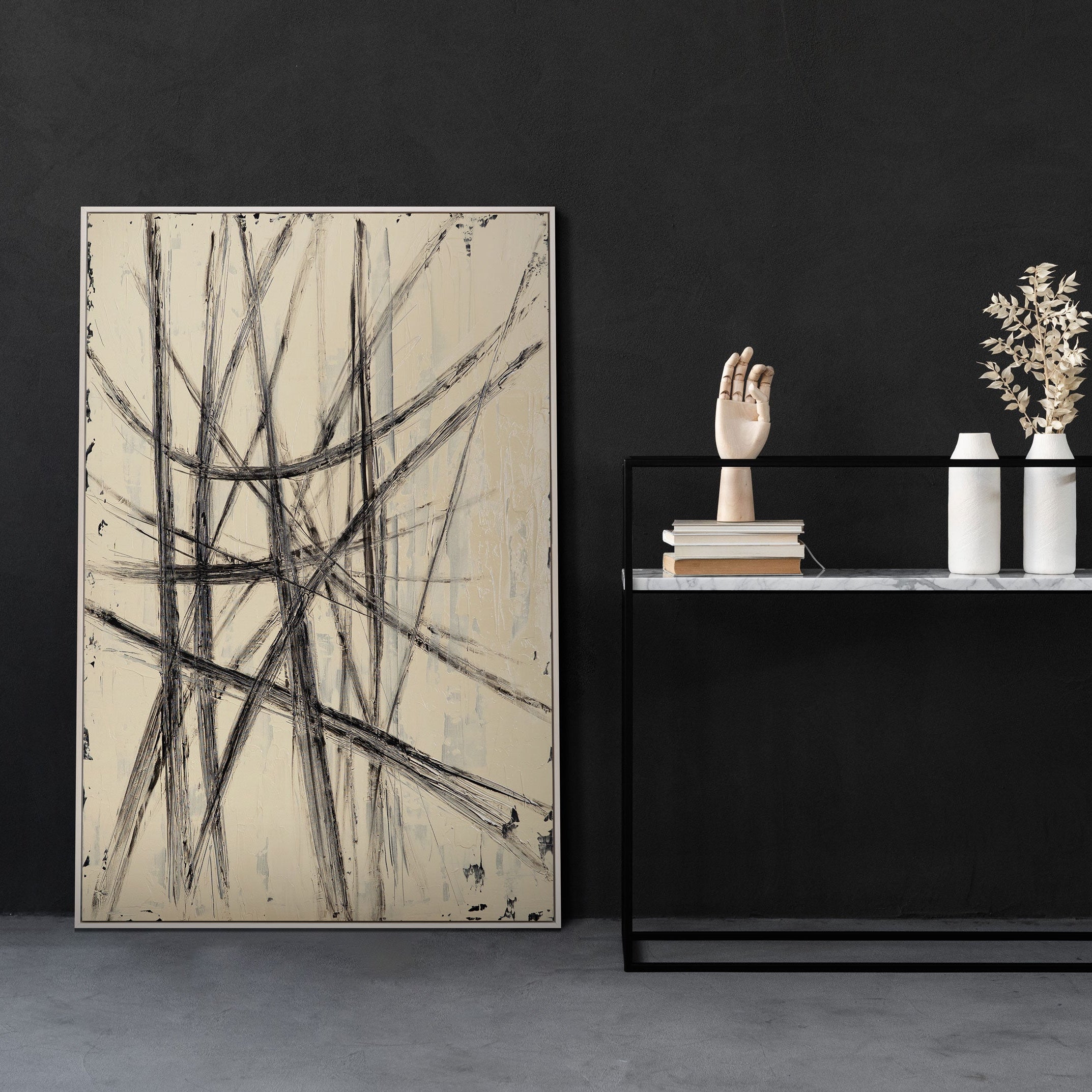 «Paralelos e Intersecciones» aúna movimiento y estructura en una sola expresión. Líneas negras se entrecruzan sobre la suave superficie beige, creando ritmo, energía y profundidad visual. La interacción de contrastes y texturas transmite tensión y equilibrio, una imagen que dinamiza y, a la vez, ordena el espacio.