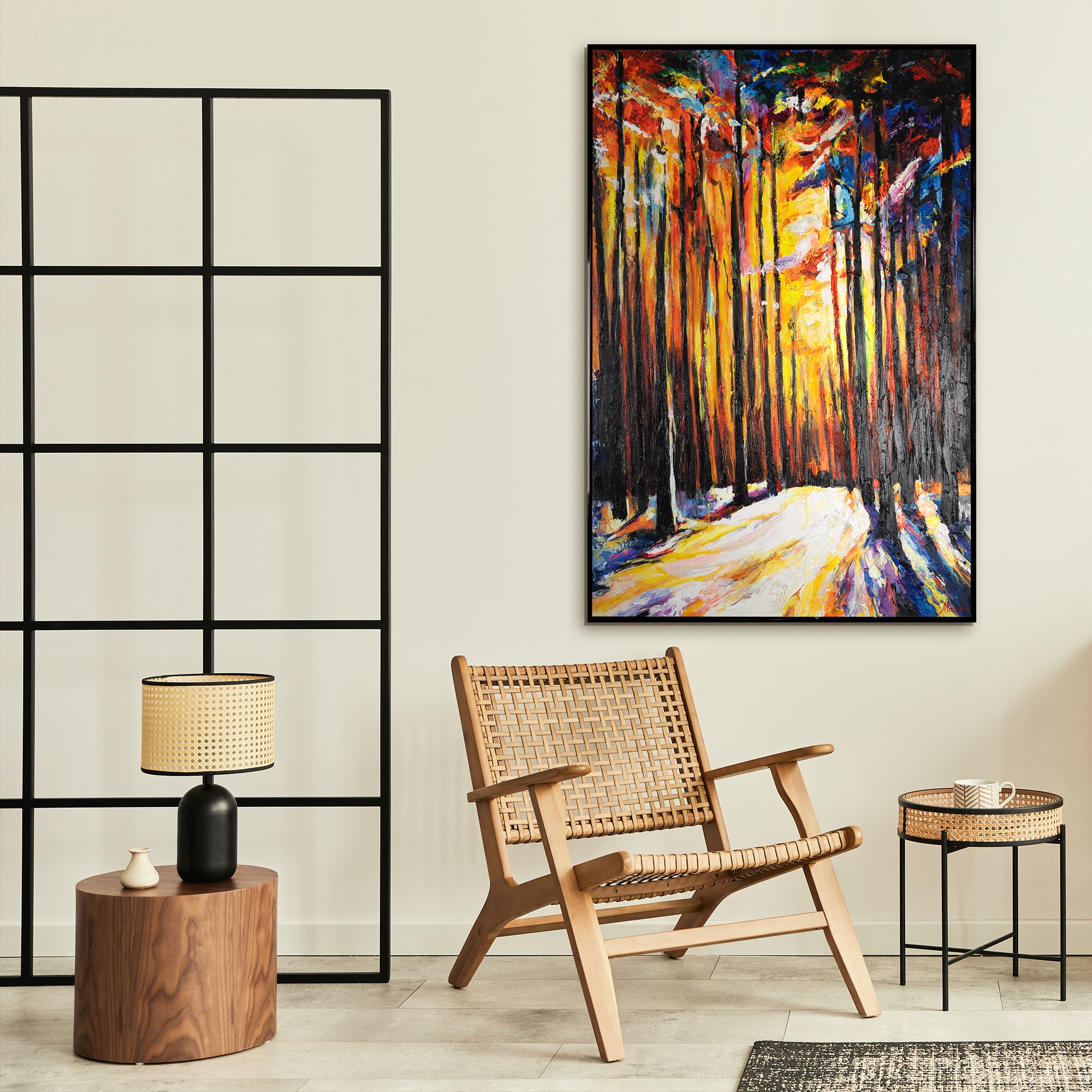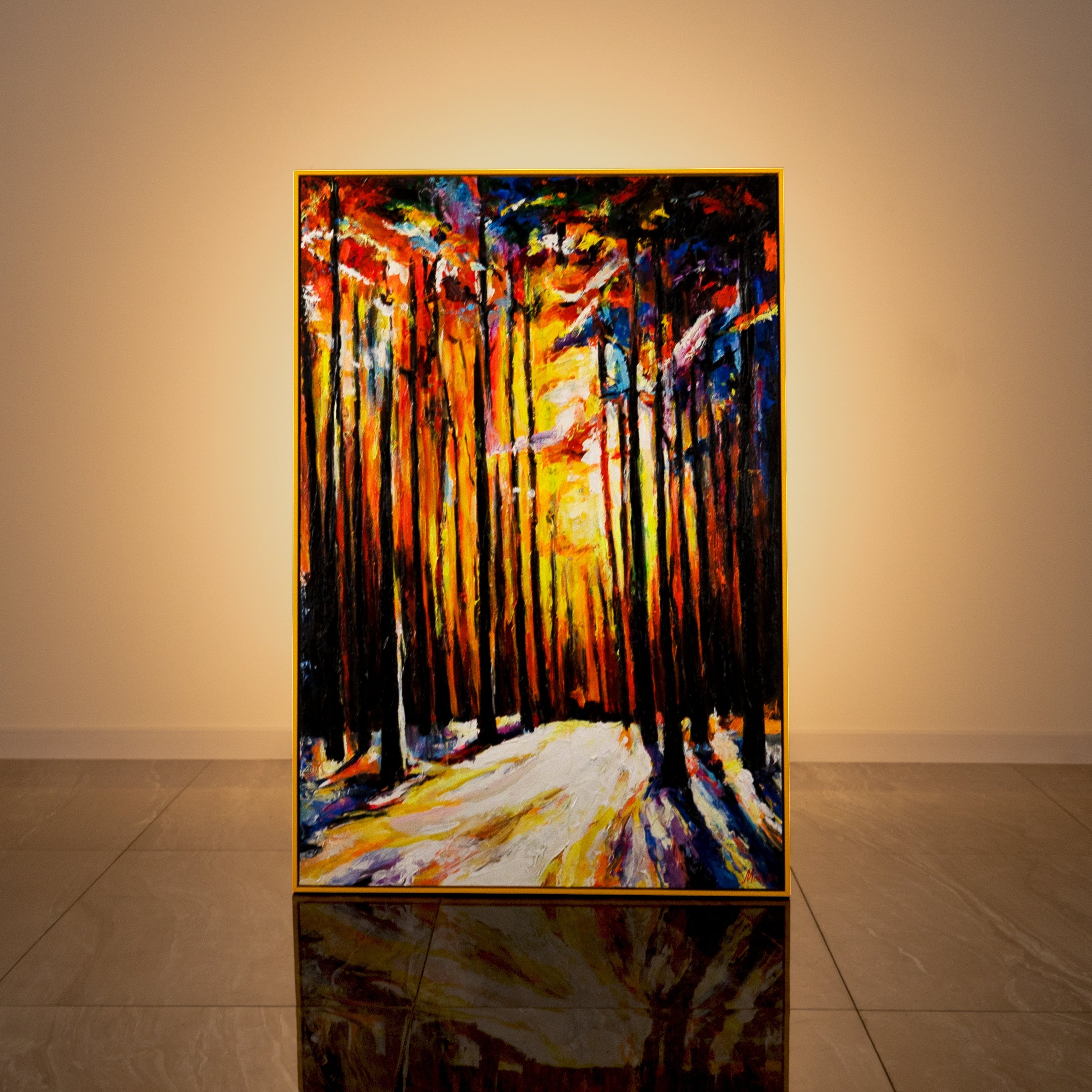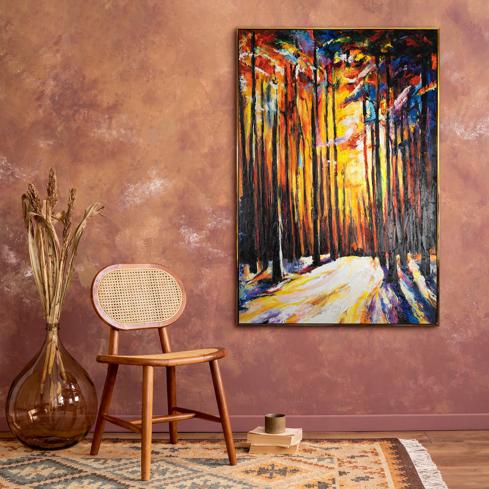 Esta impactante pintura, titulada "Sendero Forestal Inundado de Luz", aporta una atmósfera vibrante y colorida a cualquier estancia. Es una pintura acrílica pintada a mano que captura la magia del bosque en una representación abstracta.