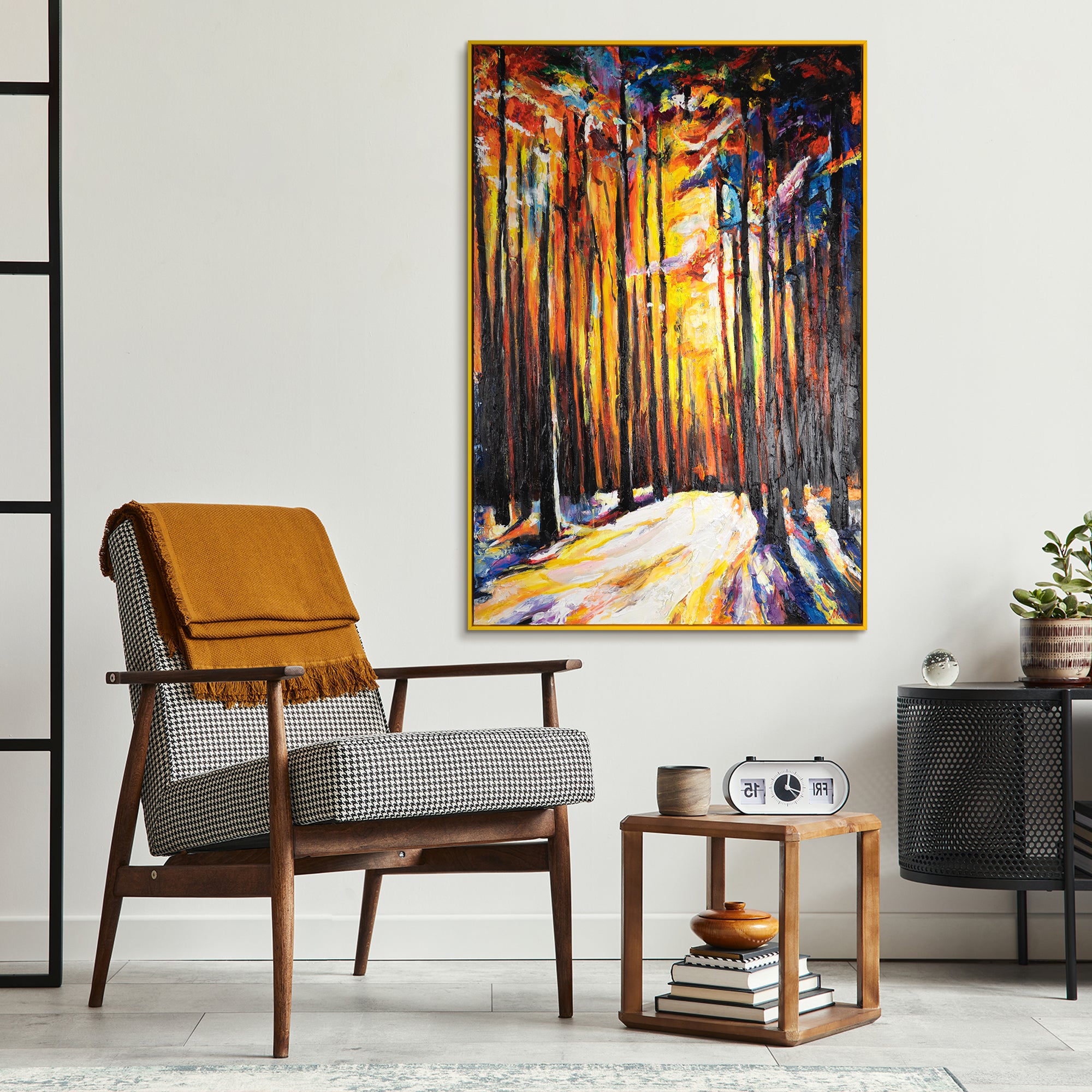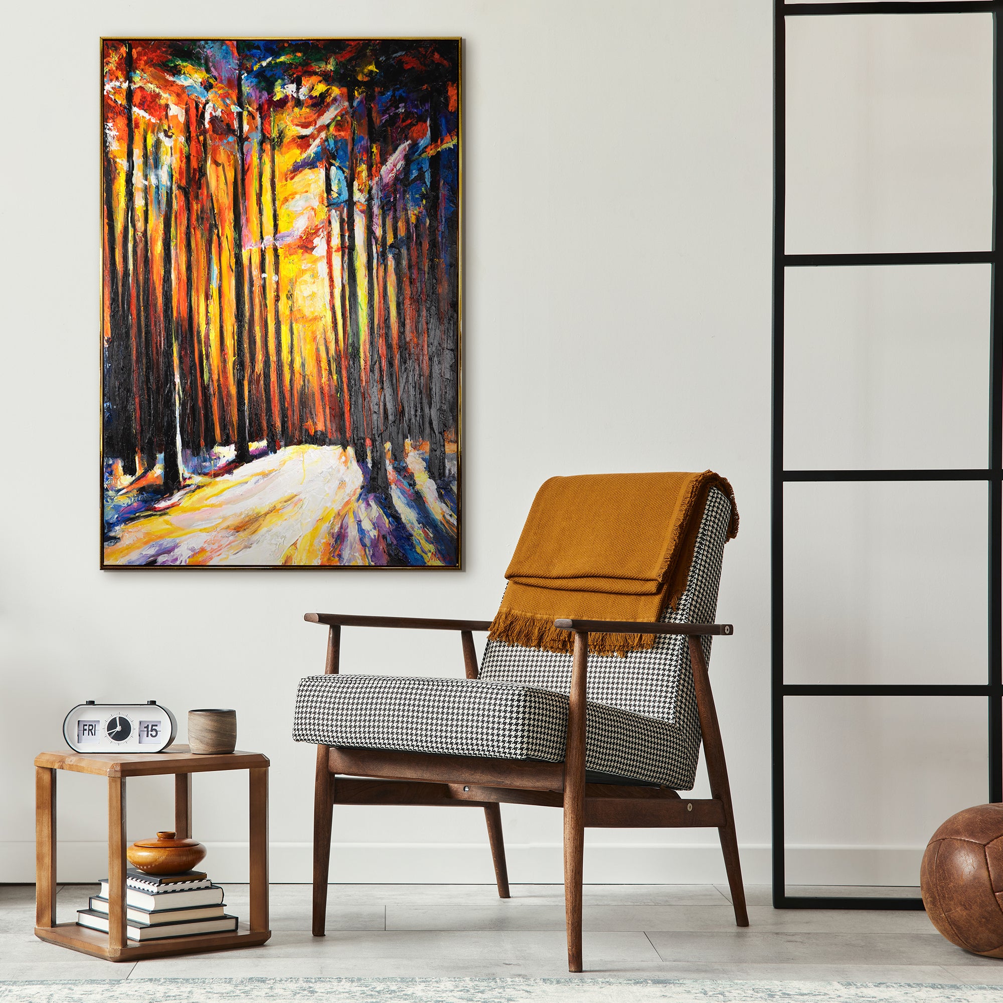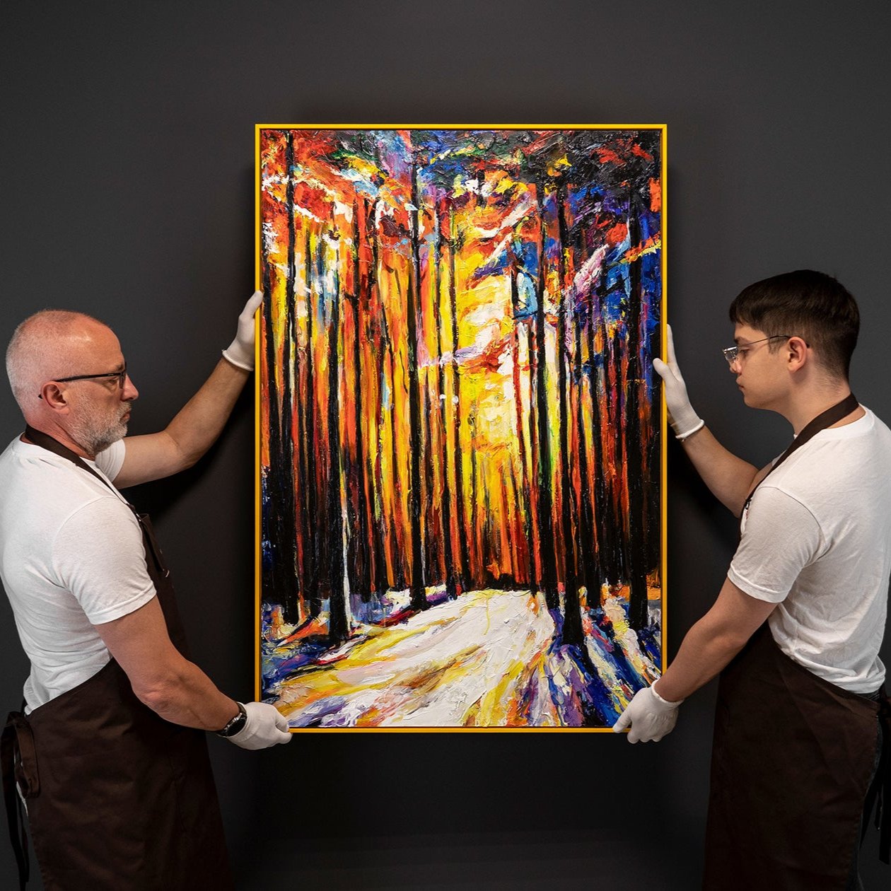 Esta impactante pintura, titulada "Sendero Forestal Inundado de Luz", aporta una atmósfera vibrante y colorida a cualquier estancia. Es una pintura acrílica pintada a mano que captura la magia del bosque en una representación abstracta.
