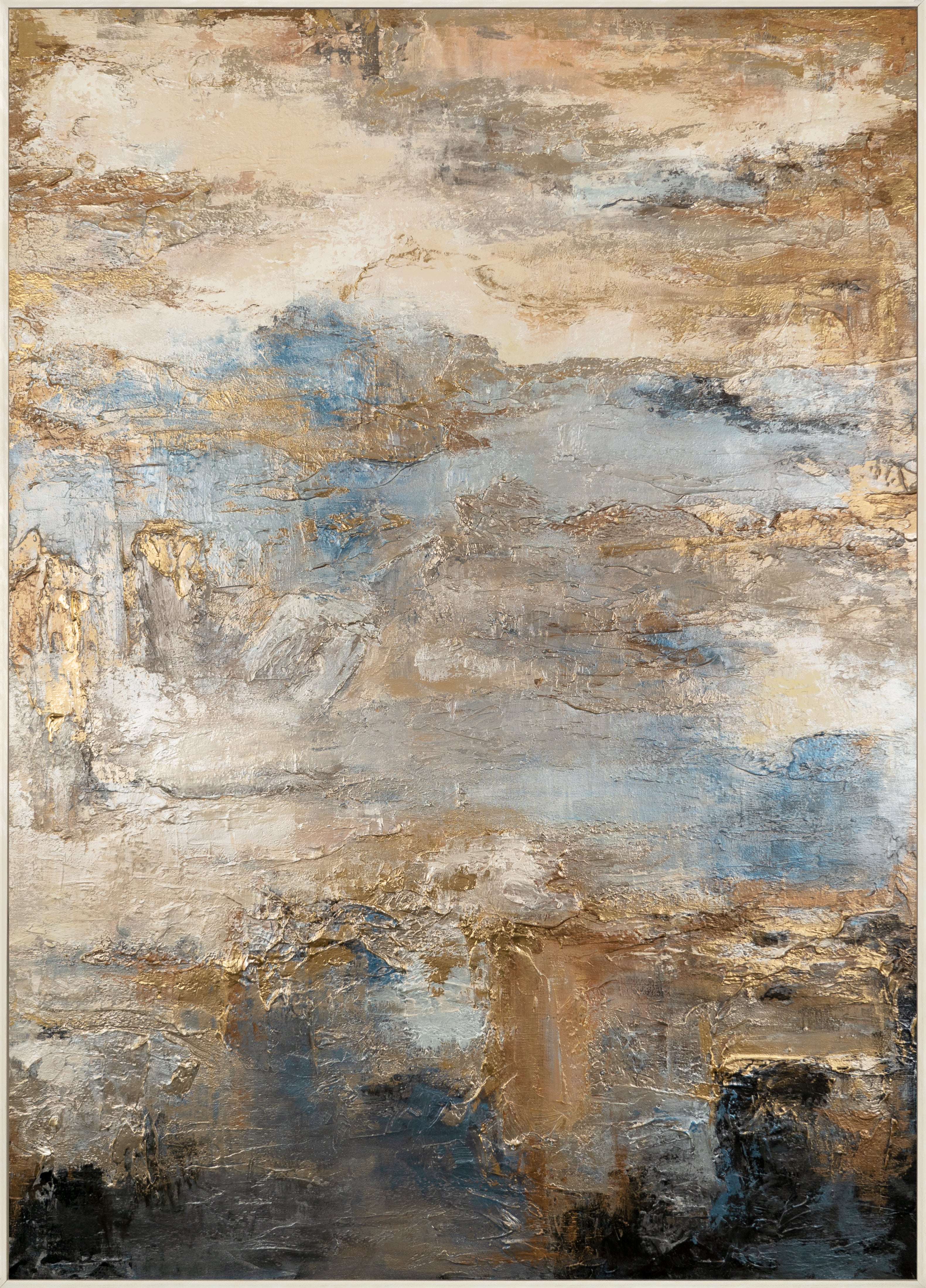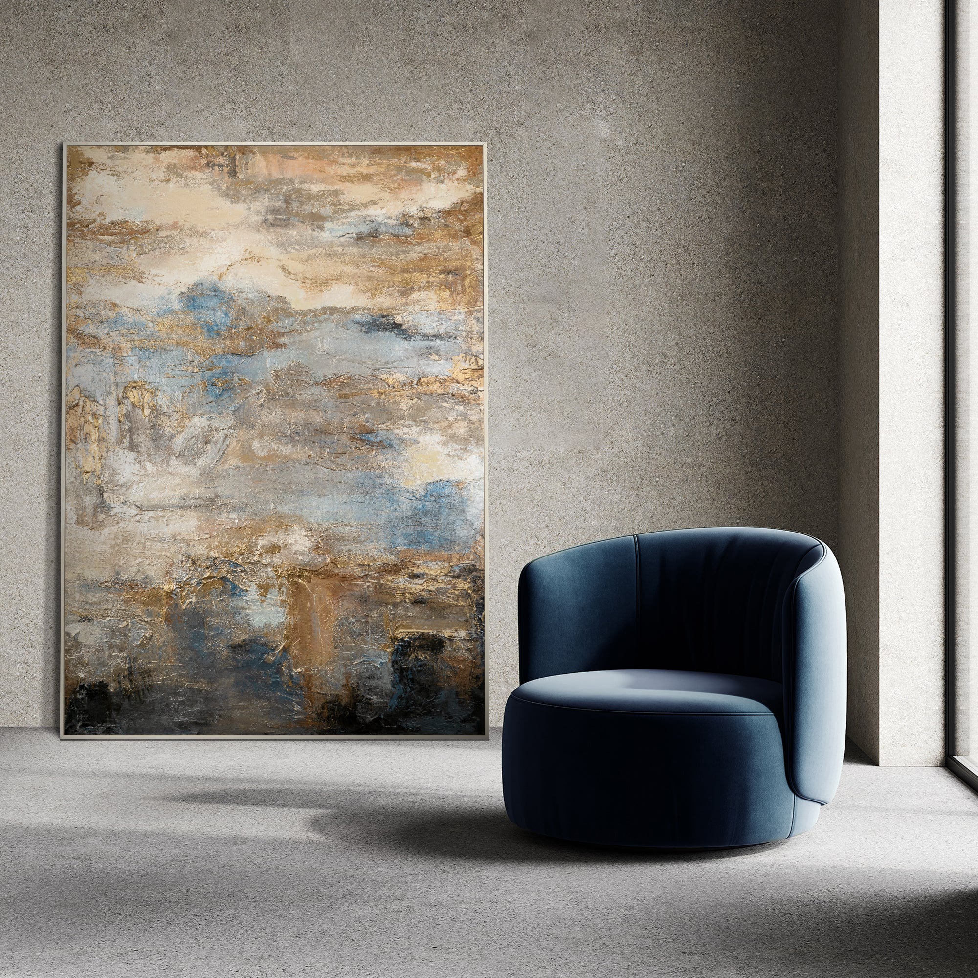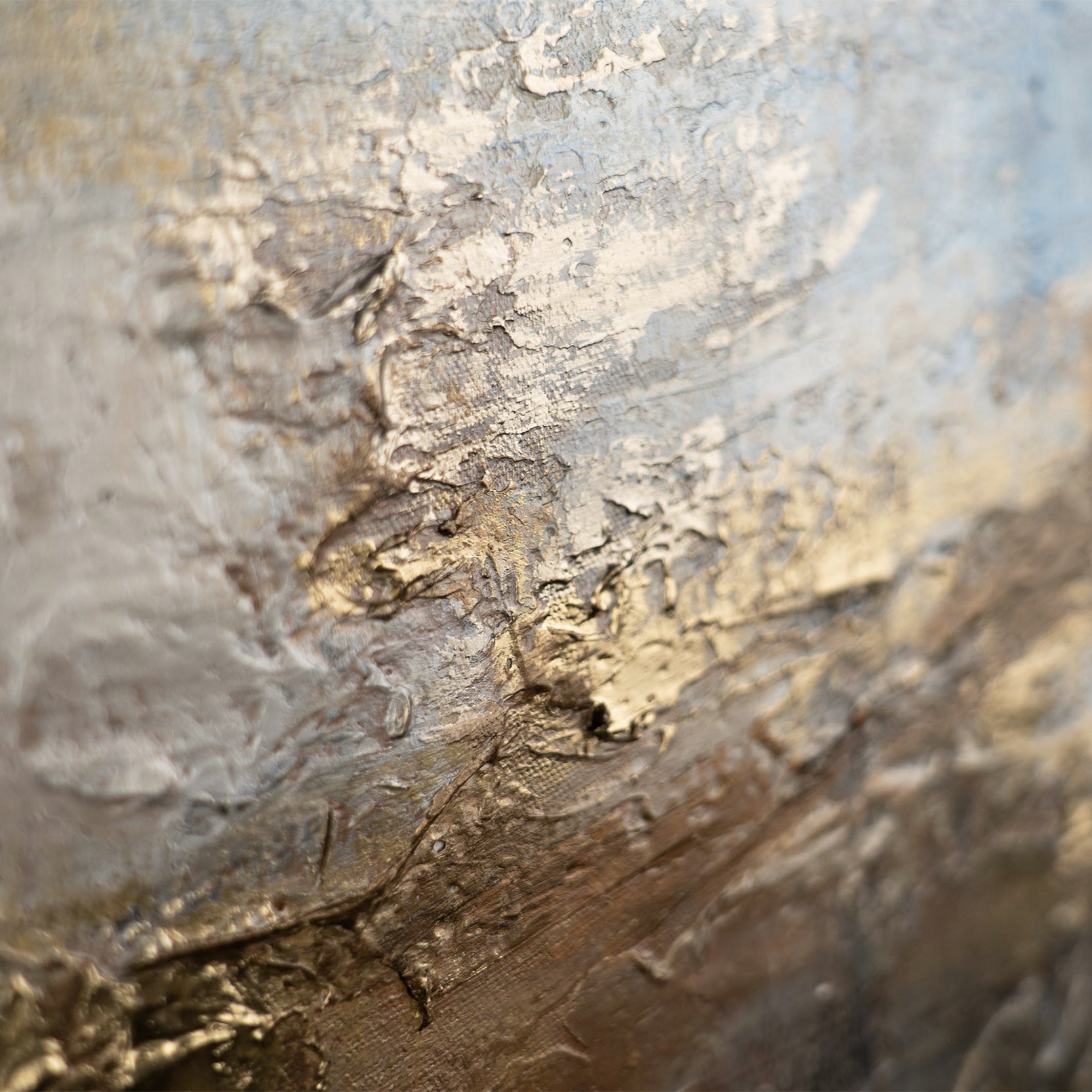 Dieses handgemalte Leinwandbild "Glanz und Eleganz" besticht durch seine harmonische Komposition aus warmen Beigetönen, strahlendem Gold und subtilen Grau- und Blaunuancen. Die Struktur der Oberfläche verleiht dem Kunstwerk eine faszinierende Dreidimensionalität und eine lebendige Tiefenwirkung. Die goldenen Akzente setzen edle Highlights, die das Bild zu einem stilvollen Blickfang machen und eine Atmosphäre von Luxus und Wärme schaffen.
