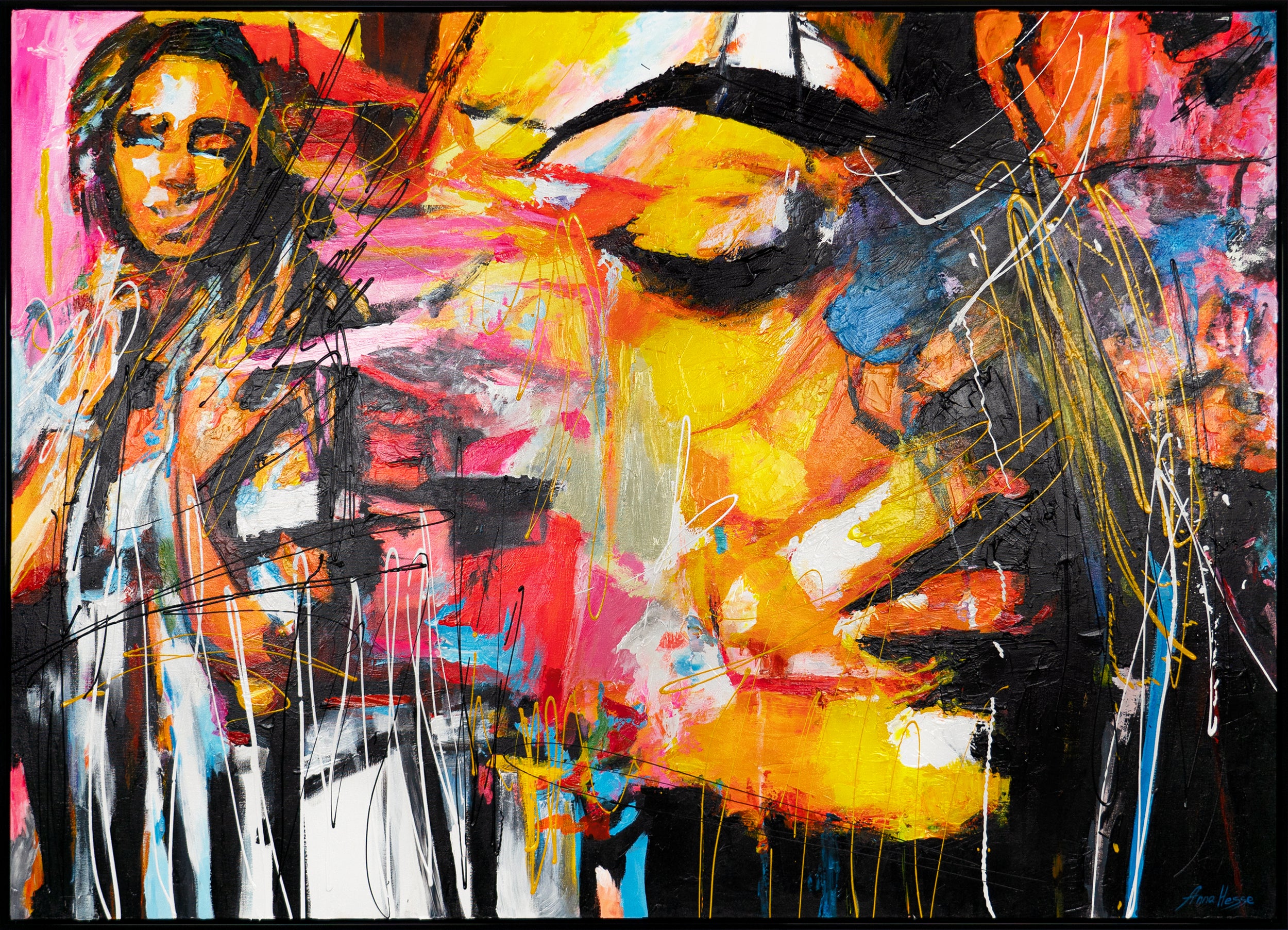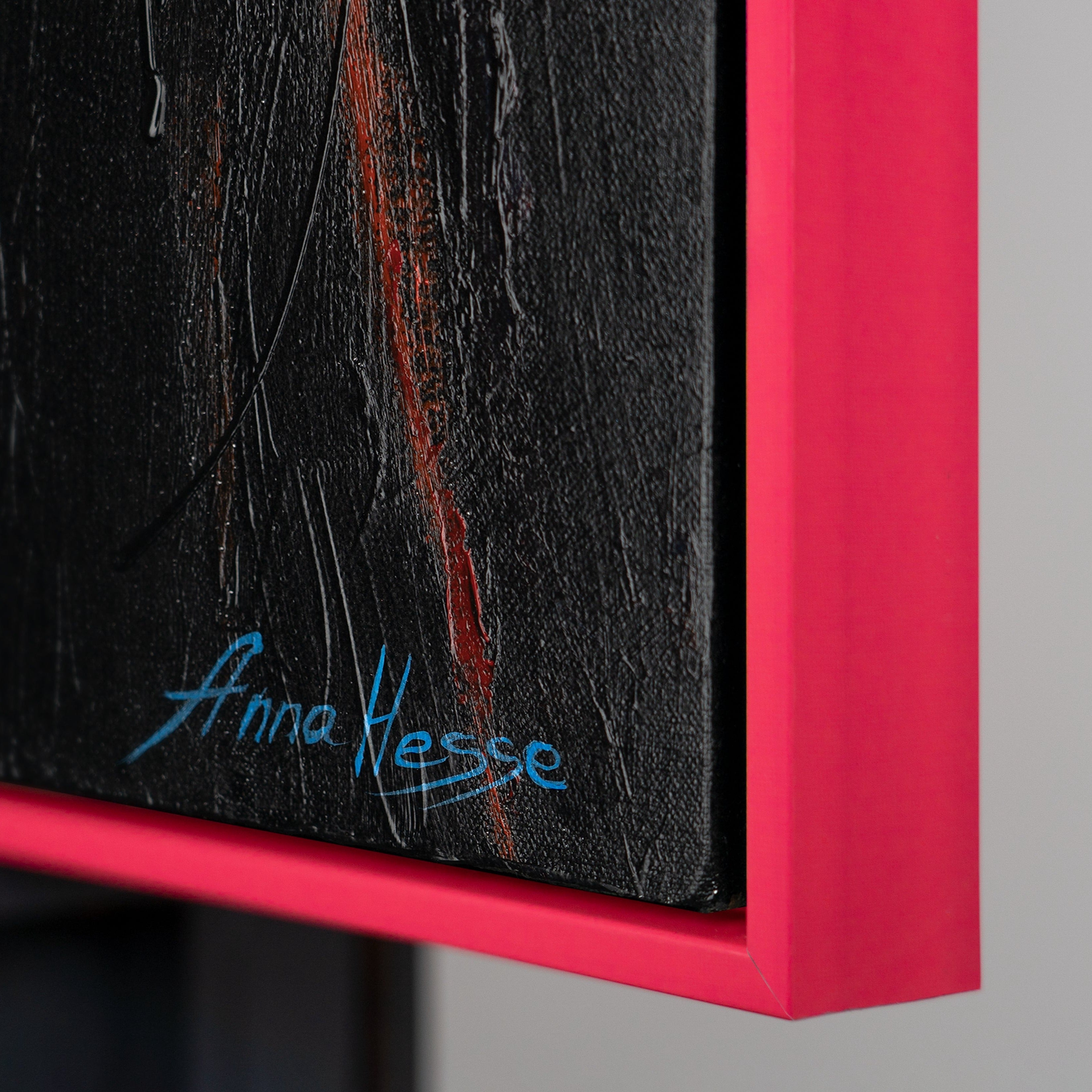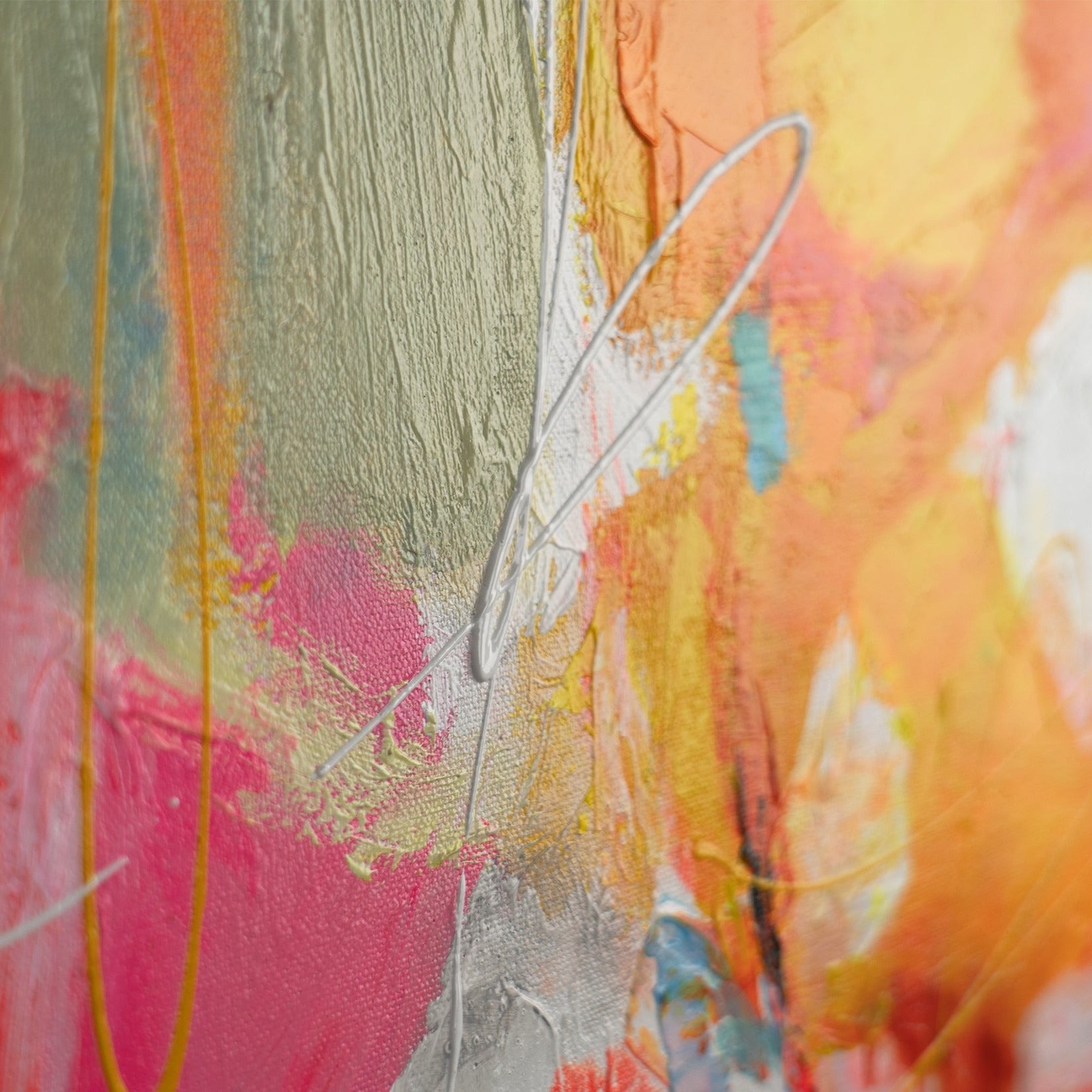 Enriquezca su hogar u oficina con esta pintura abstracta colorida, que representa una composición dinámica y moderna en tonos vibrantes de rojo, amarillo y rosa. El cuadro destaca por sus fuertes contrastes y pinceladas expresivas. Está 100% pintado a mano y realzado con un moderno marco rosa.