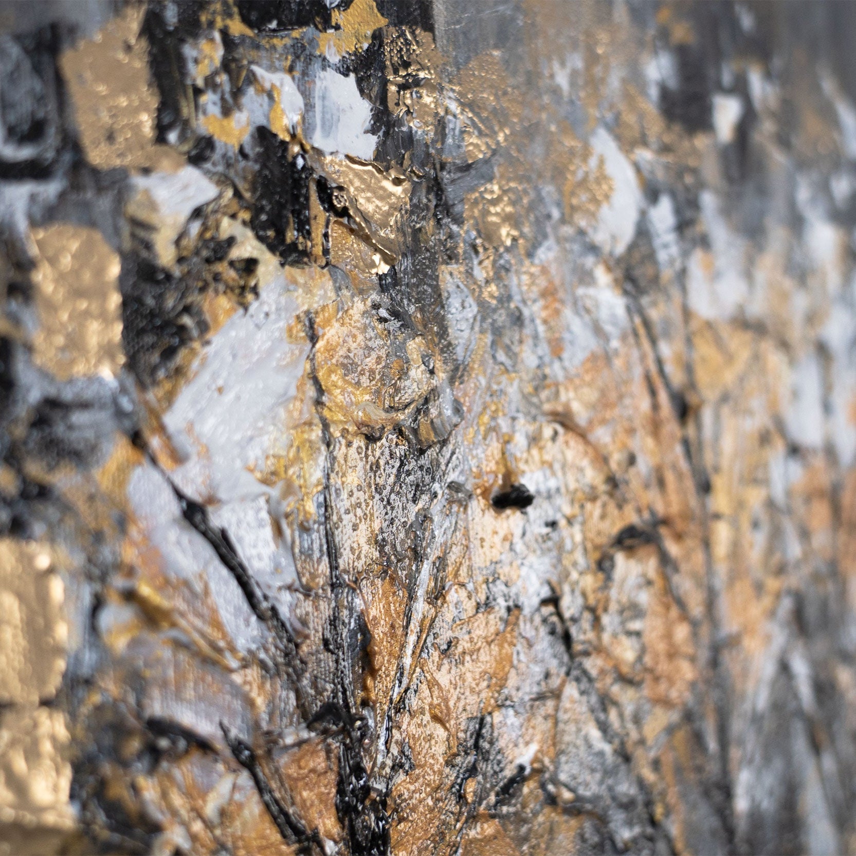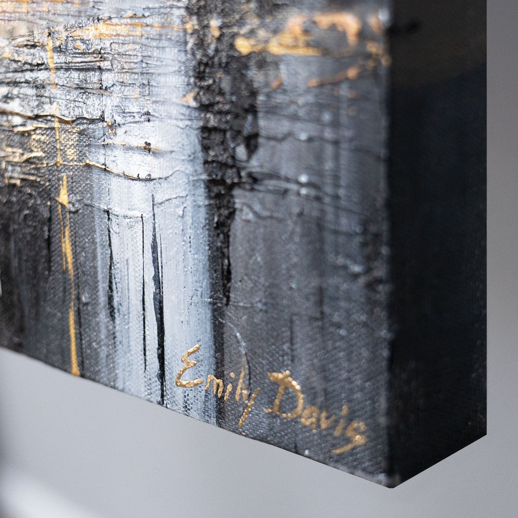 „Goldener Abend“ ist ein handgemaltes Acrylbild auf Leinwand mit abstrahierter Stadtansicht in warmen Gold‑ und Grautönen. Klare Linien und reduzierte Formen machen es zur minimalistischen Wandkunst.