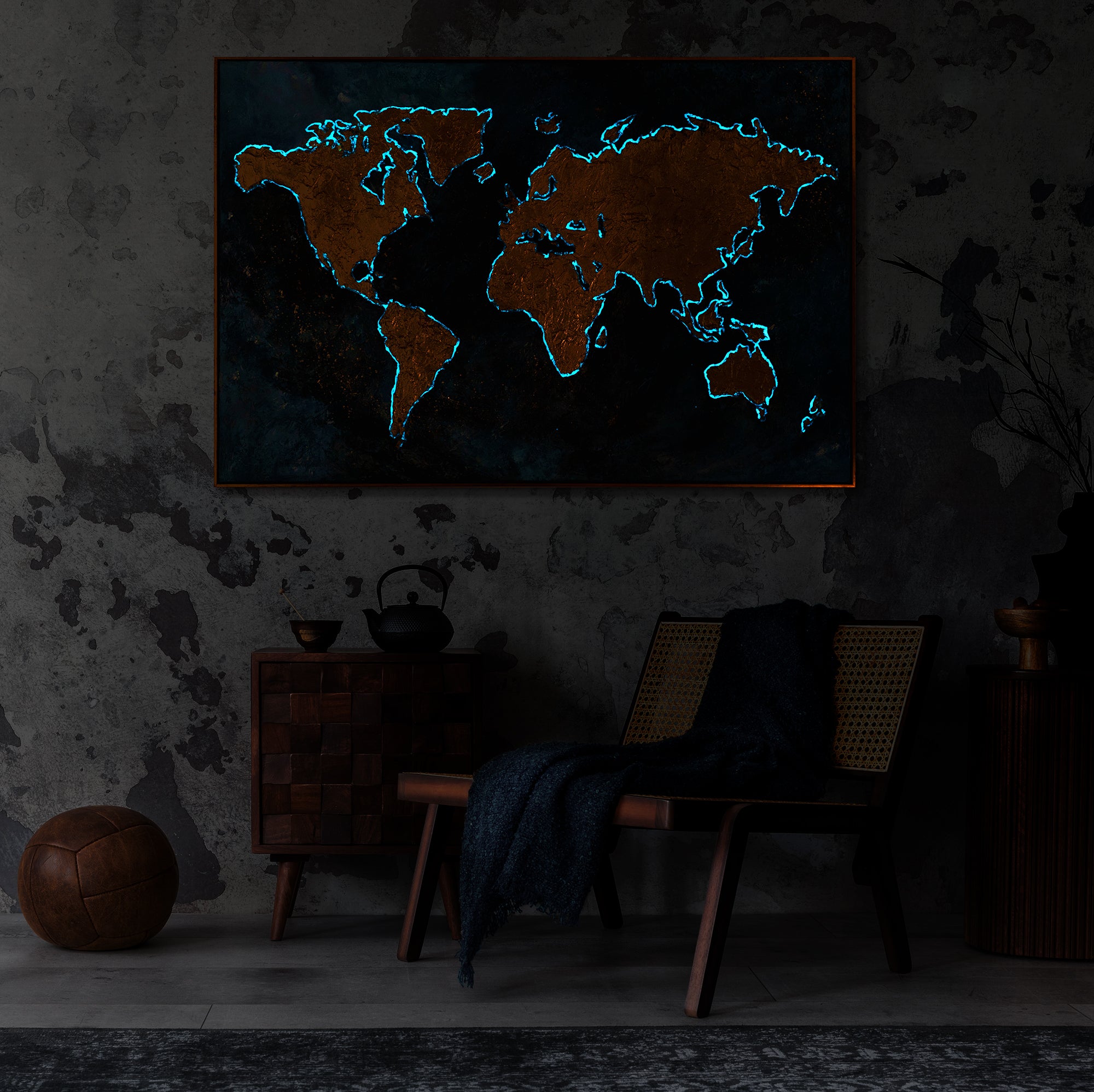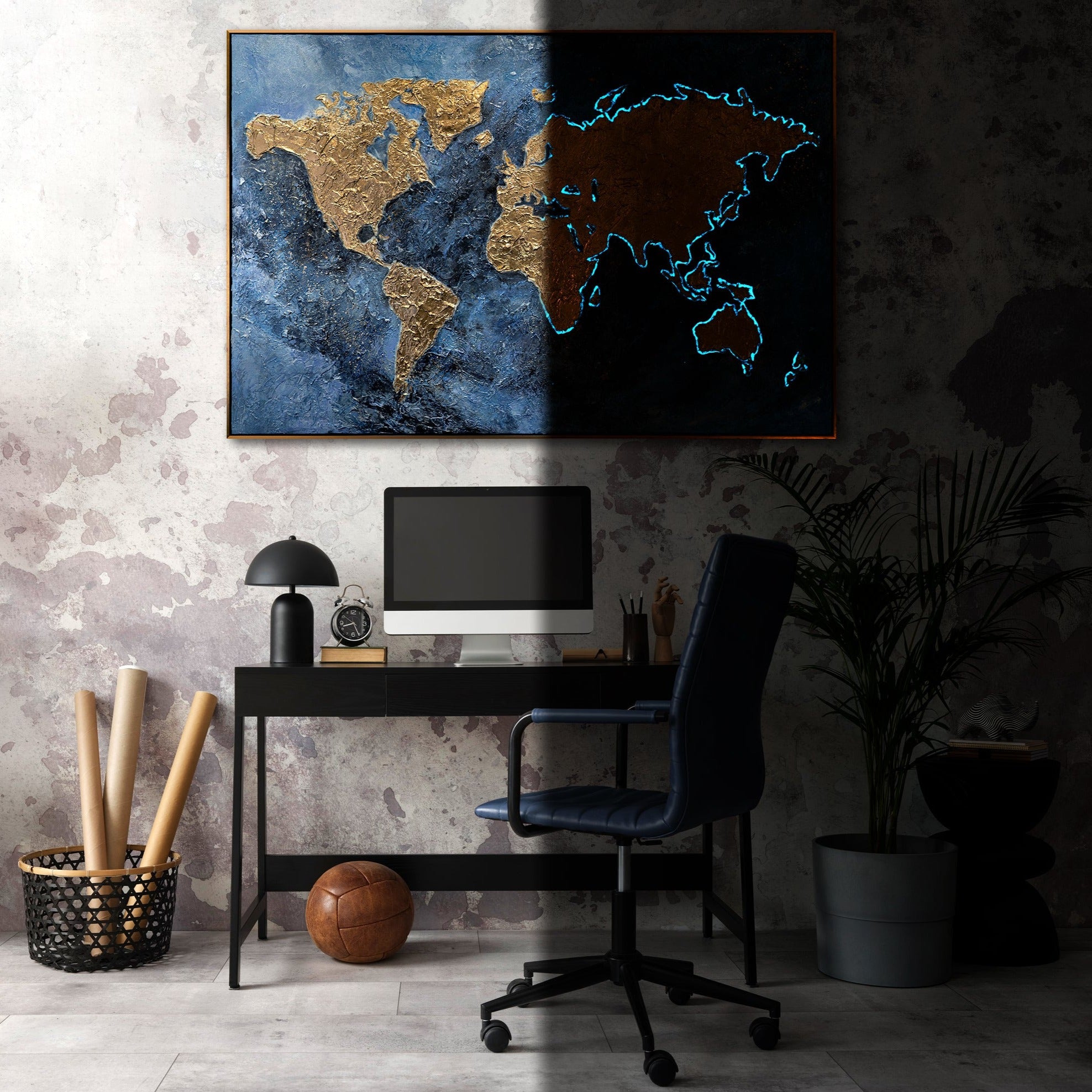 Descubra el fascinante "Mapa Mágico" - una colección de obras de arte fosforescentes. Pinturas brillantes que cautivarán sus sentidos y harán brillar su espacio. El marco es negro con detalles dorados.