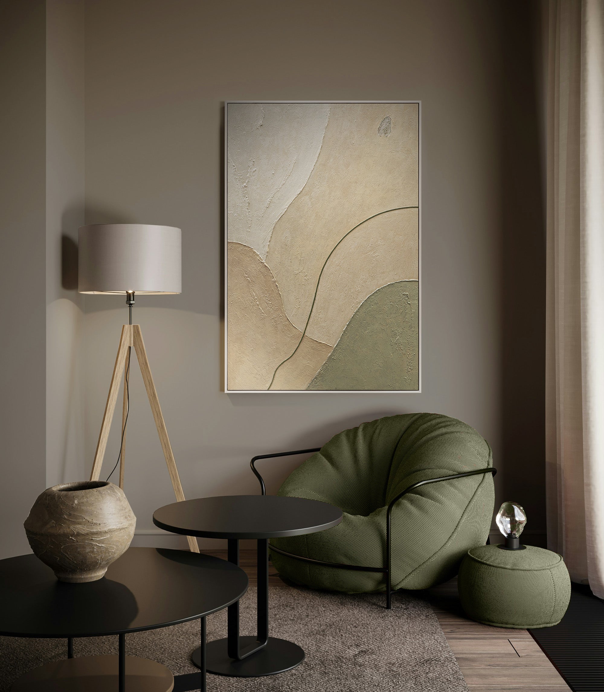 Diese handgemalte Acrylmalerei mit Struktur ist ideal für moderne, skandinavische und minimalistische Interieurs. Ihre natürliche Farbwelt in Beige, Creme und zartem Grün schafft eine warme, erdverbundene Atmosphäre. Made in Germany, mit Liebe zum Detail gefertigt, sicher verpackt und mit kostenlosem Versand – Kunst, die Gelassenheit atmet.