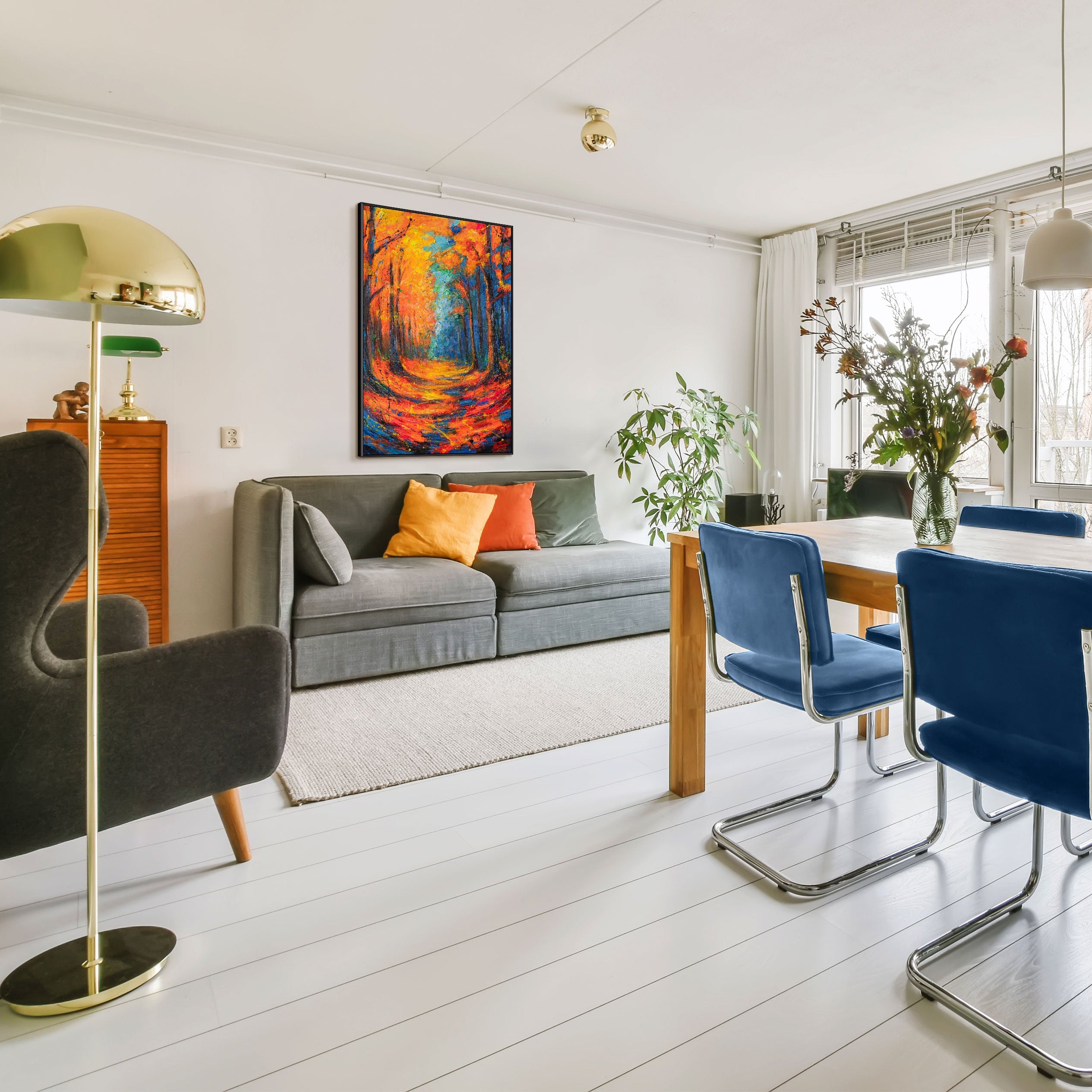 Esta pintura acrílica sobre lienzo, pintada a mano, es ideal para espacios que buscan irradiar vitalidad y calidez. Aporta profundidad a interiores modernos, clásicos o creativos. La aplicación texturizada de la pintura y la vibrante armonía de colores hacen de cada pieza una verdadera joya.