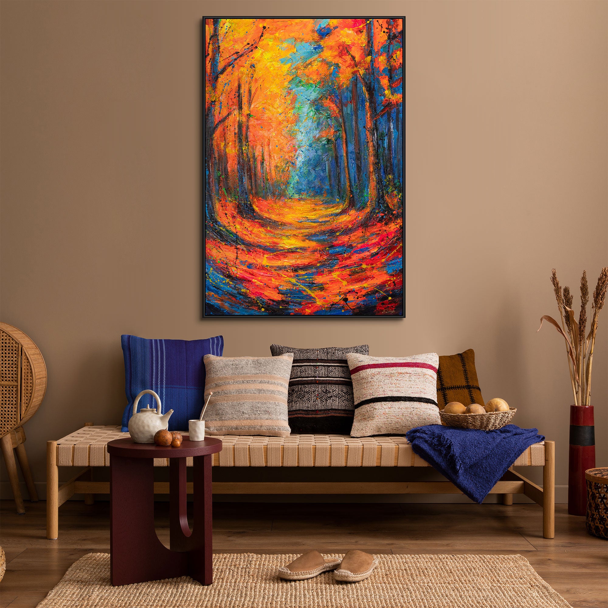 Pintura sobre lienzo pintada a mano de un sendero forestal otoñal. Colores cálidos y textura. ¡Descúbrela ahora y cómprala con envío gratuito!