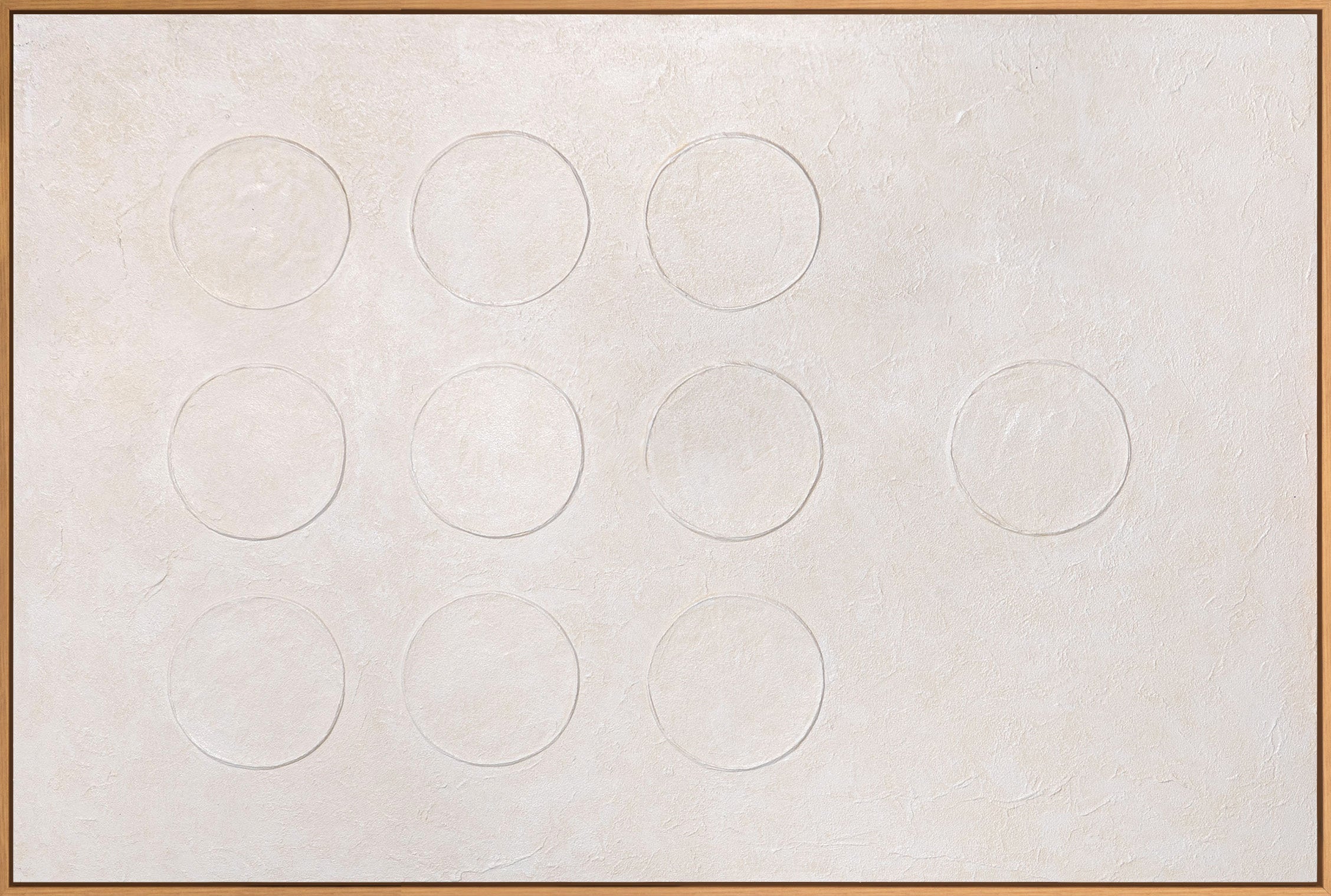 "Código Blanco" es una pintura acrílica abstracta minimalista que utiliza sutiles formas circulares, una textura fina y una paleta de blancos suaves. Los discretos relieves crean profundidad y orden sin ser visualmente dominantes.