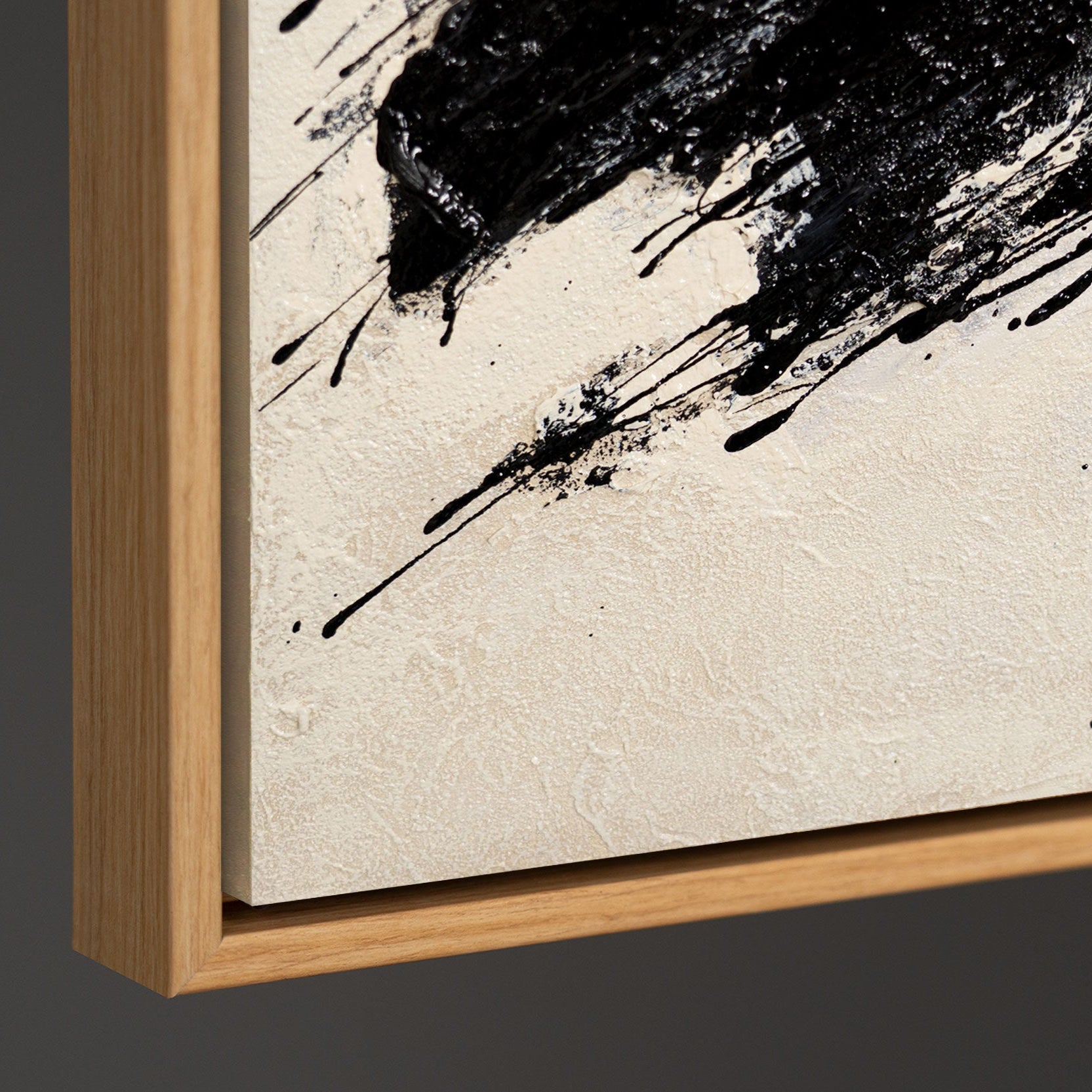 Esta pintura abstracta se caracteriza por una pincelada negra audaz que contrasta marcadamente con una superficie ligera y texturizada. La pintura acrílica se presenta espontánea y dinámica, con capas visibles y una textura vibrante que enfatiza claramente su carácter de pintura a mano.