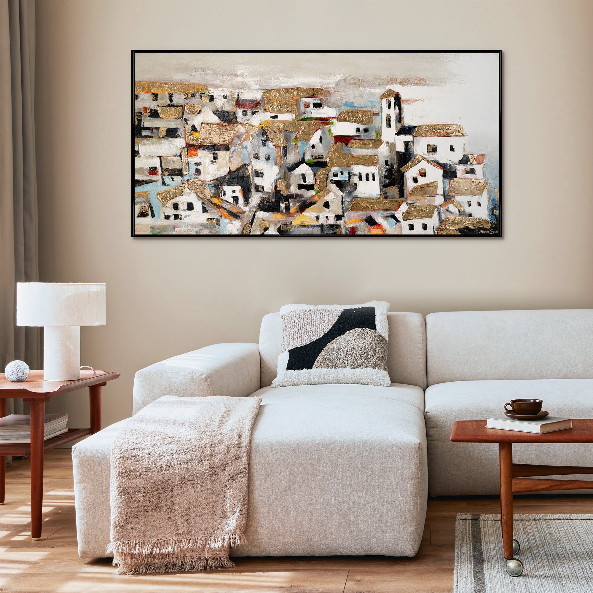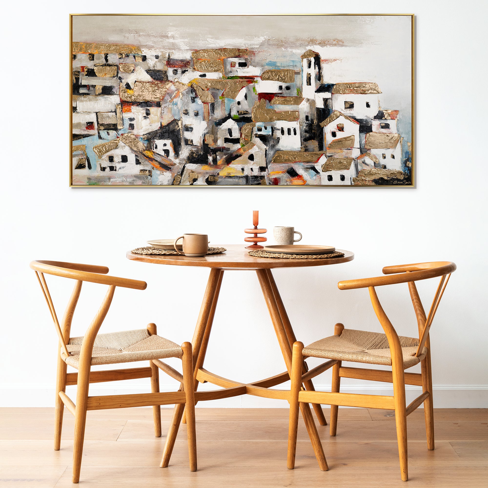 Enriquezca su hogar u oficina con esta pintura abstracta colorida, que representa un paisaje urbano pintoresco en tonos vivos. El cuadro destaca por sus colores intensos y pinceladas expresivas. Está 100% pintado a mano y realzado con un elegante marco dorado moderno.