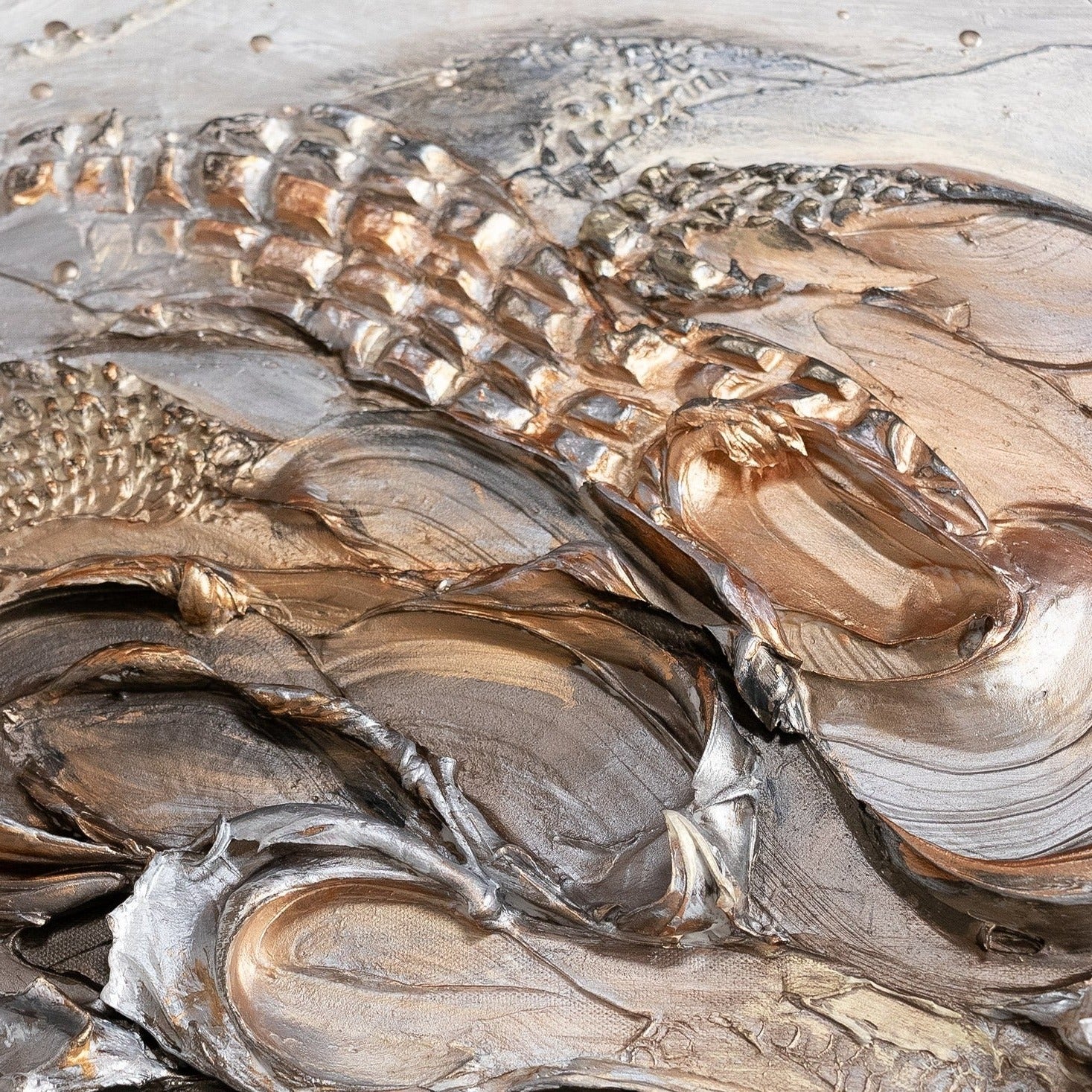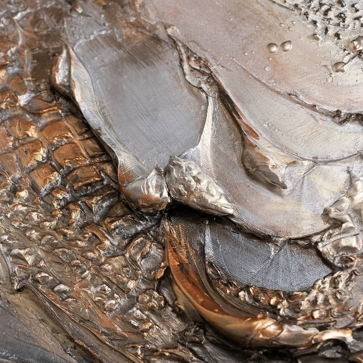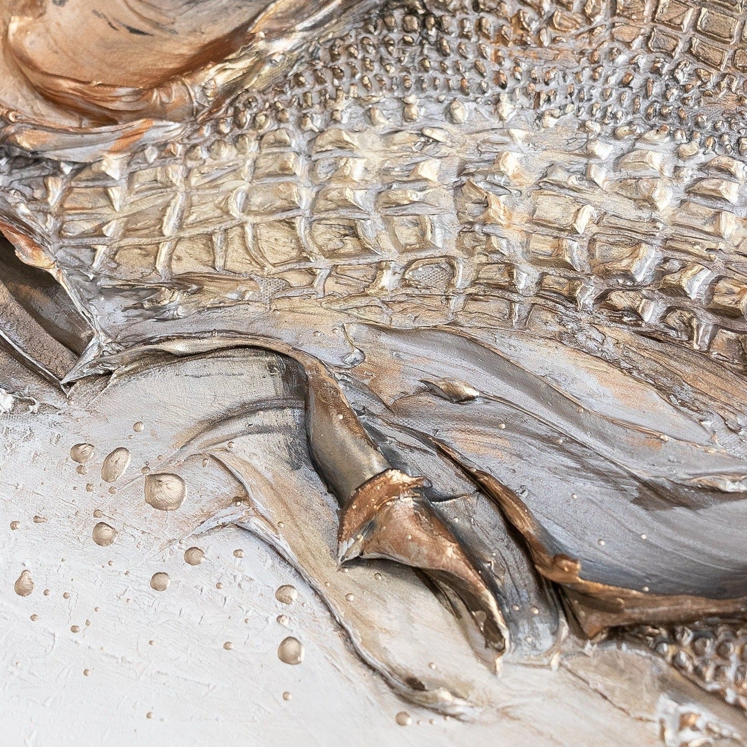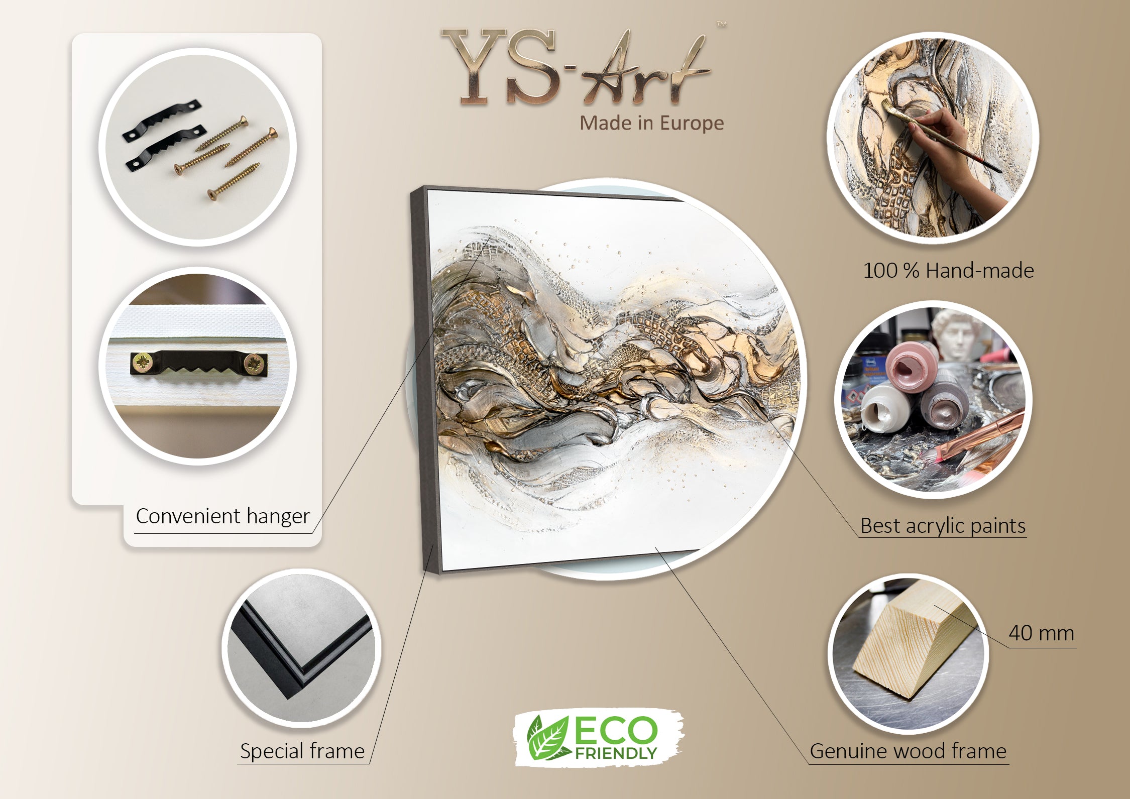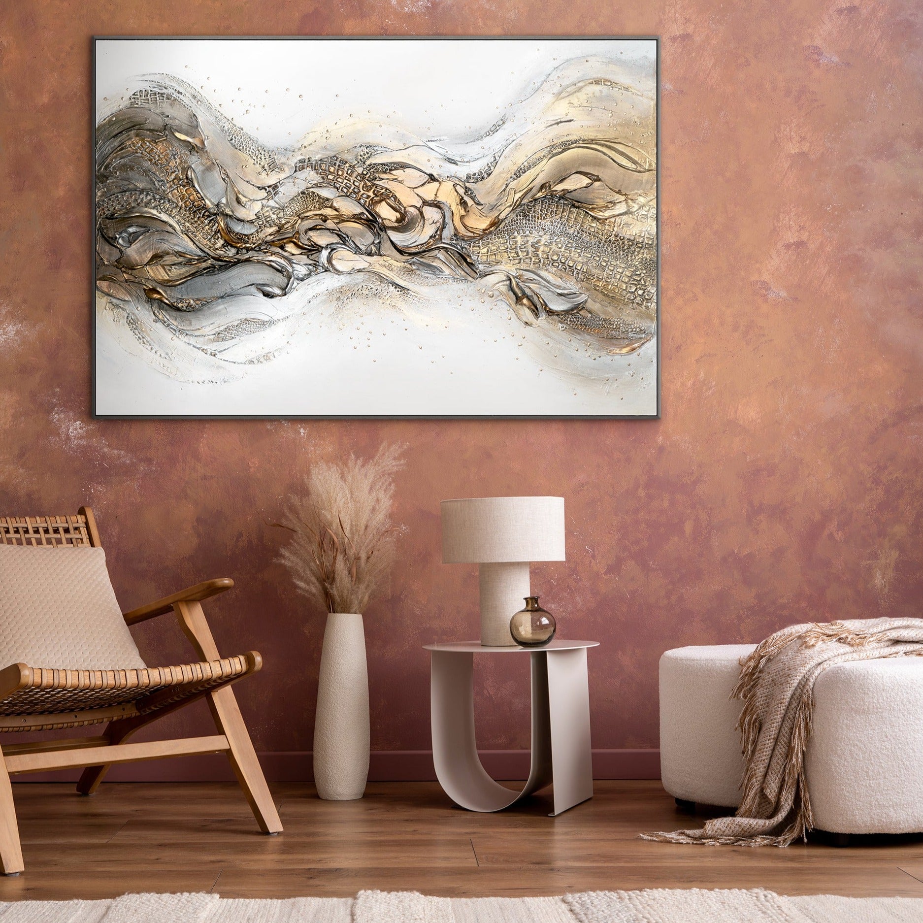 La atmósfera de abstracción en esta pintura sobre lienzo es fascinante. Diferentes texturas, pan de oro y un marco delgado le otorgan lujo y elegancia. Esta obra de arte quedará genial tanto en la sala de estar como en el dormitorio o la oficina.