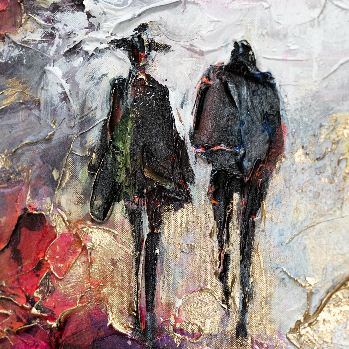 Das Gemälde „Frühlingskühle“ fängt den Moment eines frischen Frühlingsspaziergangs mit brillanten Farben und strukturierter Oberfläche ein. Dynamische Silhouetten in dunklen Tönen bewegen sich durch ein leuchtendes Feld aus Pink, Orange, Gelb und Grün. Die reliefartige Struktur verleiht dem Bild zusätzliche Tiefe und macht es zu einem eindrucksvollen Blickfang. Diese Komposition bringt Licht, Farbe und Bewegung in jeden Raum.