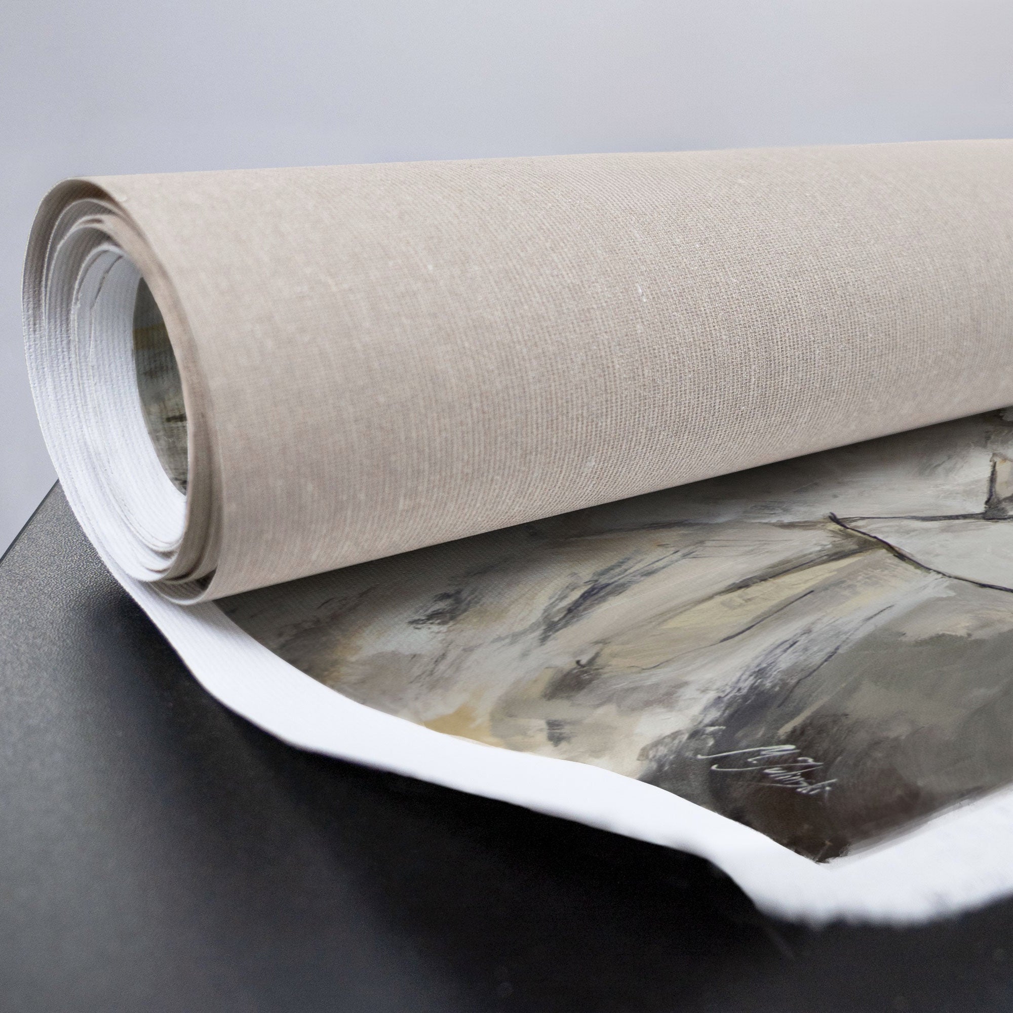 • Zusammengerollte Leinwand mit sichtbarem Bildmotiv