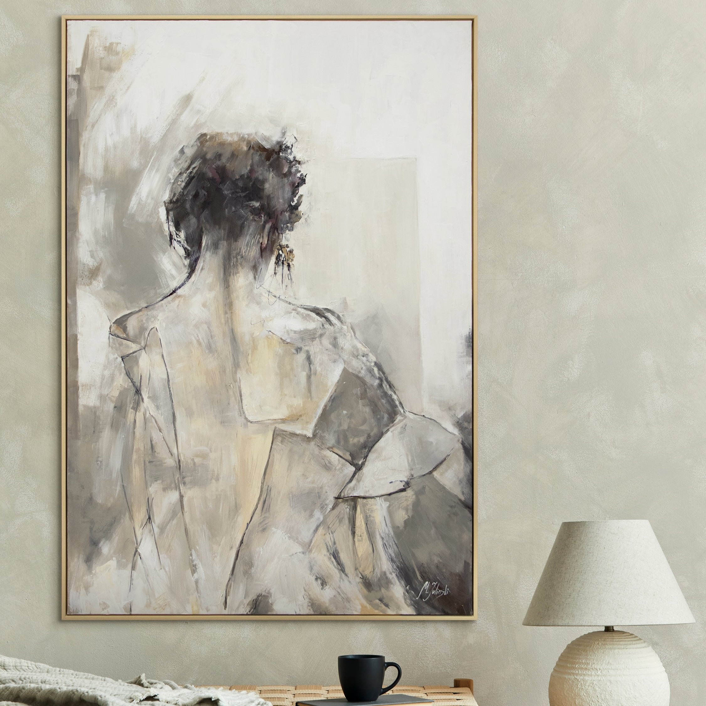 Einzigartig, zurückhaltend und ausdrucksstark – das handgemalte Gemälde „Namur“ zeigt die weibliche Figur in sanften Beige- und Grautönen. Mit sichtbarer Pinselstruktur und zarter Linienführung schafft es eine ruhige, fast meditative Atmosphäre. Der abstrahierte Blick auf die Rückseite der dargestellten Frau verleiht dem Werk Tiefe und lädt zum Nachdenken ein.