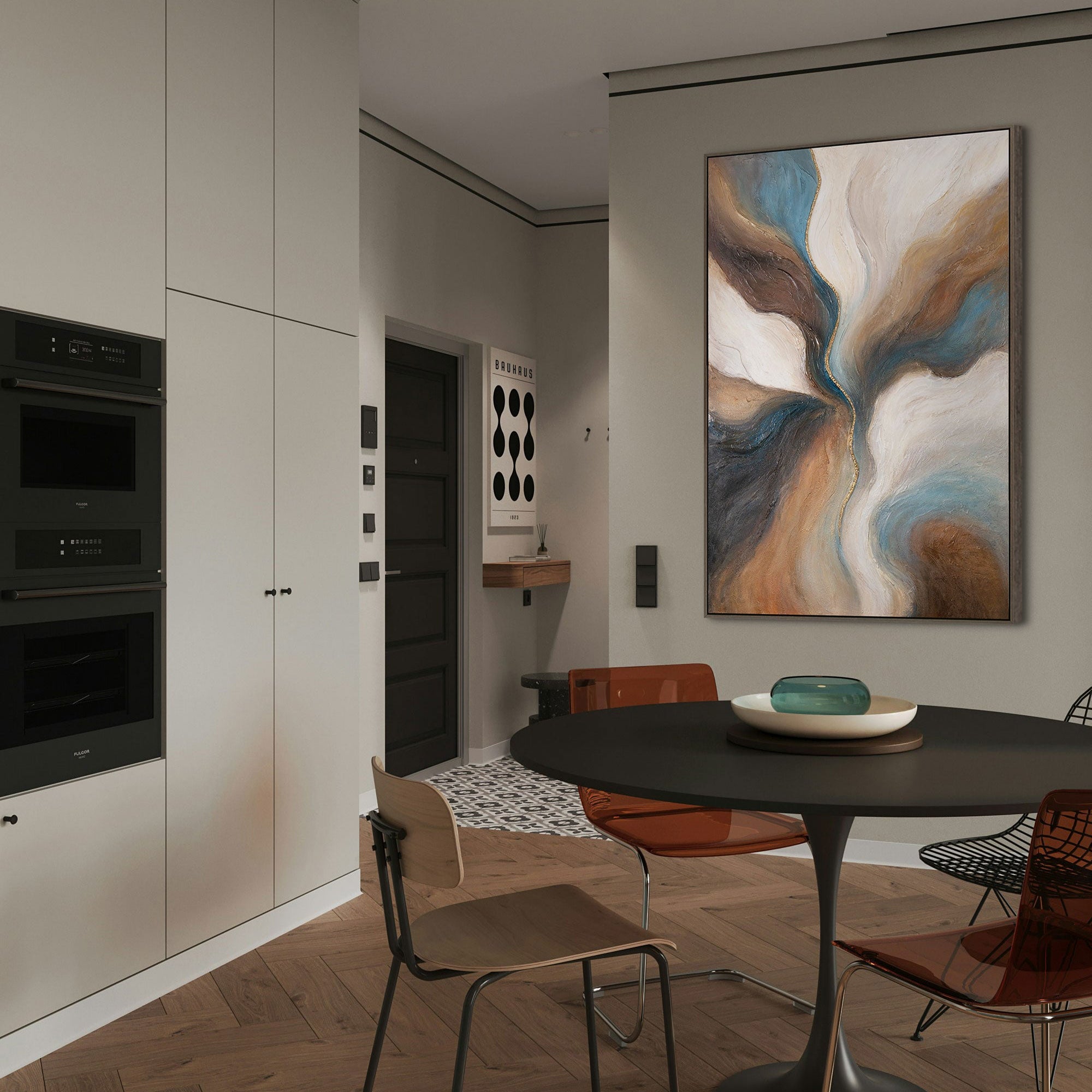 Esta obra de arte abstracto se adapta perfectamente a estilos de decoración modernos, minimalistas y elegantes. Aporta una energía especial al salón, dormitorio u oficina, creando una atmósfera de calma y, al mismo tiempo, de energía poderosa.