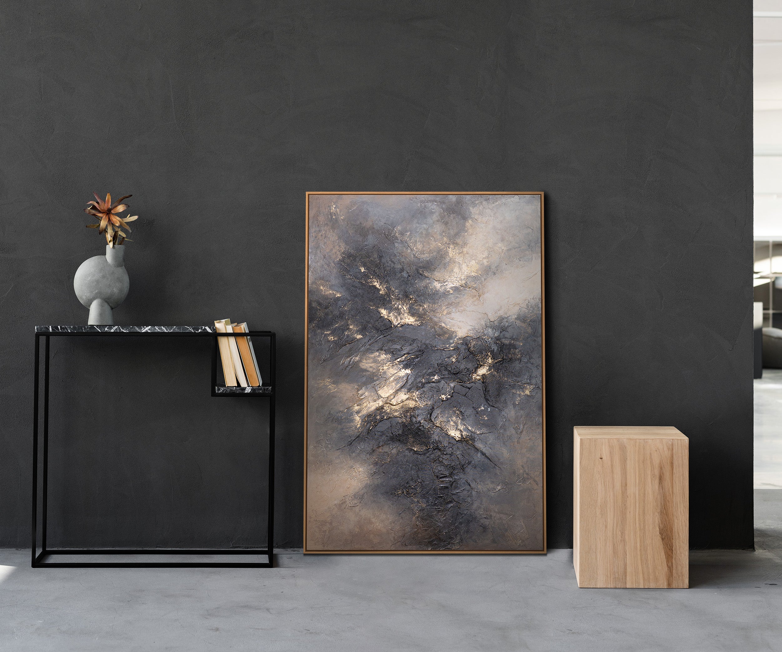 Aporta una poderosa energía a tu hogar con esta pintura acrílica pintada a mano "Brillo del Cielo". Los tonos grises oscuros se fusionan con suaves matices beige, mientras que los acentos dorados se irradian como rayos brillantes atravesando las nubes. La superficie texturizada crea una fascinante profundidad y dinamismo, haciendo que la obra sea única.