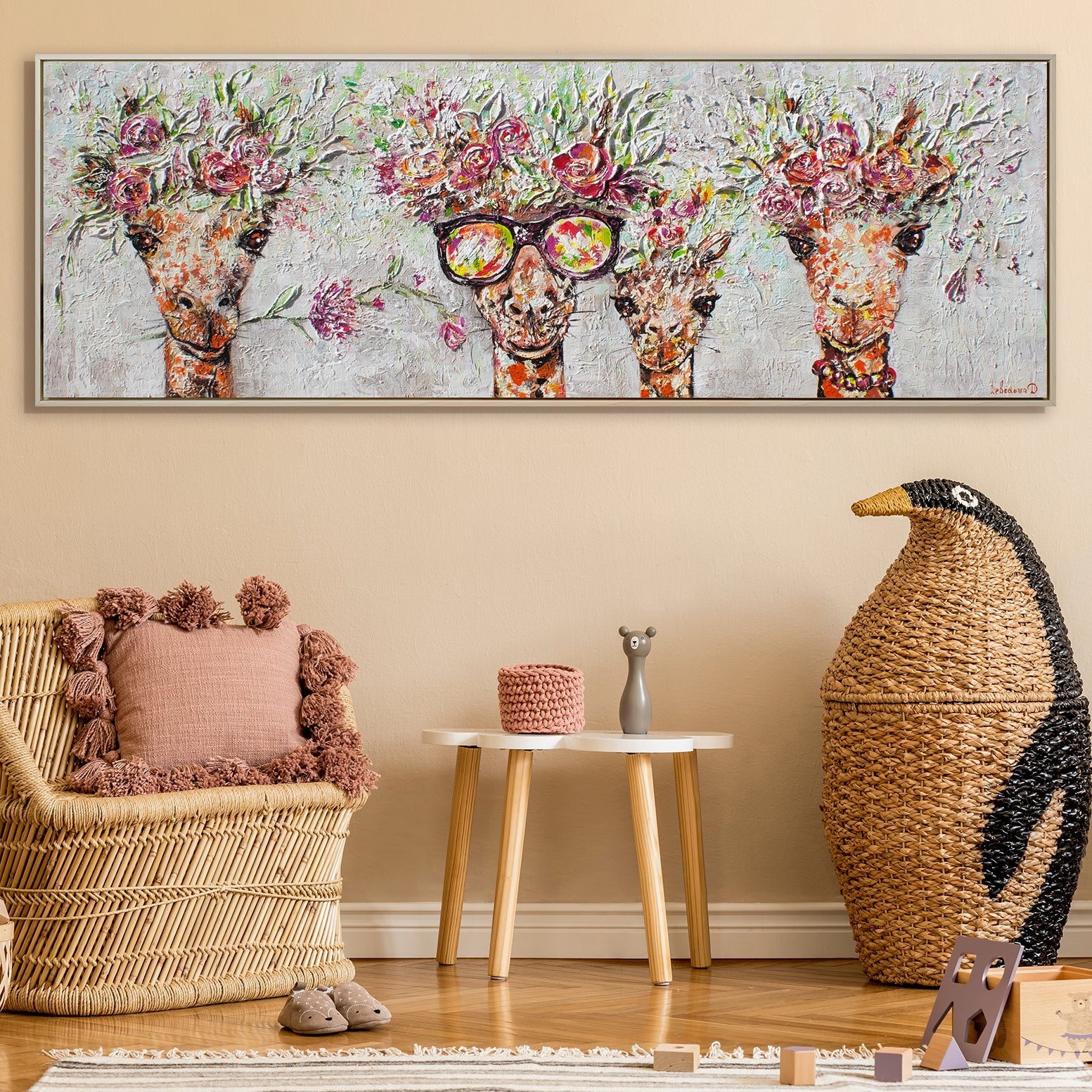 Una pintura vibrante de jirafas felices en un estilo moderno crea una atmósfera positiva en cualquier habitación. Puede colocarse tanto en el área de trabajo como en los espacios de descanso. Además, estas jirafas positivas son una excelente adición para una habitación infantil luminosa y acogedora.