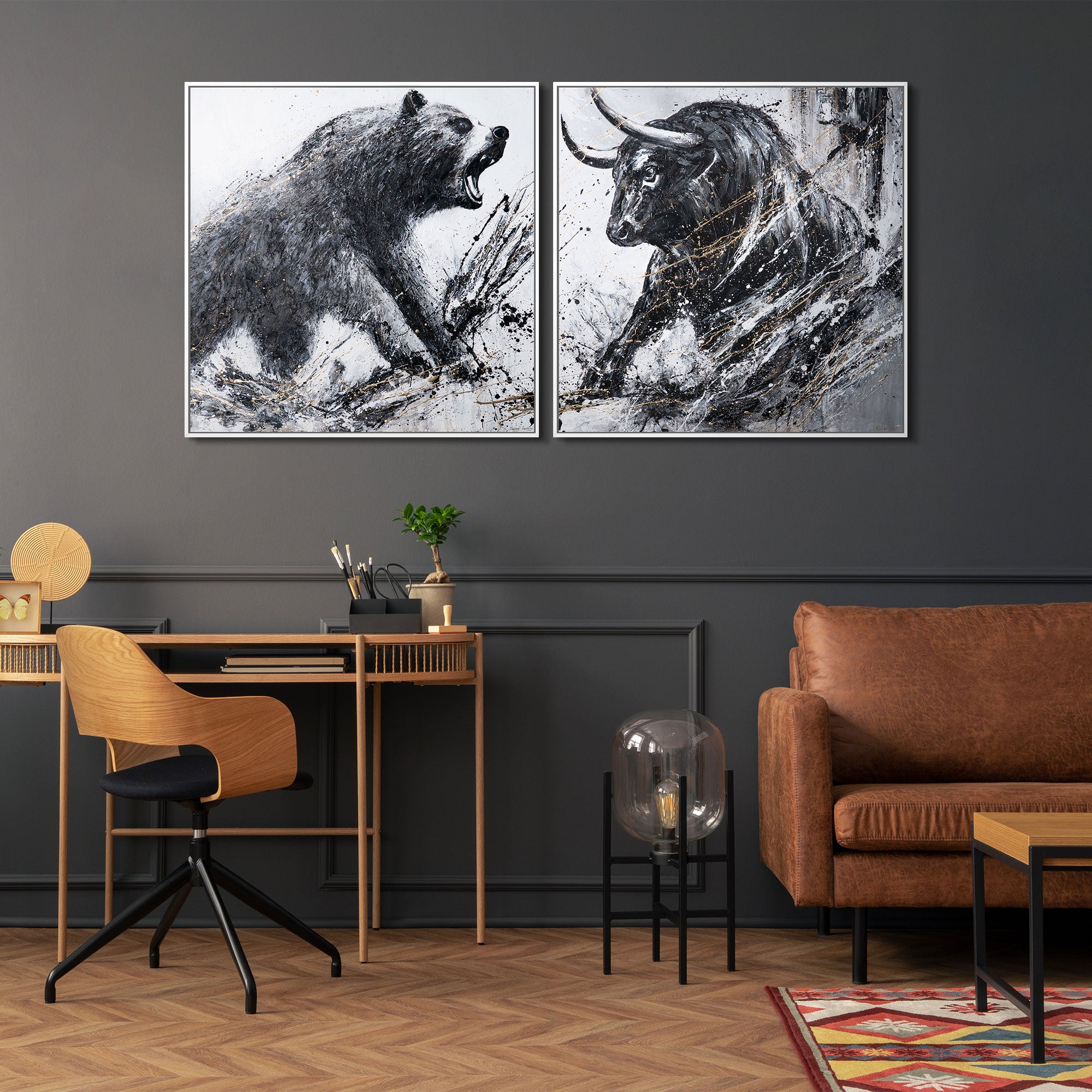 Este impactante díptico representa dos poderosos símbolos del mundo de los mercados: el oso rugiente y el toro embistiendo. Realizados en blanco y negro de alto contraste con detalles dorados, los dos lienzos reflejan no solo la energía animal, sino también contrastes emocionales como el ataque y la defensa, el control y el impulso. La textura de las pinceladas y los dinámicos toques de color aportan a los motivos una mayor tensión y expresividad.
