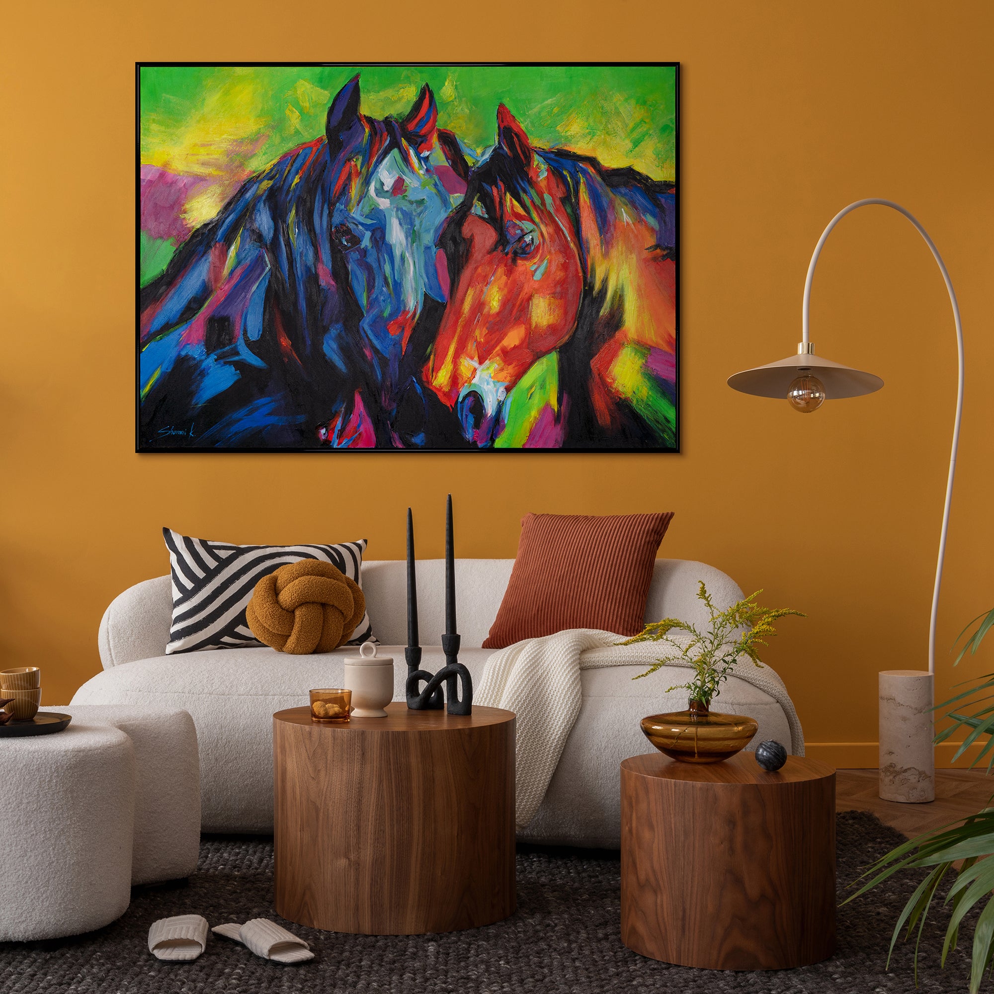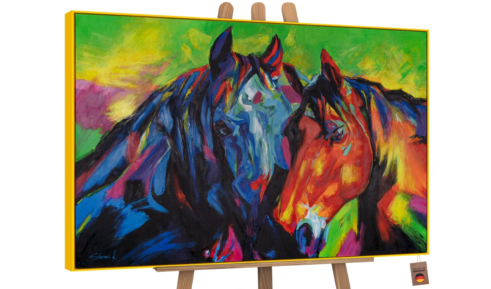 Tauchen Sie ein in eine Welt lebendiger Farben und Emotionen mit diesem handgemalten Acrylgemälde für Ihr Wohnzimmer. Die leuchtenden Blautöne treffen auf warme Rottöne und kräftiges Grün, was den beiden majestätischen Pferden eine unglaubliche Präsenz und Tiefe verleiht. Der goldene Rahmen rundet das Kunstwerk perfekt ab und fügt sich nahtlos in jeden Wohnraum ein.