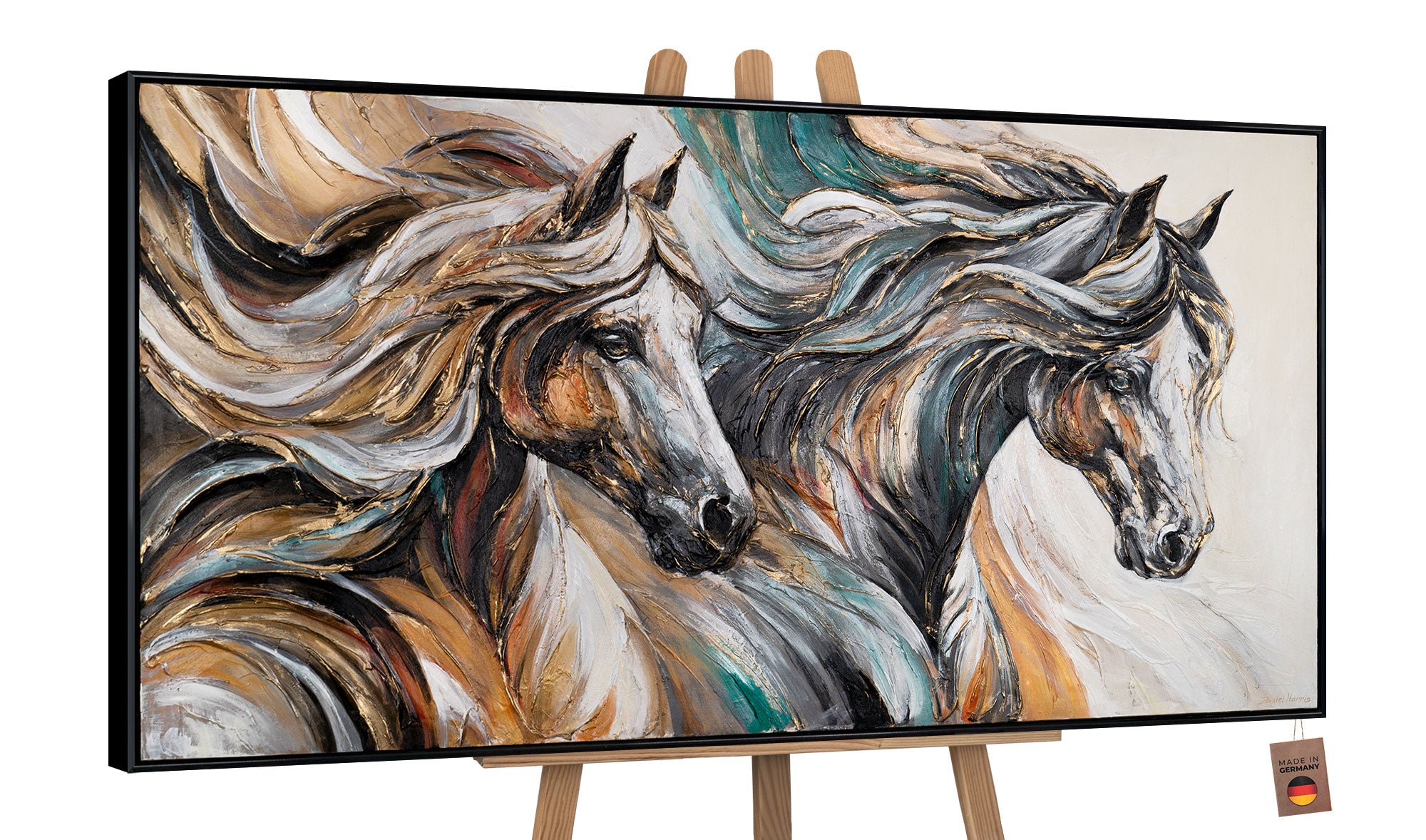 Zwei kraftvolle Pferde in dynamischer Bewegung, festgehalten in einem strukturierten, handgemalten Acrylgemälde. Die Kombination aus Goldakzenten, Kontrastfarben und abstrakter Darstellung verleiht diesem Bild Ausdruck, Energie und Tiefe.