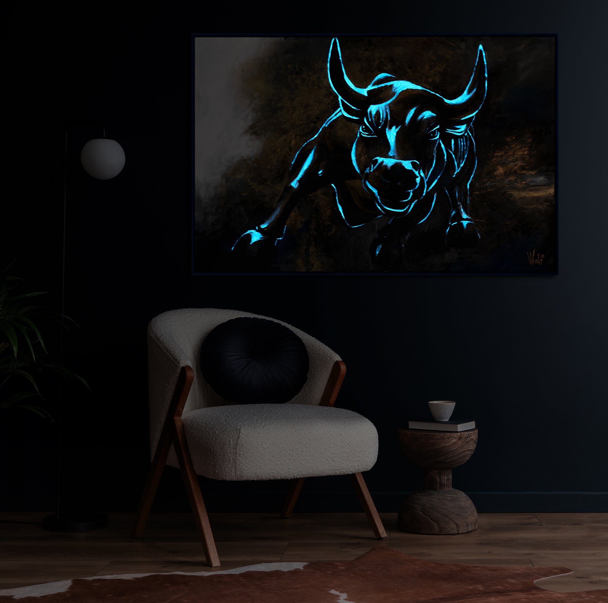 2. Pintada con acrílicos y colores fluorescentes ecológicos. La lona está montada sobre un bastidor de madera natural, y su superficie está protegida con un barniz acrílico a base de agua para asegurar su durabilidad por años.