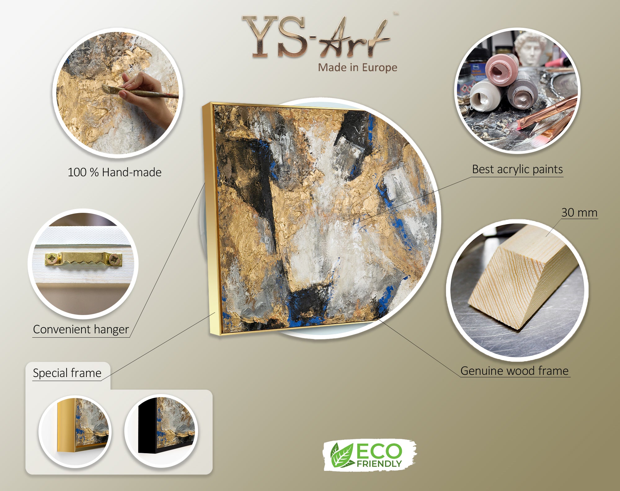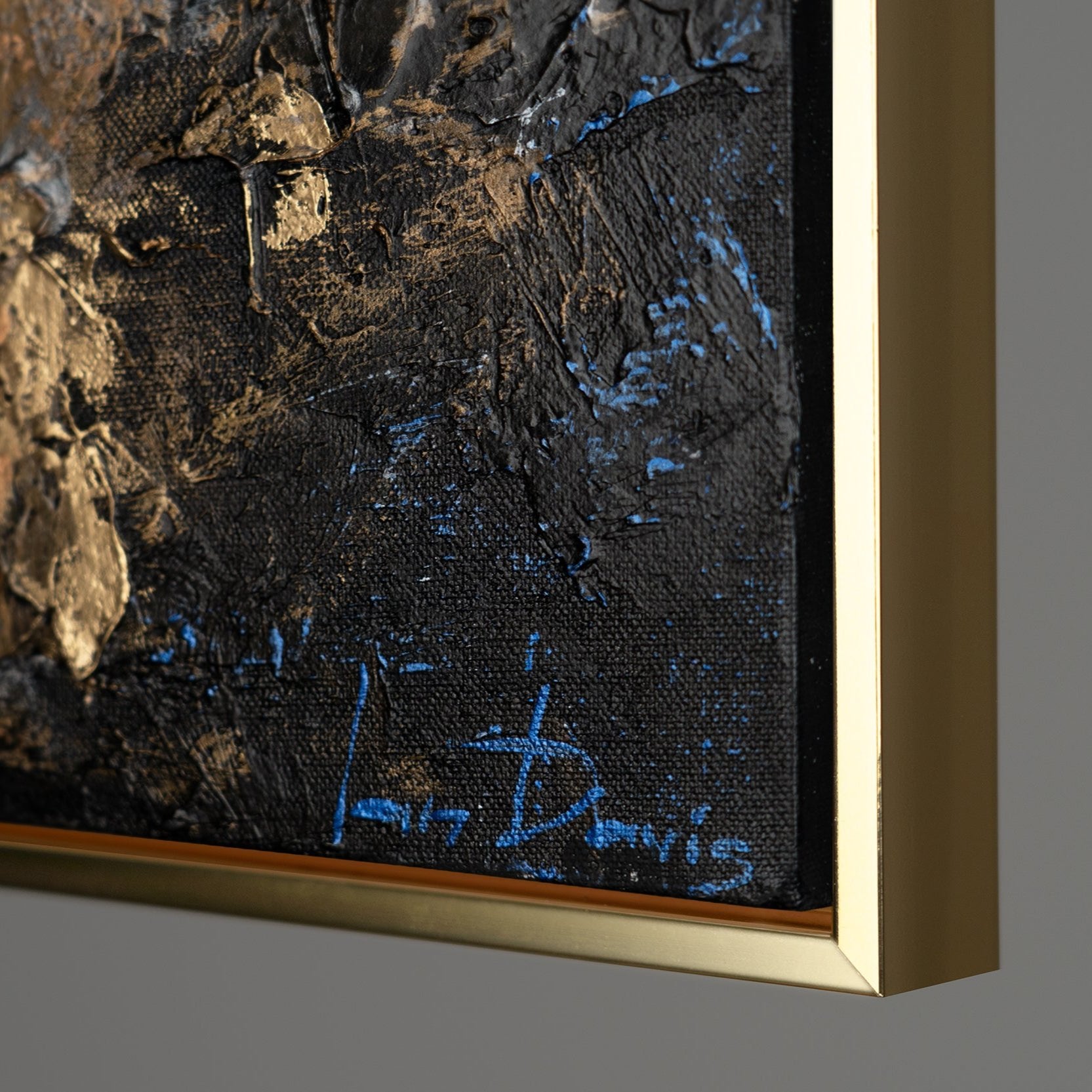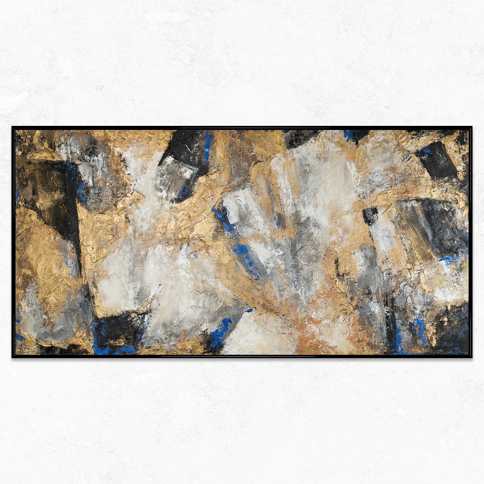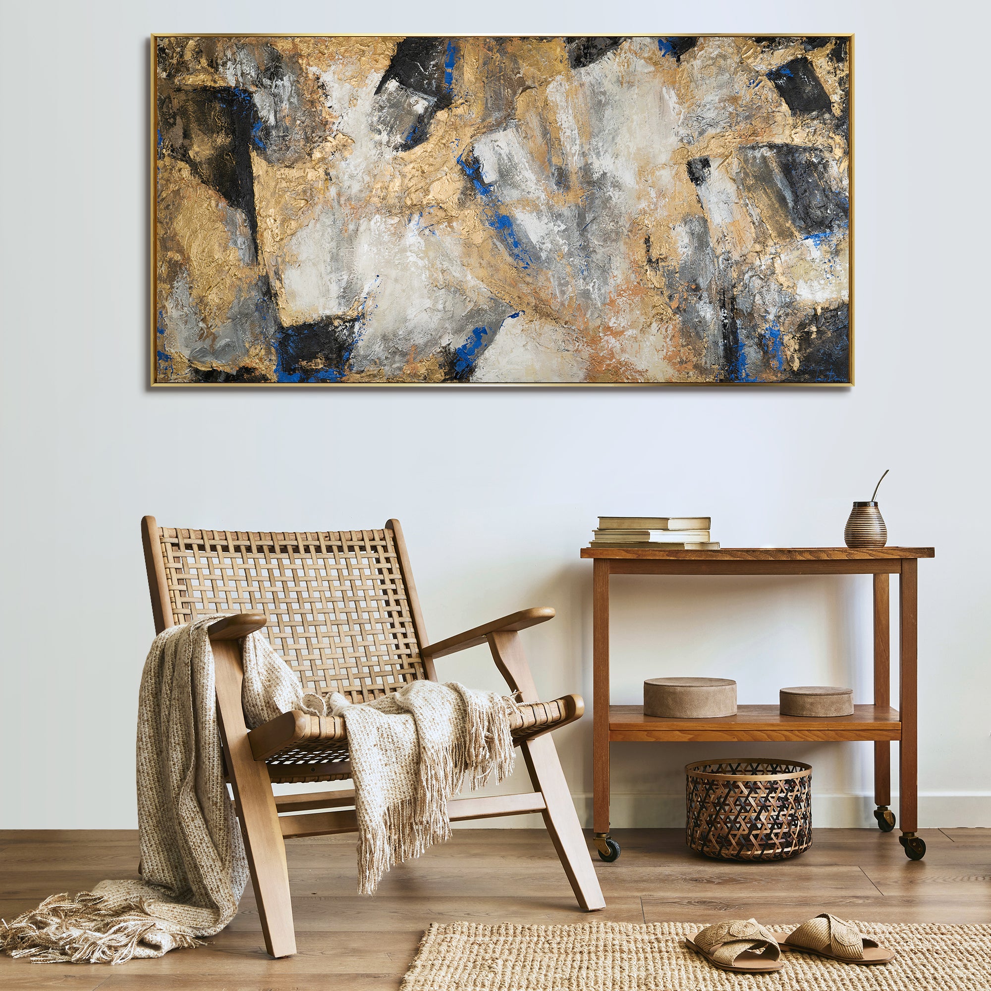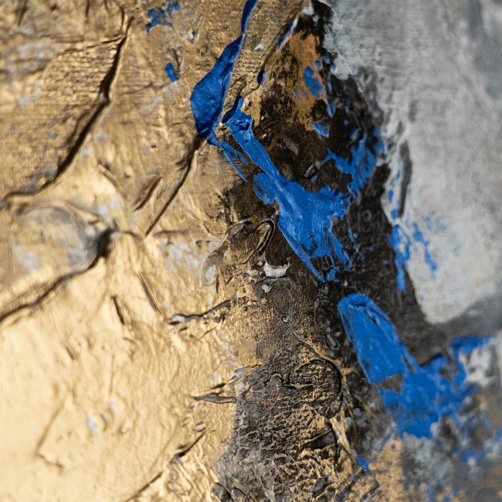 Esta pintura acrílica moderna y abstracta es una auténtica obra maestra del arte hecho a mano. Combina intensos acentos dorados con profundos tonos de negro y azul, creando una atmósfera poderosa y dinámica. La textura y la profundidad del lienzo aportan a la obra un aire lujoso y artístico que realza cualquier espacio.
