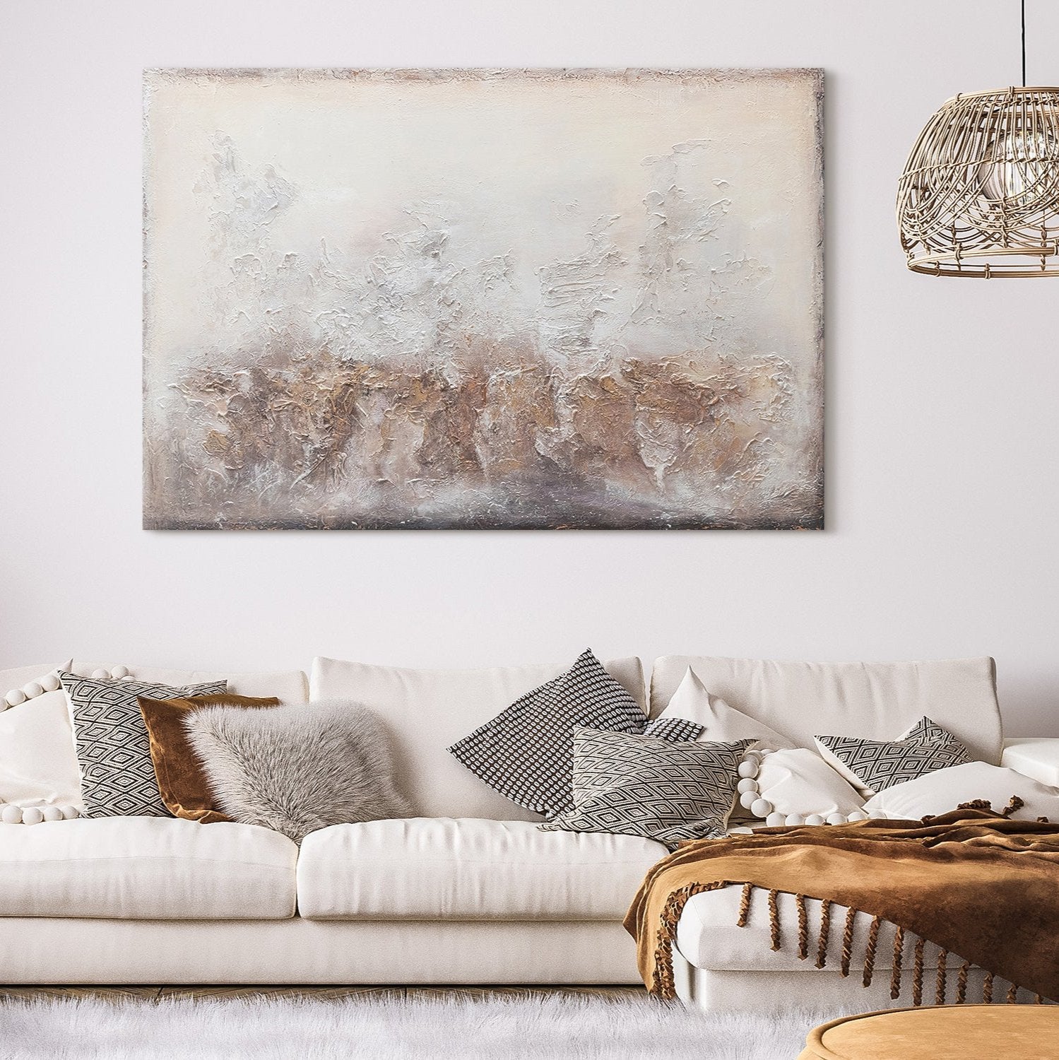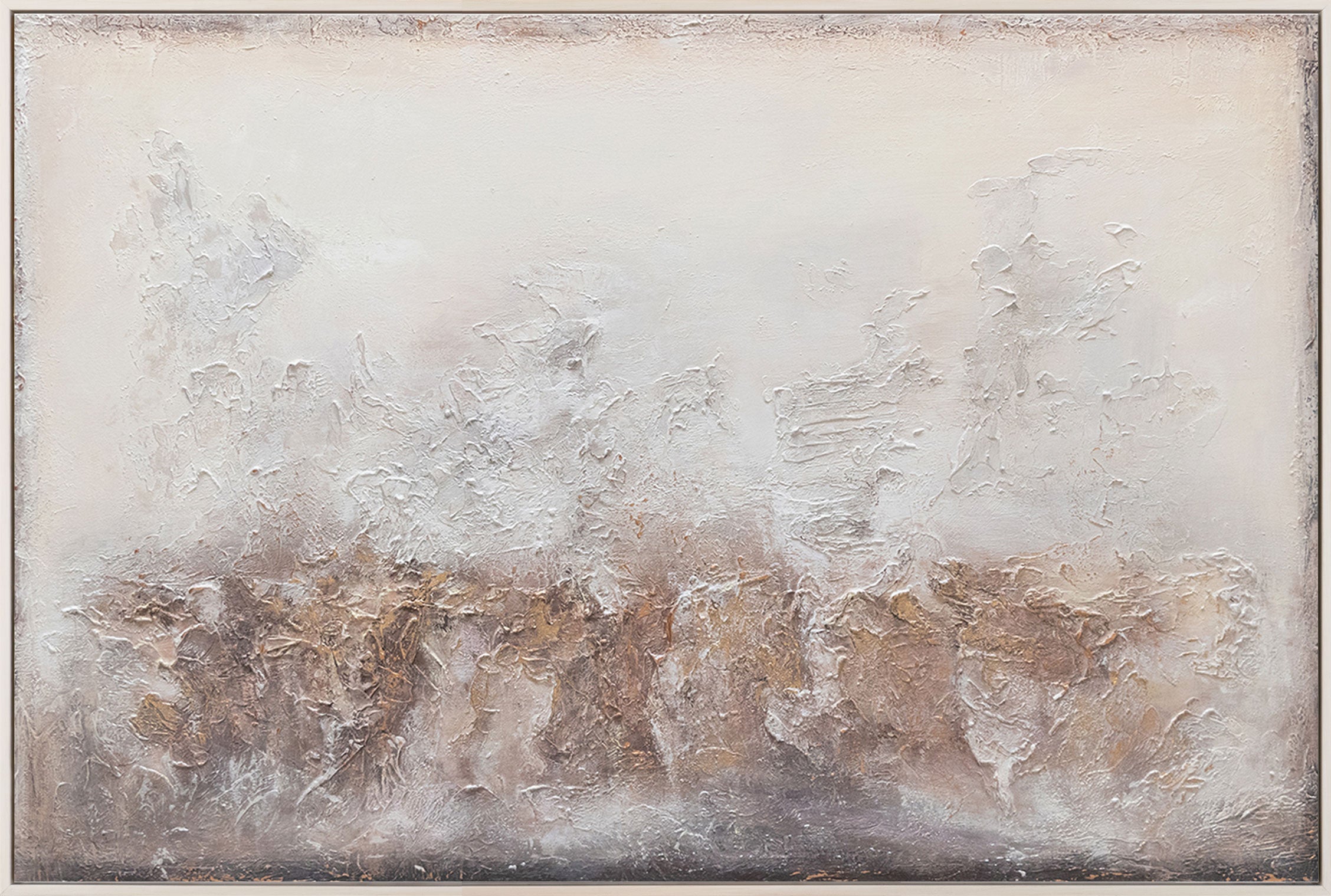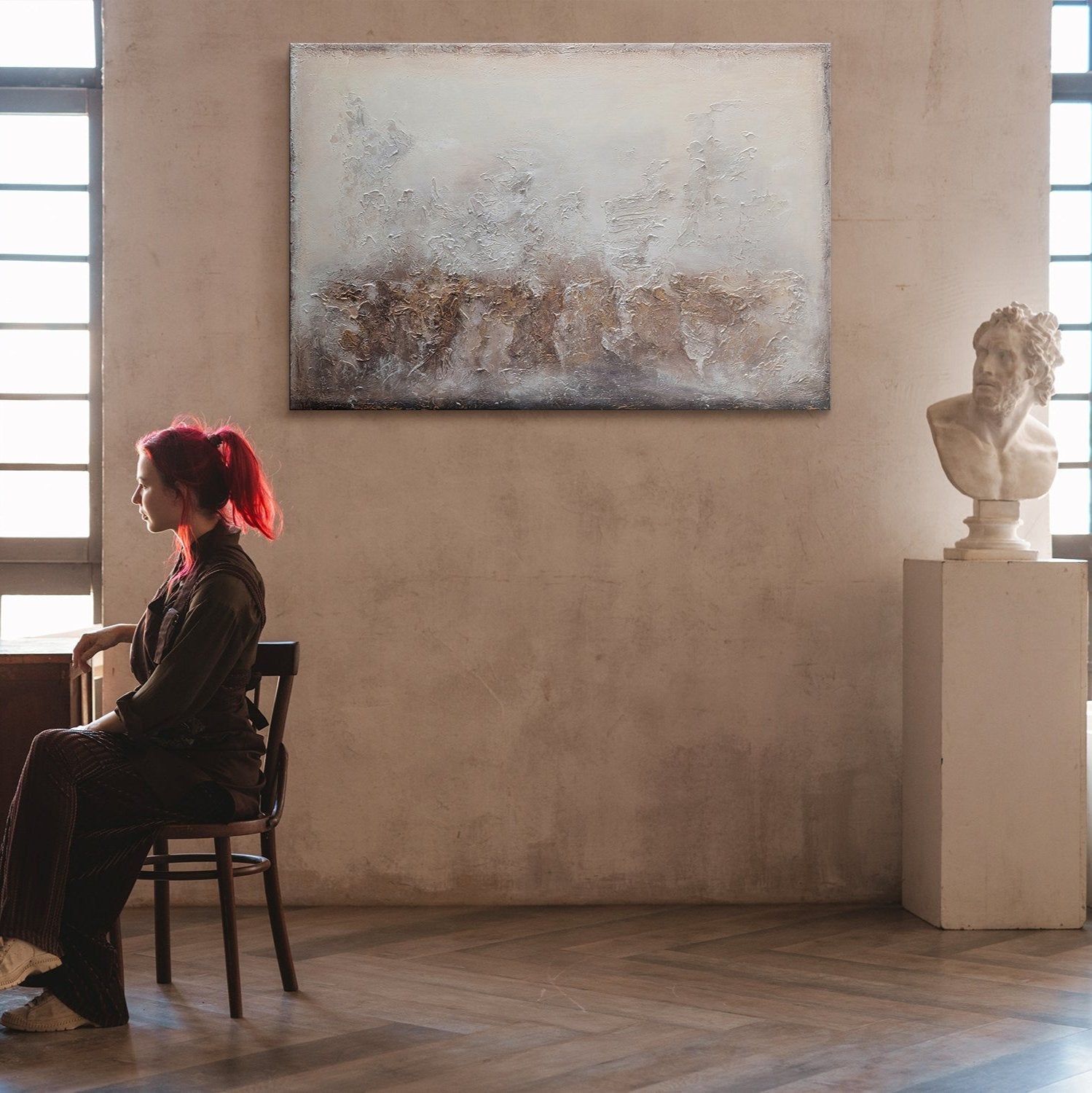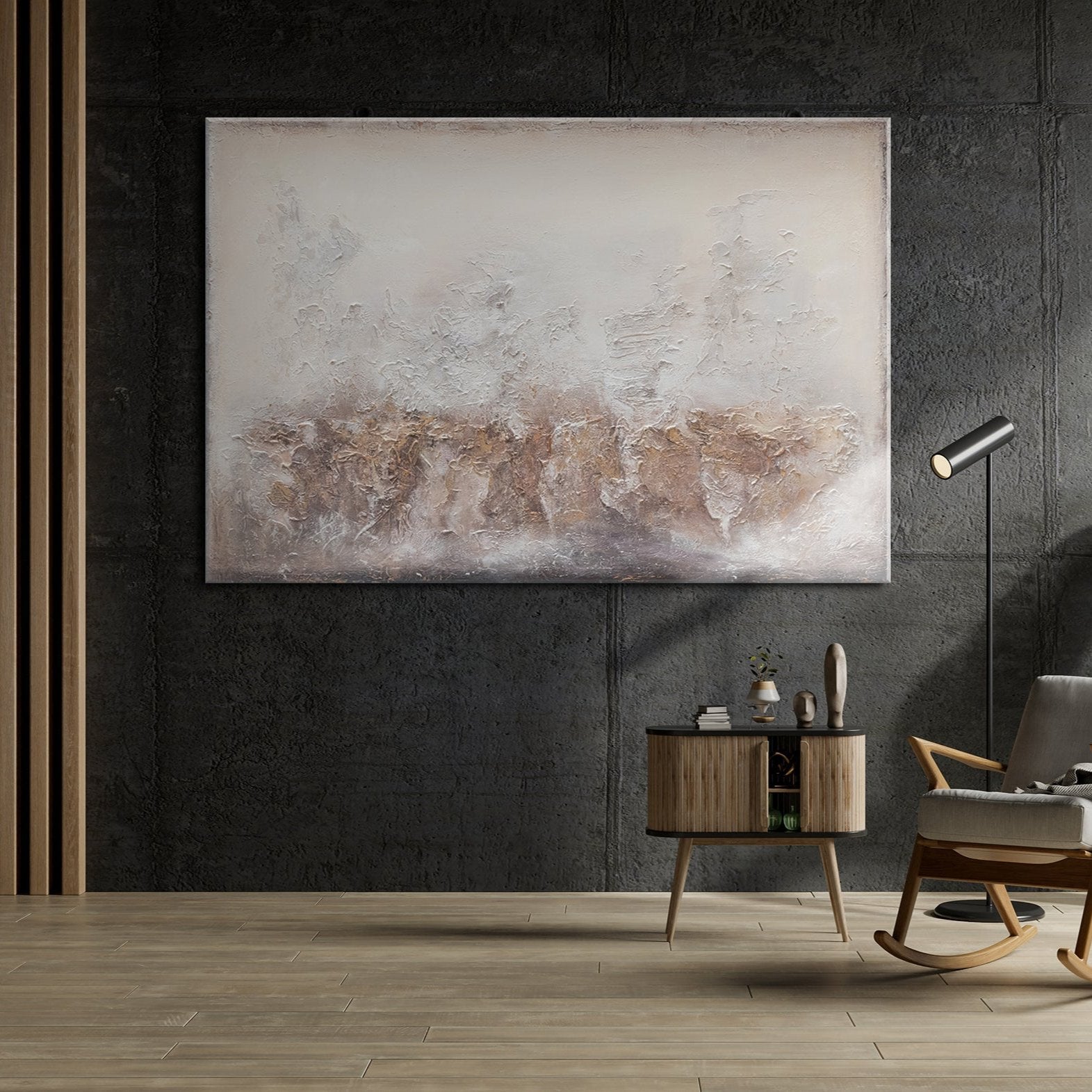 Esta pintura acrílica hecha a mano sobre lienzo representa la esencia del arte moderno en su forma más pura. Con tonos suaves y neutros, esta obra aporta una atmósfera relajante y sofisticada, ideal para salones elegantes y contemporáneos. Las texturas y la profundidad visual invitan a la calma y la contemplación.