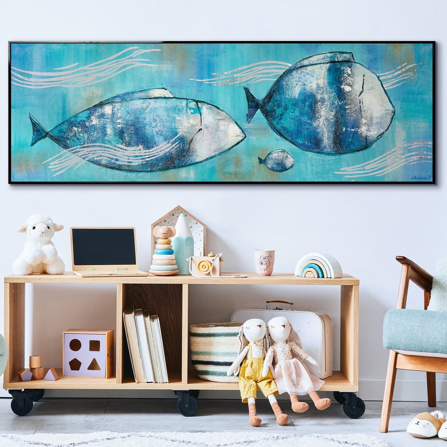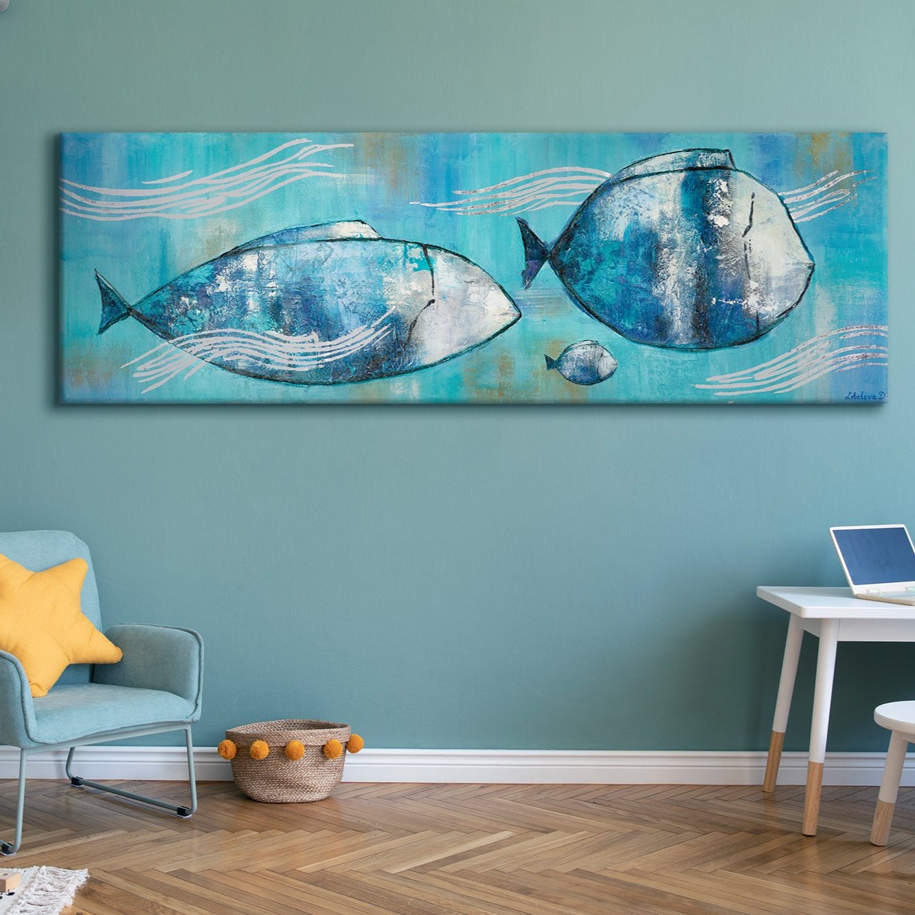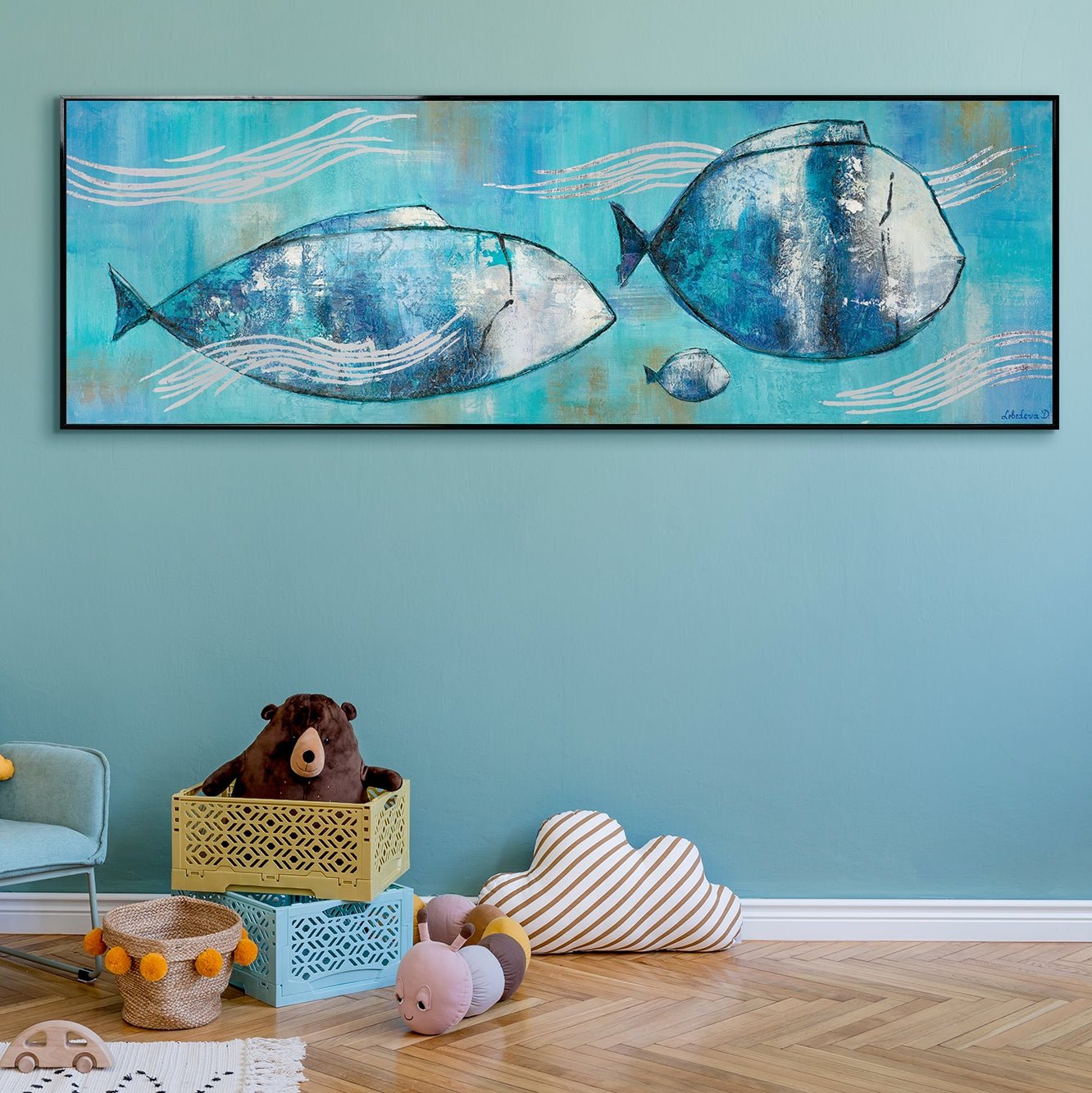Esta pintura acrílica hecha a mano sobre lienzo captura la serenidad y belleza del mar. La representación abstracta de peces en distintos tonos de azul y turquesa crea una atmósfera relajante y armoniosa, ideal para interiores modernos. Su paleta de colores suaves evoca la calma del océano y aporta un toque de frescura al espacio.