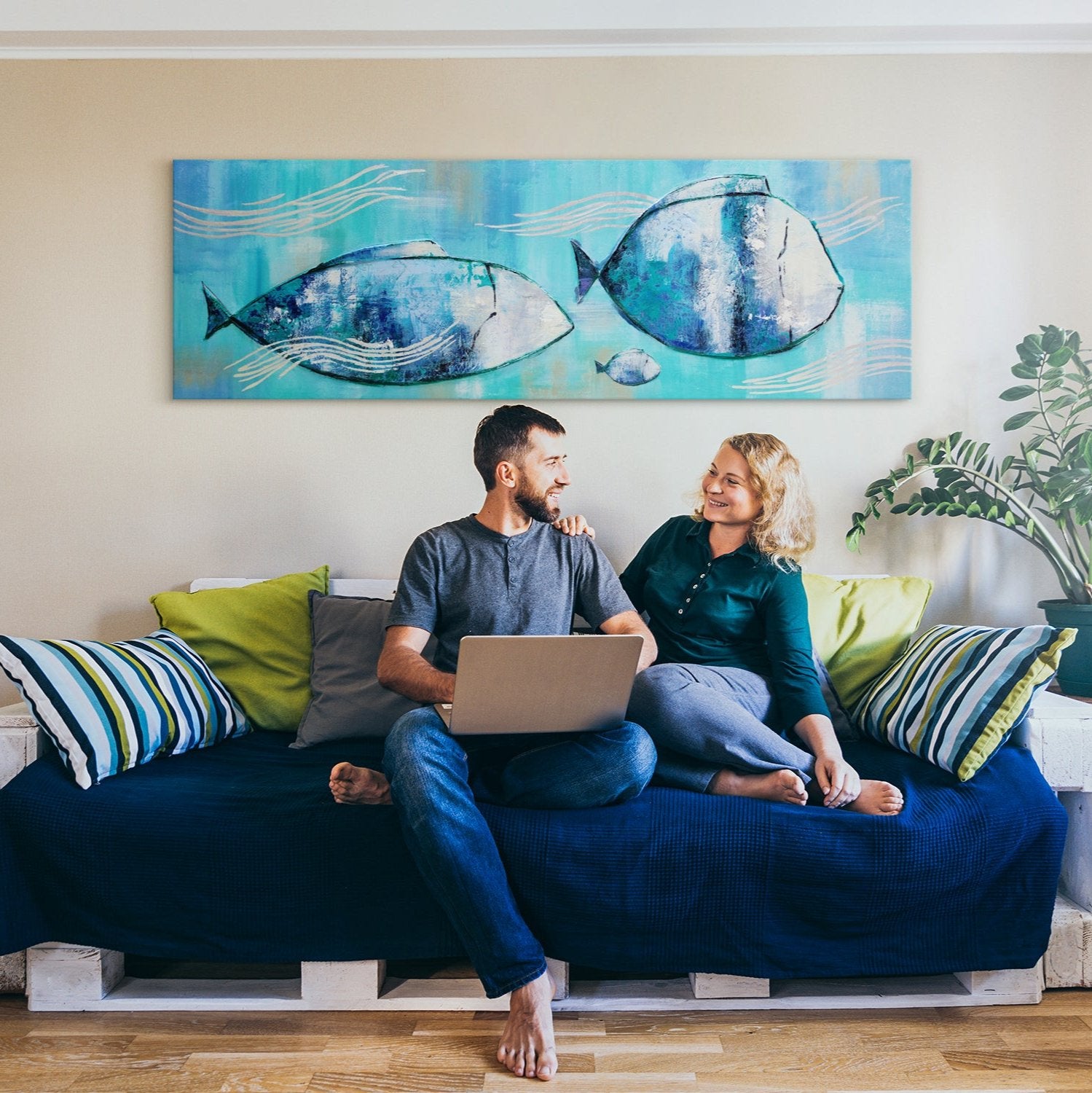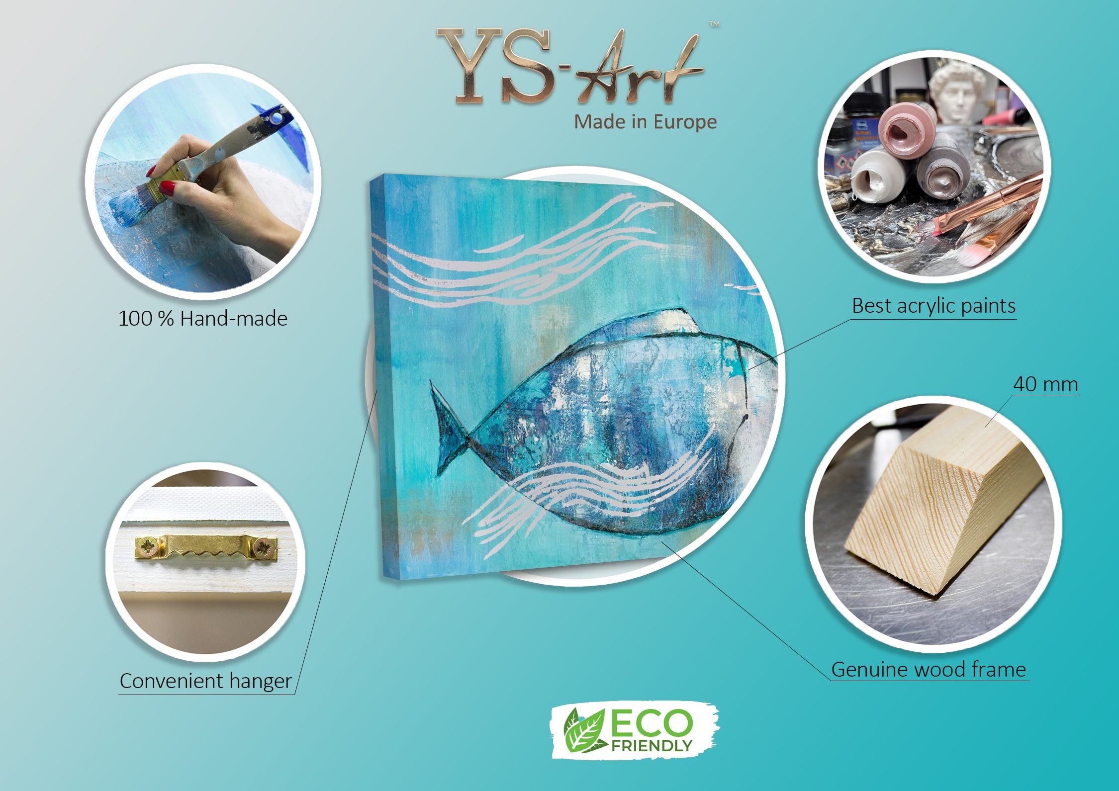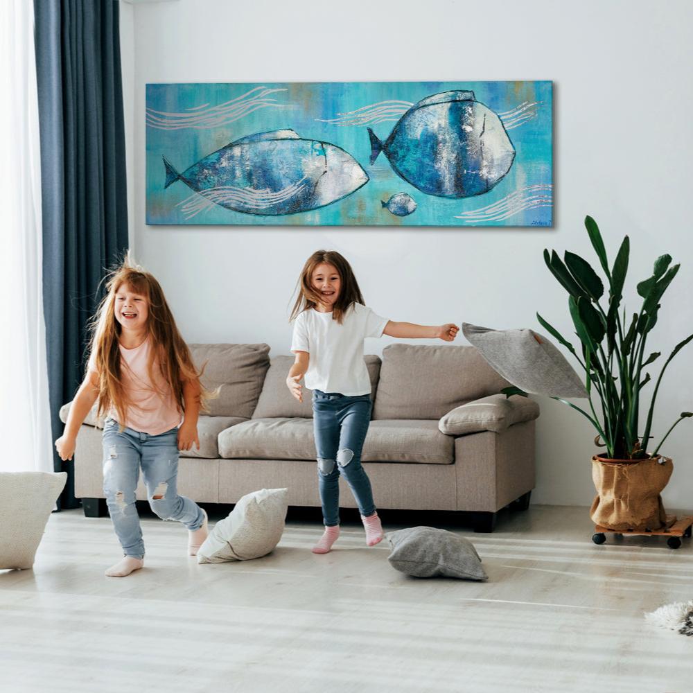 Esta pintura acrílica hecha a mano sobre lienzo captura la serenidad y belleza del mar. La representación abstracta de peces en distintos tonos de azul y turquesa crea una atmósfera relajante y armoniosa, ideal para interiores modernos. Su paleta de colores suaves evoca la calma del océano y aporta un toque de frescura al espacio.