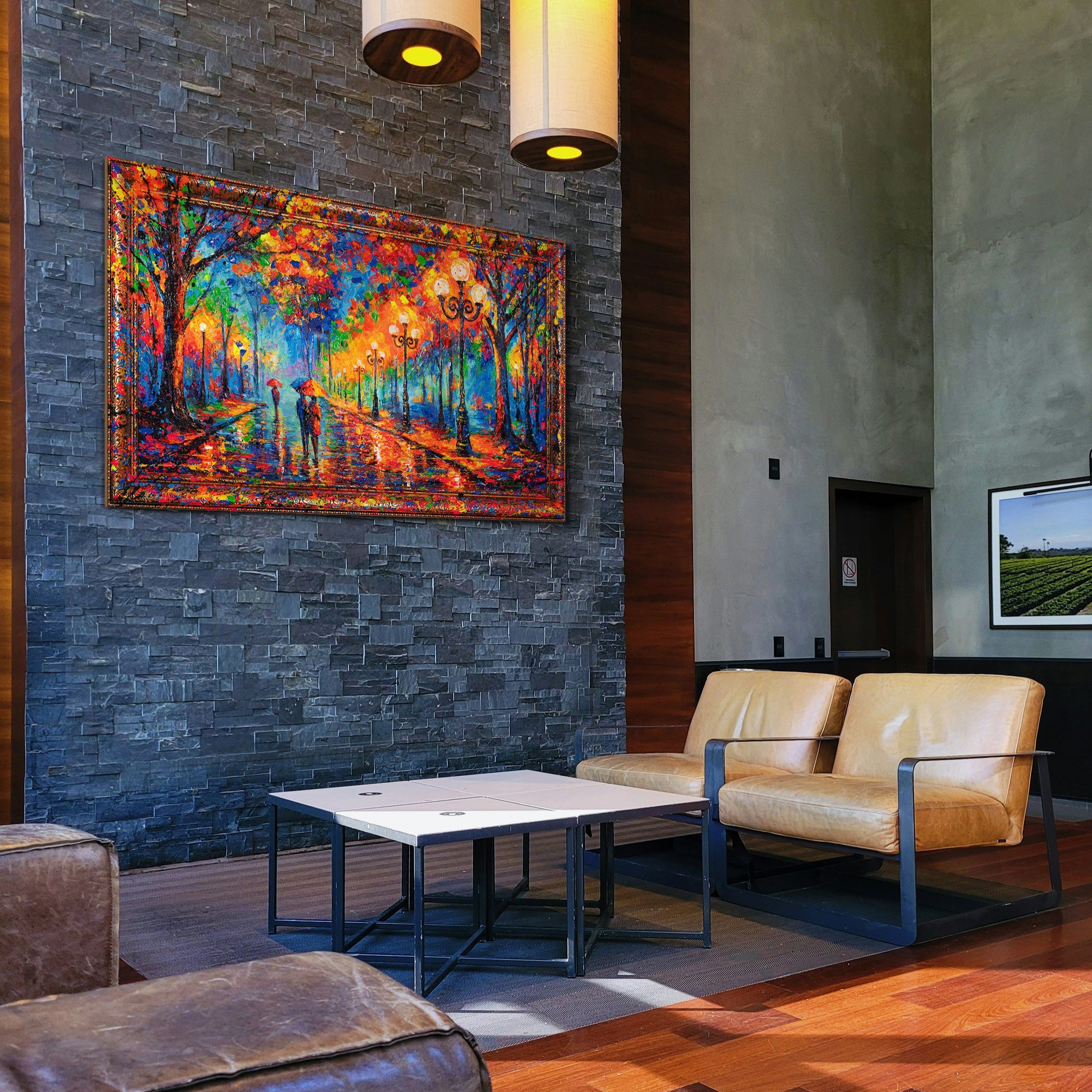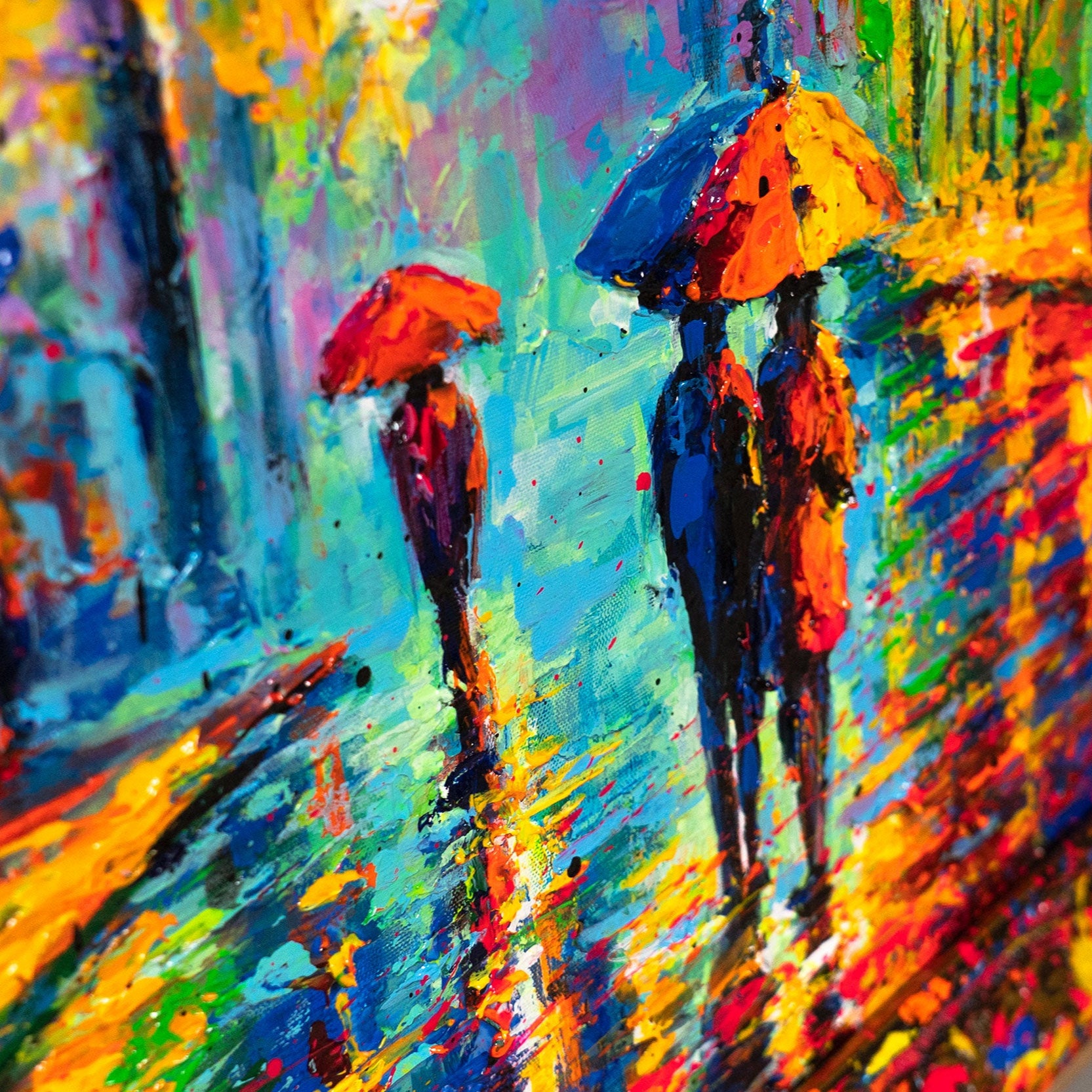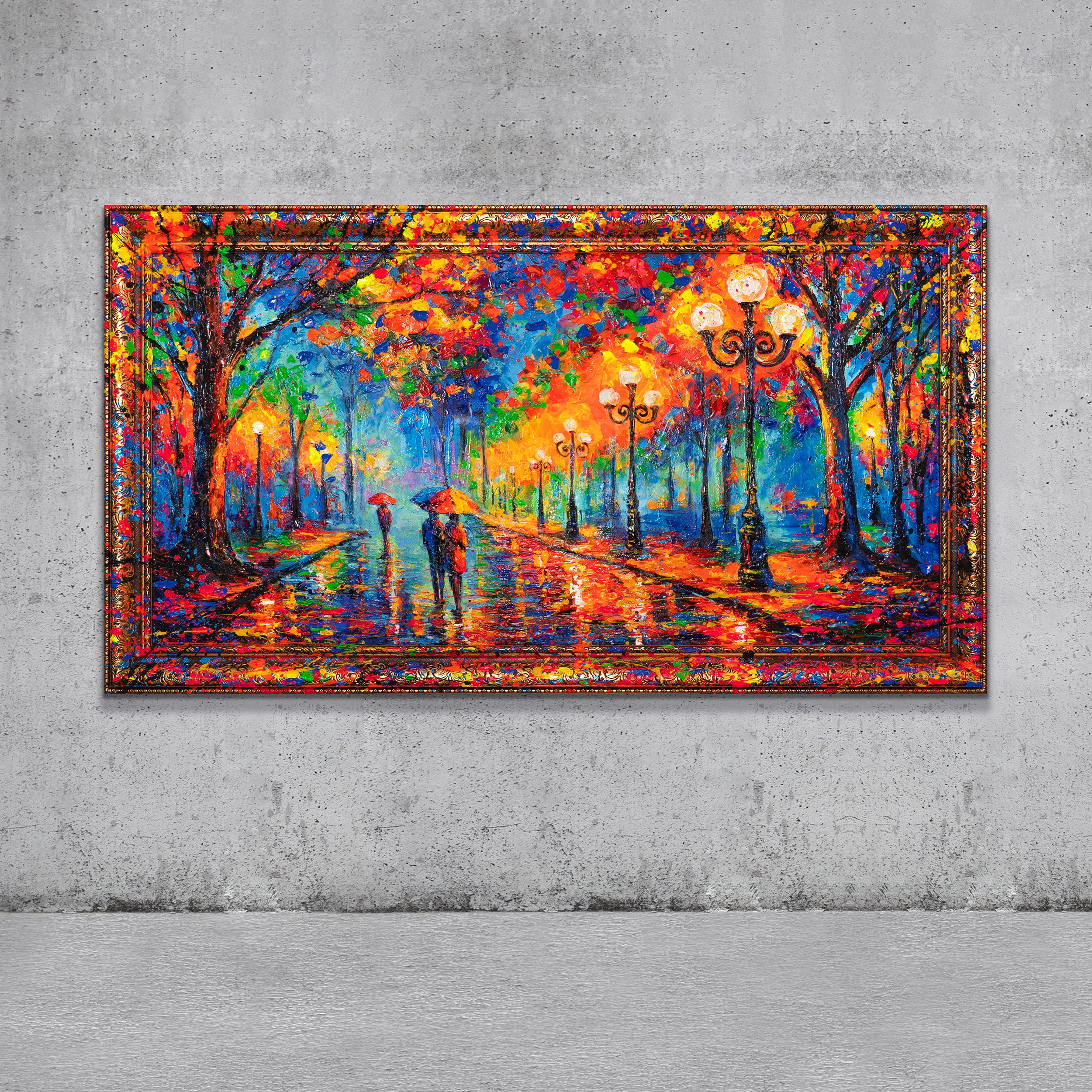 Dieses Gemälde „Abendspaziergang“ ist pure Stimmung in Farbe: Ein romantischer Spaziergang unter bunten Bäumen, Lampenlicht spiegelt sich im nassen Pflaster und schafft eine warme, lebendige Atmosphäre. In kräftigen Pinselstrichen und leuchtenden Farben entsteht ein Kunstwerk, das Emotionen einfängt und gleichzeitig moderne Eleganz in Ihr Zuhause bringt.