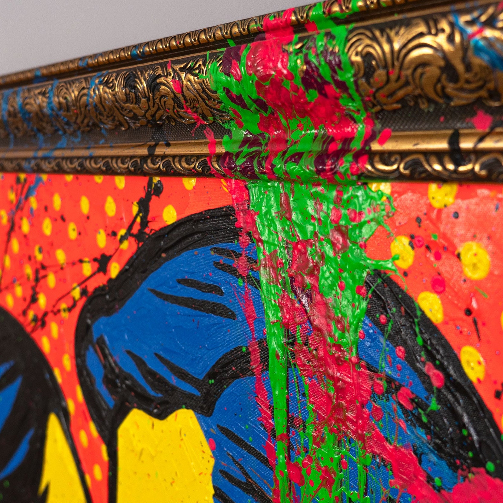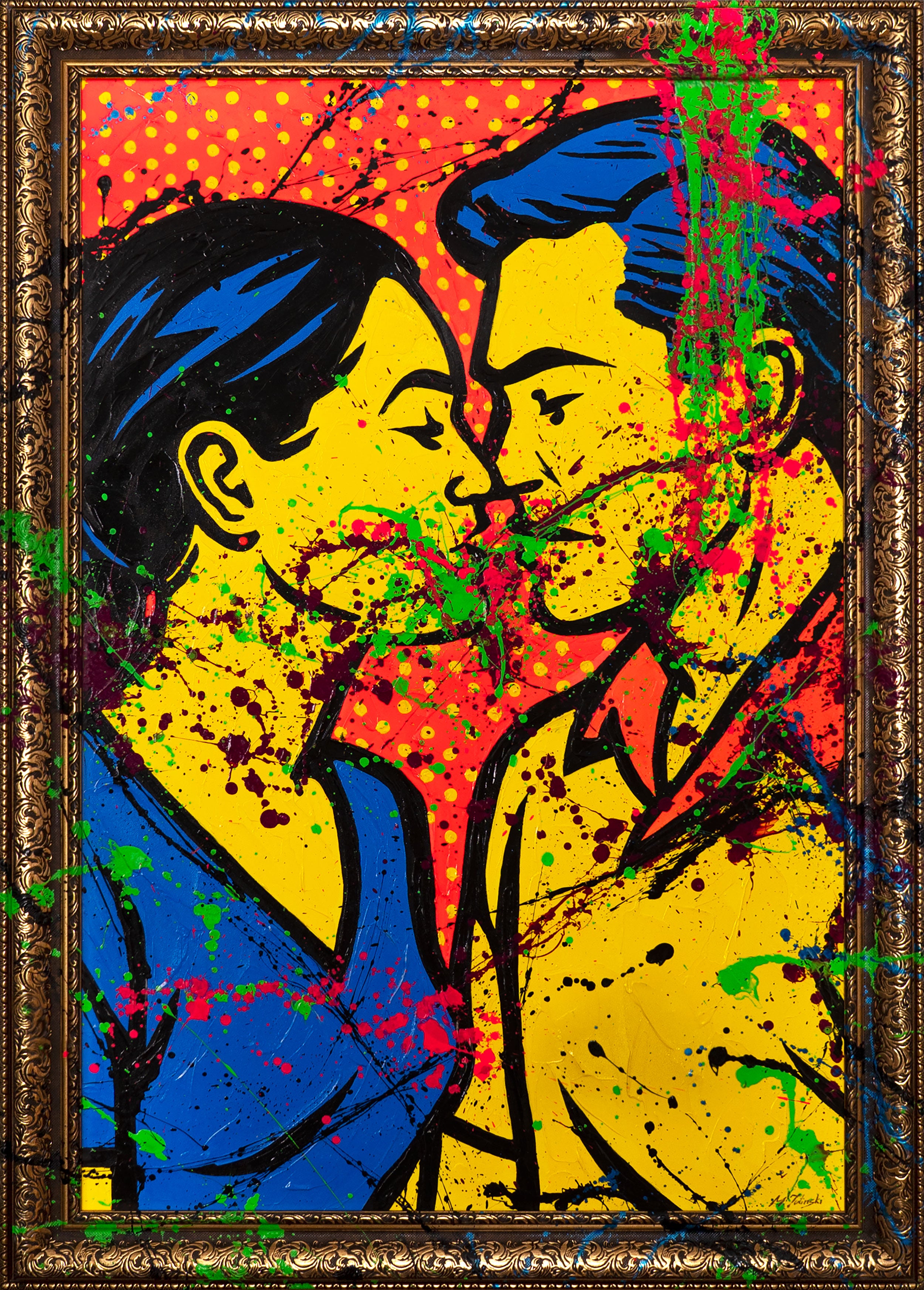 „Farbiger Kuss“ zeigt ein Paar im ikonischen Pop-Art Stil – leuchtend gelbe Gesichter, intensive Blautöne und ein roter Hintergrund mit Punkten. Dynamische Farbspritzer in Grün, Pink und Schwarz verleihen dem Werk Energie und Urbanität. Jeder Strich ist handgemalt und macht das Bild zu einem einzigartigen Statement zwischen Romantik und Street-Art.