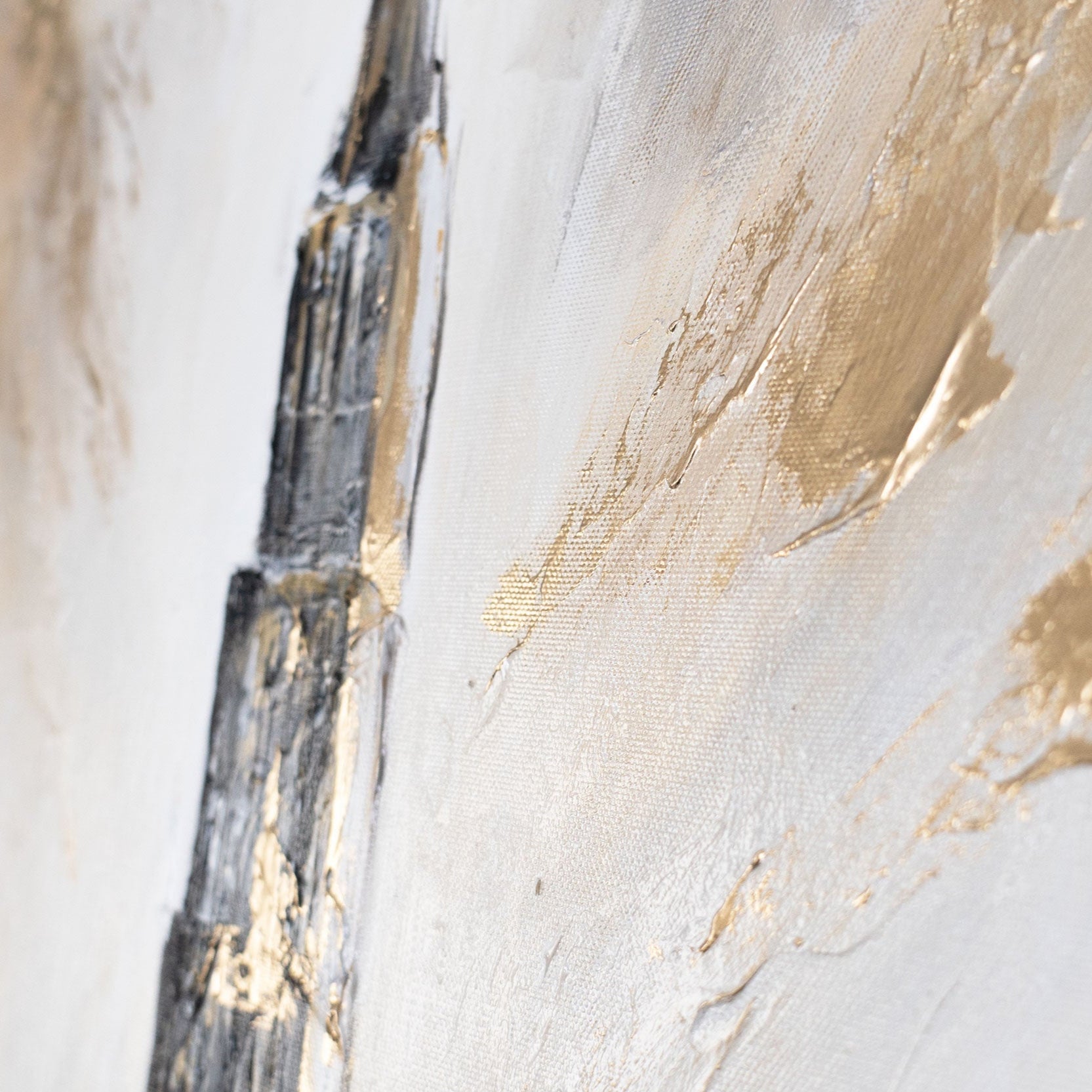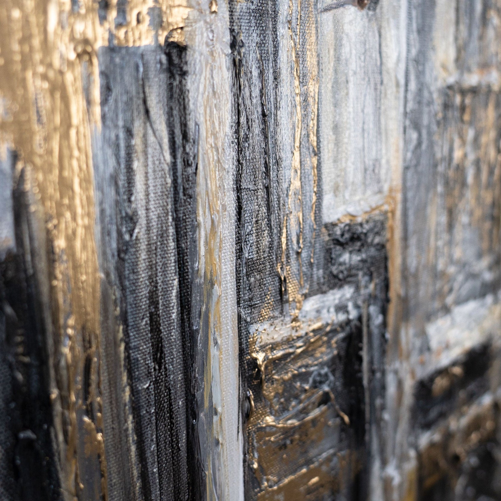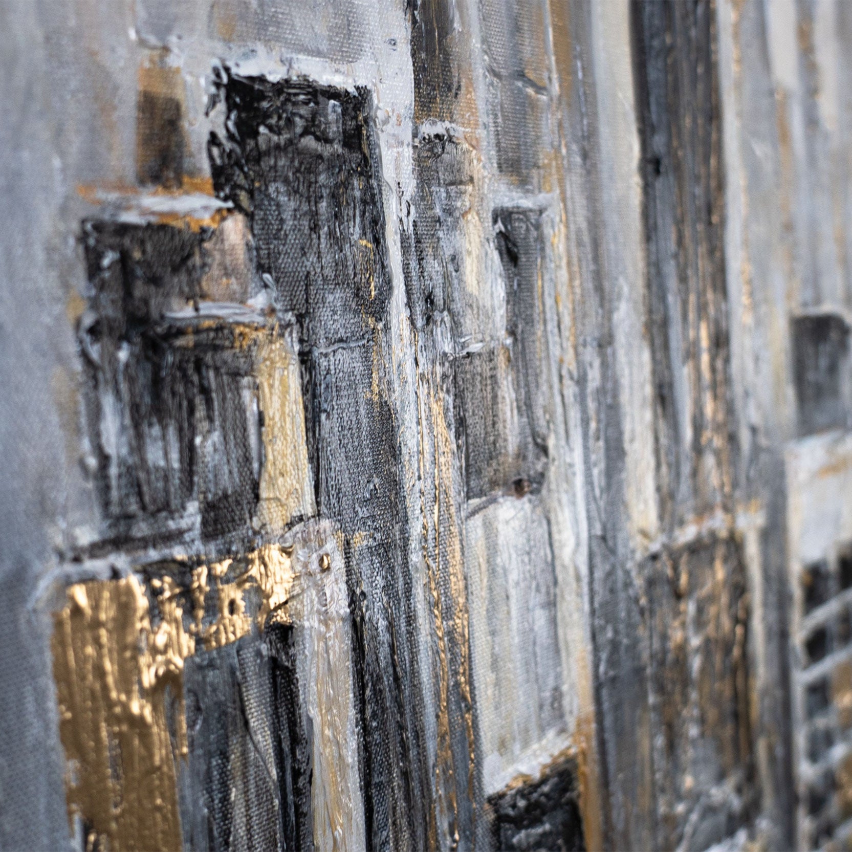 „Die Kraft der Architektur“ ist ein handgemaltes Acrylbild, das ein abstraktes Cityscape in nuancierten Grautönen und edlen Goldakzenten zeigt. Dynamische Pinselstrukturen und strukturierte Oberflächen verbinden Architekturbild und abstrakte Kunst zu moderner Wanddeko.