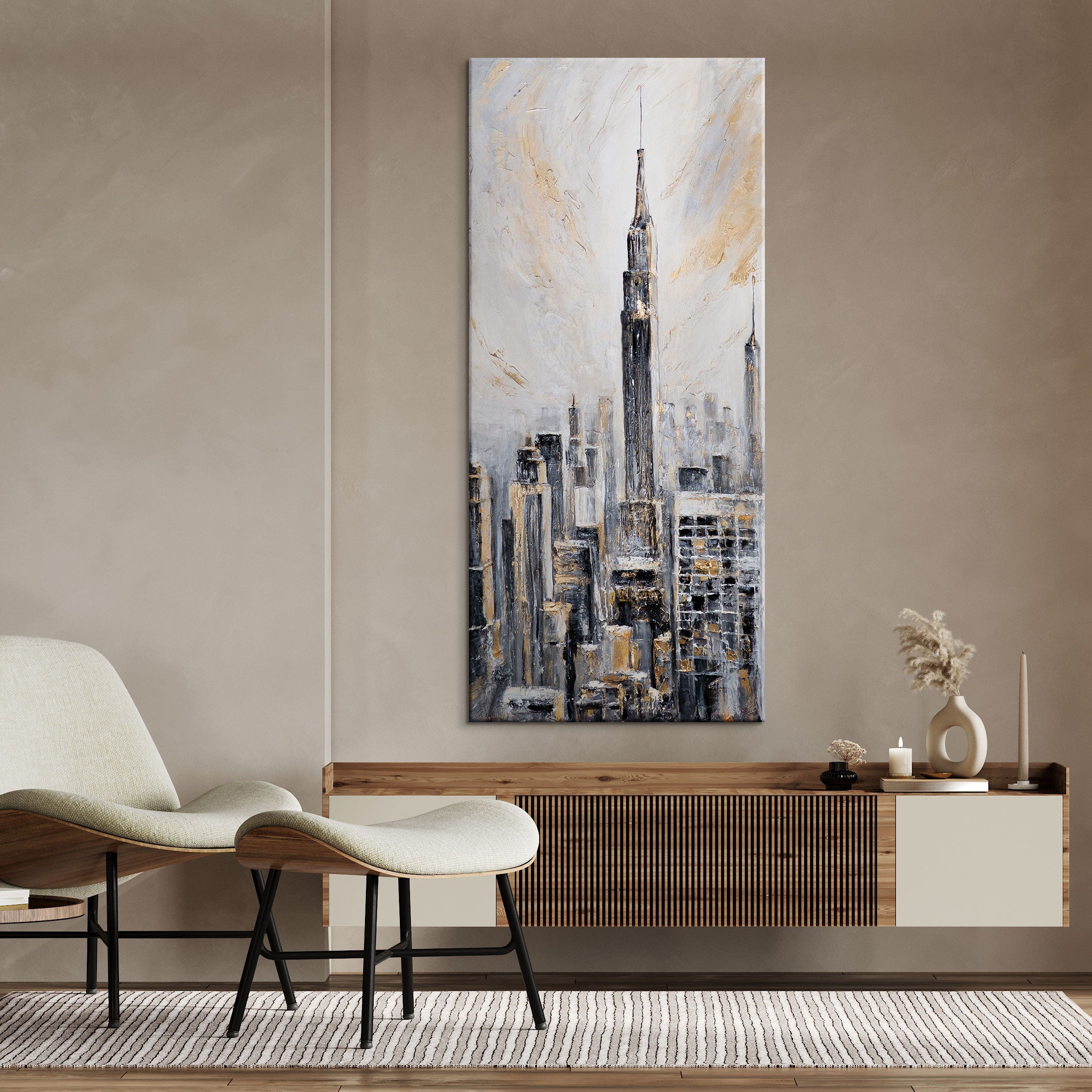 Dieses Acrylbild auf Leinwand eignet sich perfekt als Wanddeko Wohnzimmer, Büro oder Flur. Die schlanke Hochformat-Leinwand setzt urbane Akzente über Sofa, Sideboard oder im Homeoffice und verleiht jedem Raum künstlerische Tiefe.