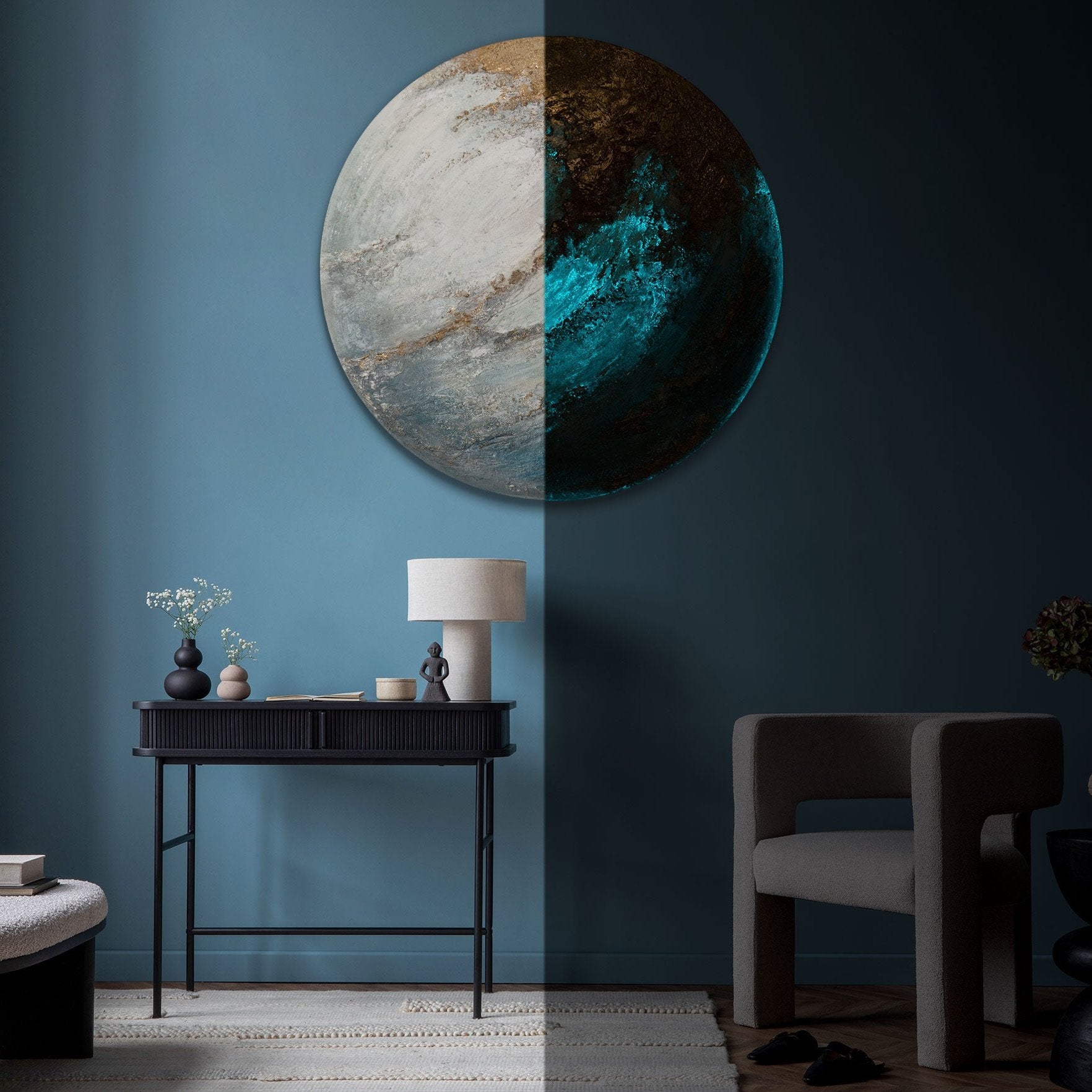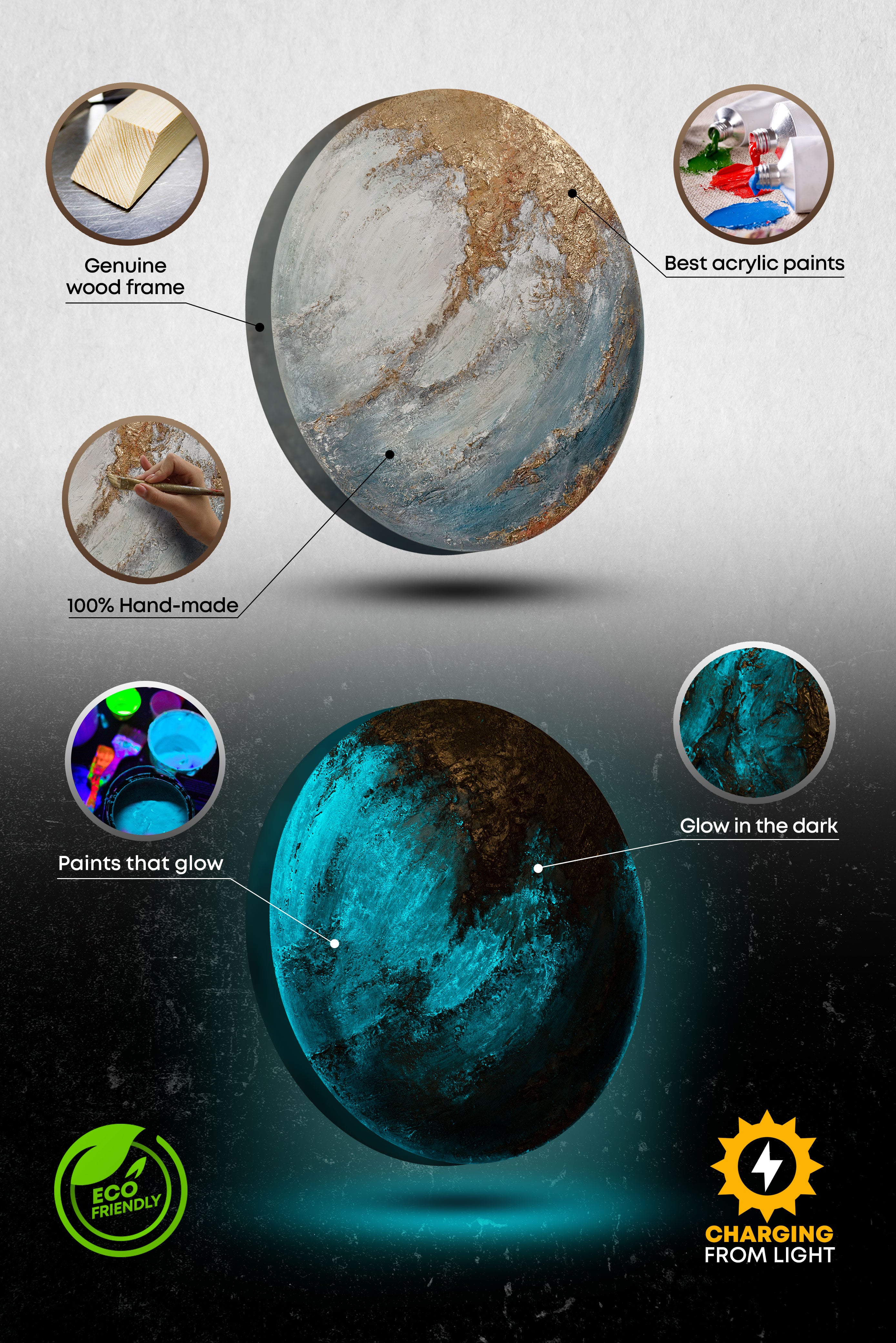 Verwandeln Sie Ihr Interieur mit „Ephyria“, einem modernen Acrylgemälde, das die Schönheit eines Planeten durch leuchtende Texturen einfängt. Dieses zu 100 % handgemalte Kunstwerk erhellt Ihren Raum im Dunkeln und schafft eine faszinierende Atmosphäre. Erhältlich in Sondergrößen ist es ein Statement-Stück für moderne Wohnzimmer, Schlafzimmer oder Büros.
