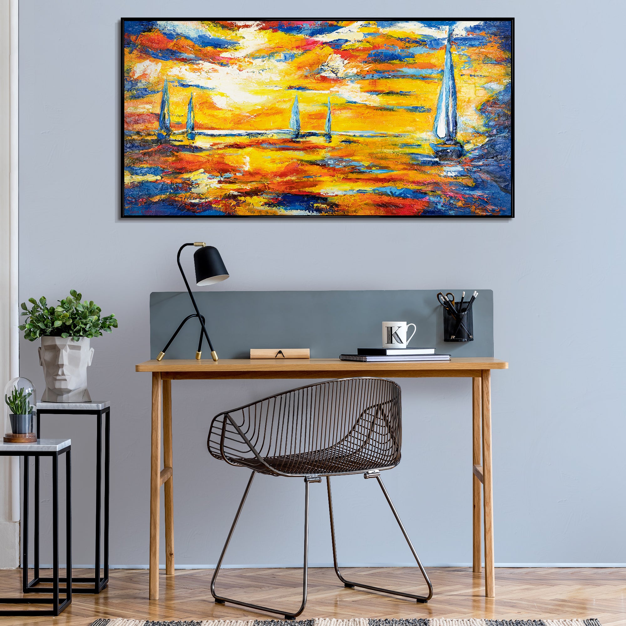 Das Leinwandbild „Meer Mirage“ eignet sich perfekt als Mittelpunkt in modernen Wohnzimmern, Büros oder Empfangsbereichen. Die original handgemalte Oberfläche schafft Tiefe und Lebendigkeit, die gedruckte Kunstwerke nicht erreichen können.