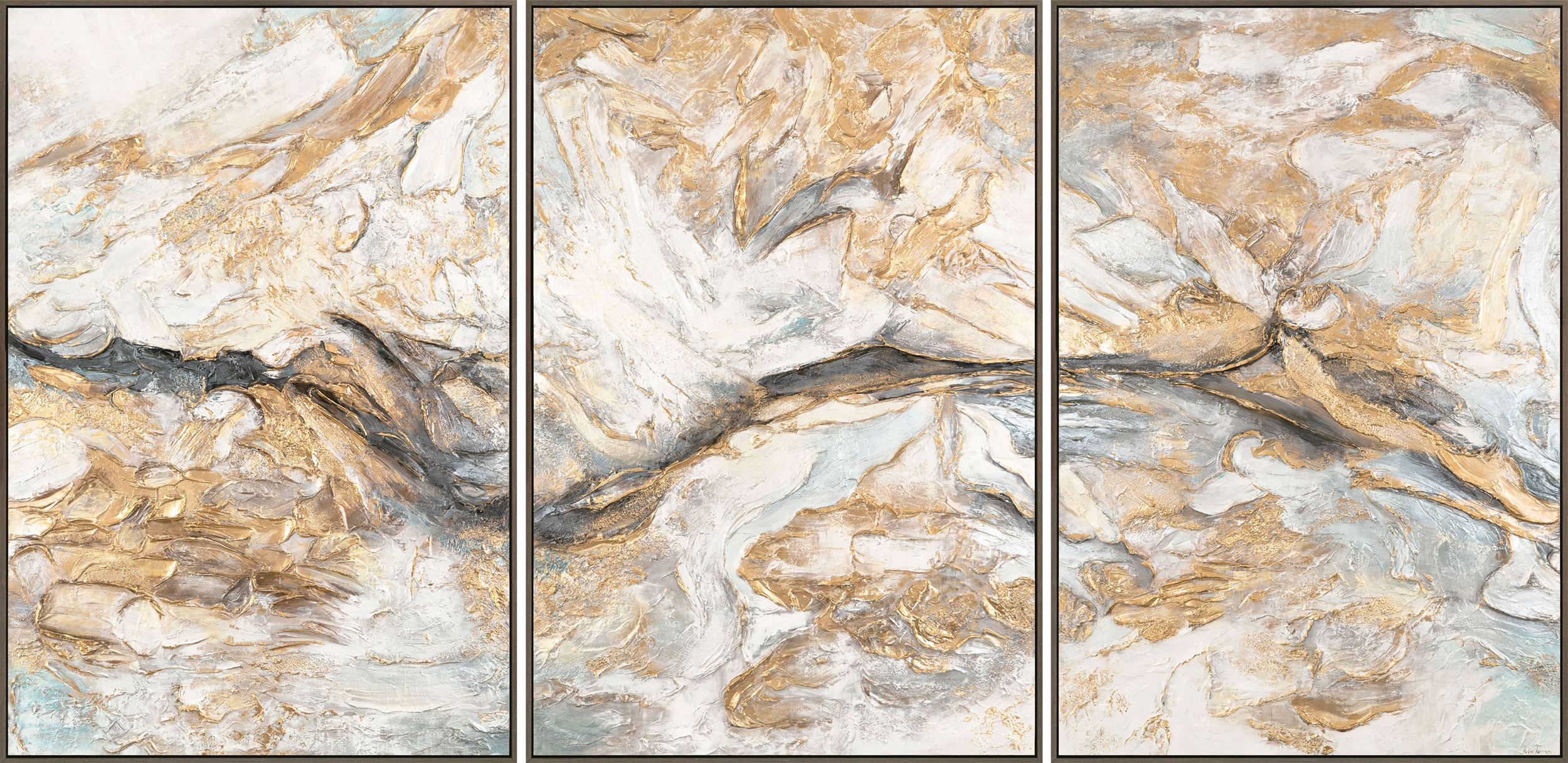 Das Triptychon „Abstrakte Muster“ begeistert mit einer beeindruckenden Komposition aus fließenden Formen und kontrastreichen Strukturen in einer Farbpalette aus Grau-, Gold- und Cremetönen. Die dreiteilige Leinwandarbeit ist handgemalt und überzeugt durch ihre plastische Oberflächentextur, die dem Bild Tiefe und Lebendigkeit verleiht. Dieses Kunstwerk schafft eine harmonische Balance zwischen Abstraktion und Struktur, wodurch es in jedem modernen Wohn- oder Büroambiente zum Blickfang wird.