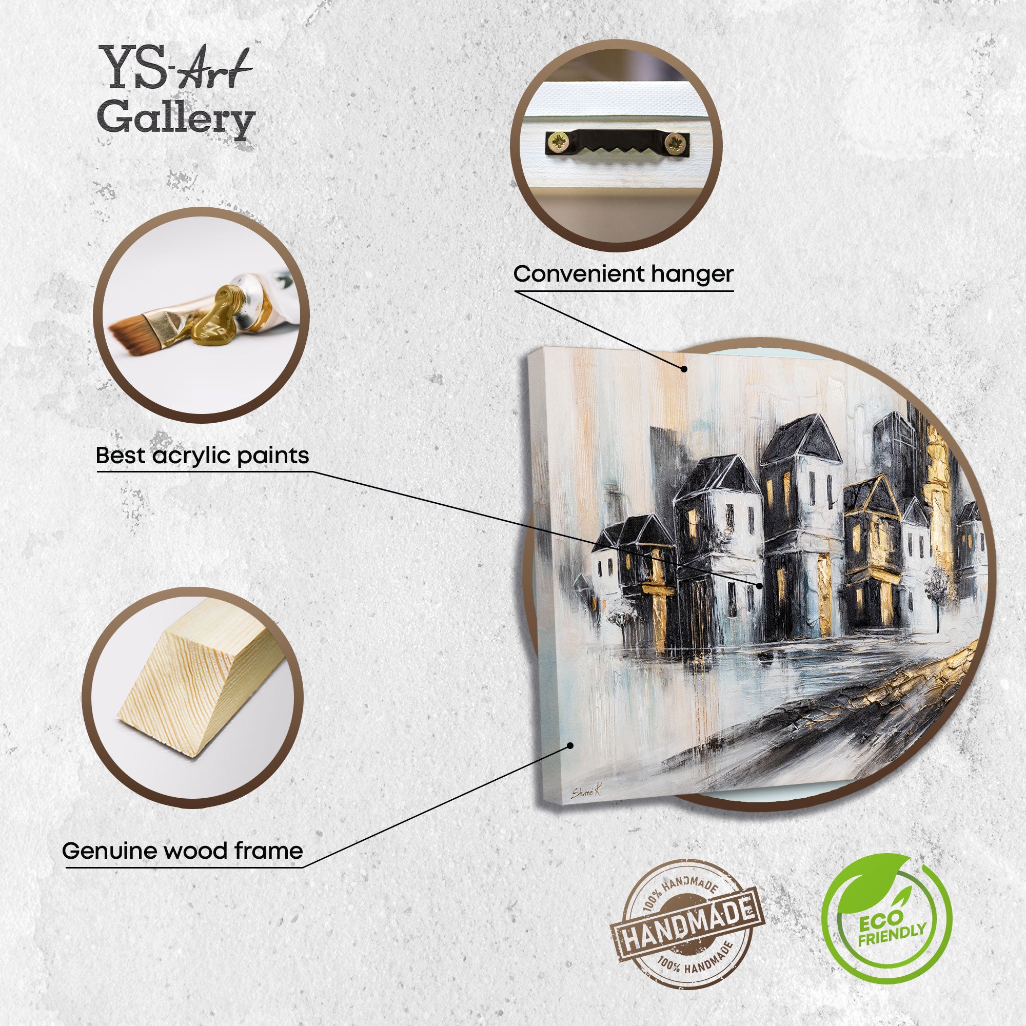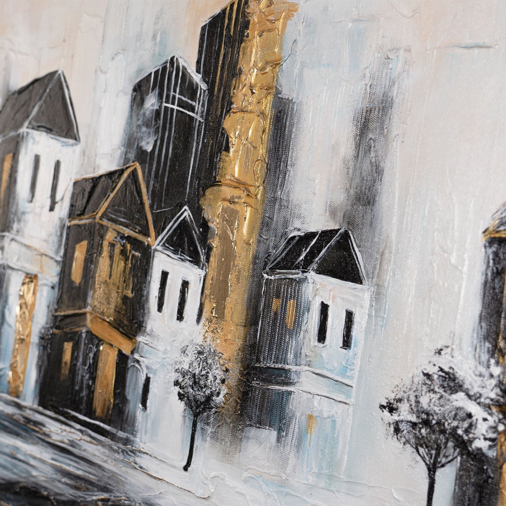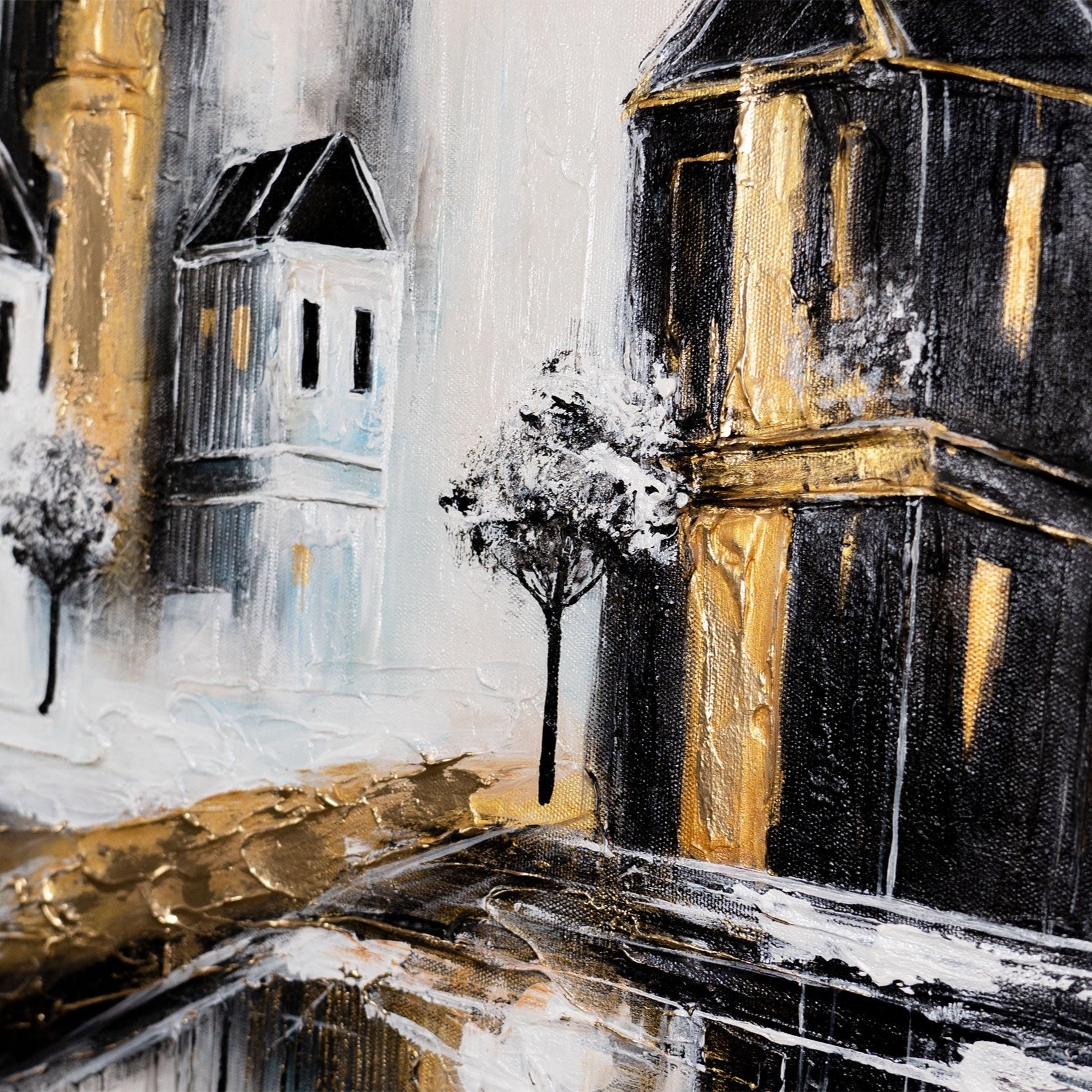 Das Acrylgemälde „Goldene Stadt“ entführt den Betrachter in eine urbane Szenerie, bei der moderne Architektur in monochromen Tönen auf leuchtende Goldakzente trifft. Die handgemalte Struktur sorgt für Tiefe und Bewegung im Bild – perfekt für eine stilvolle Wandgestaltung.