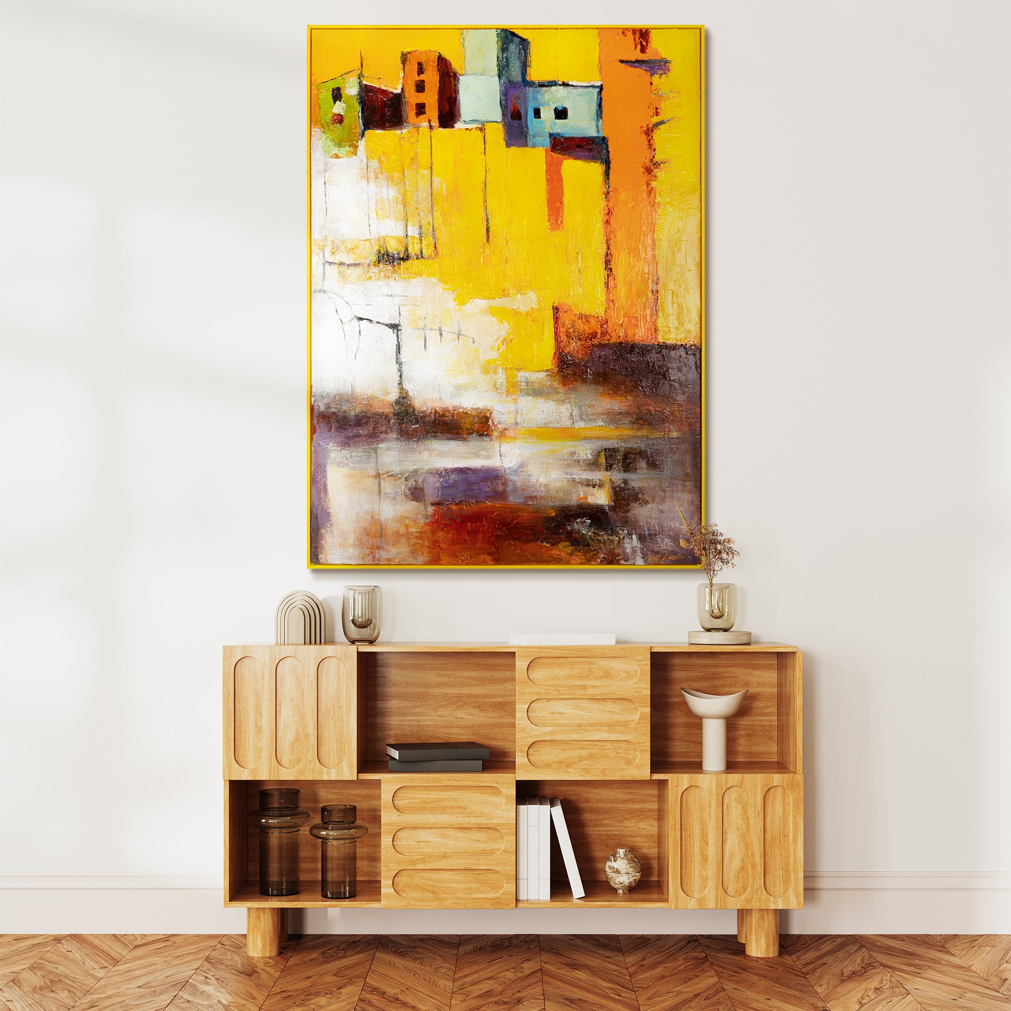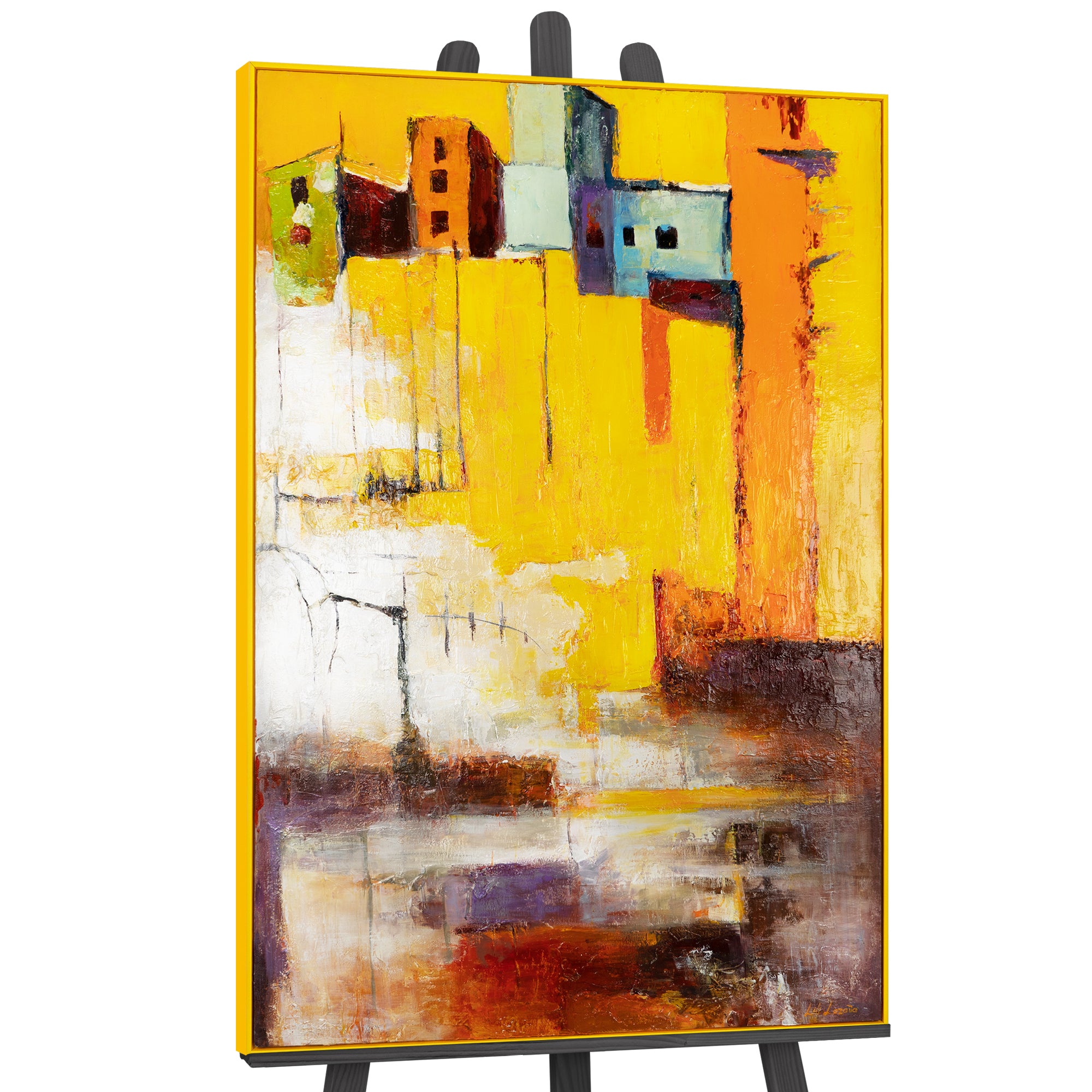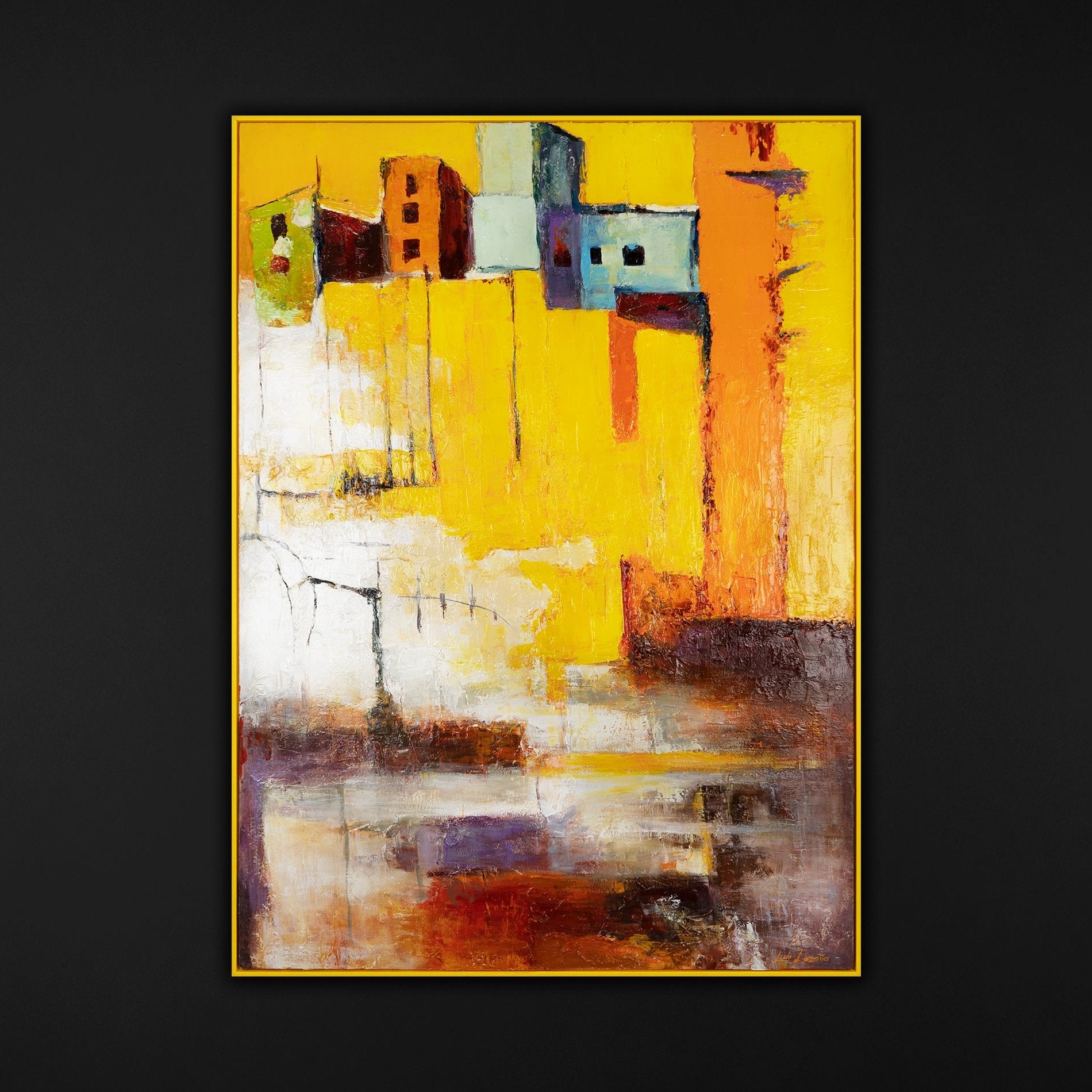 Tauchen Sie ein in die strahlenden Farben dieses handgemalten Acrylbildes „Gelbe Stadt“. Die kraftvollen Gelbtöne kombiniert mit dezenten Akzenten von Orange, Rot und Lila bringen Dynamik und Energie in jeden Raum.