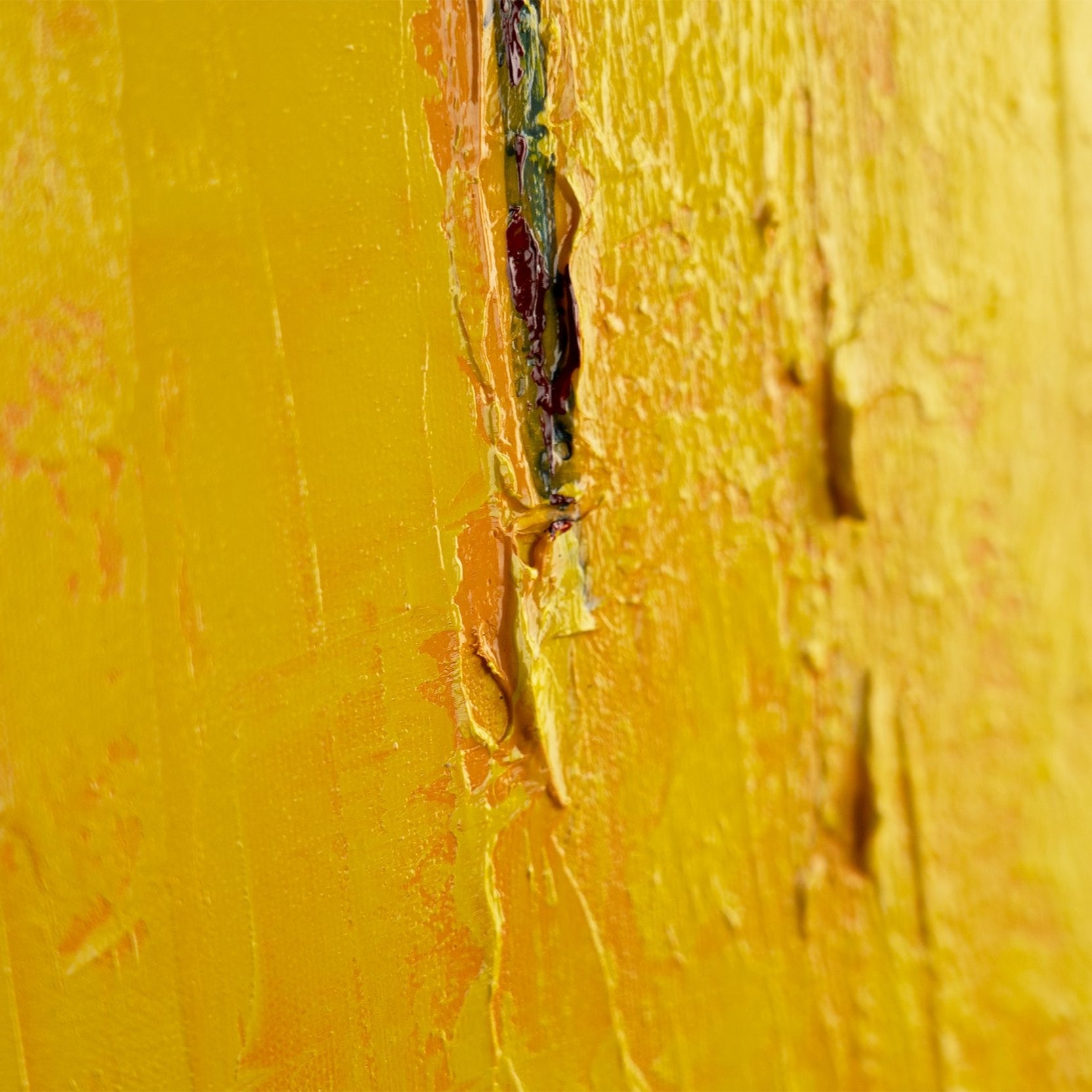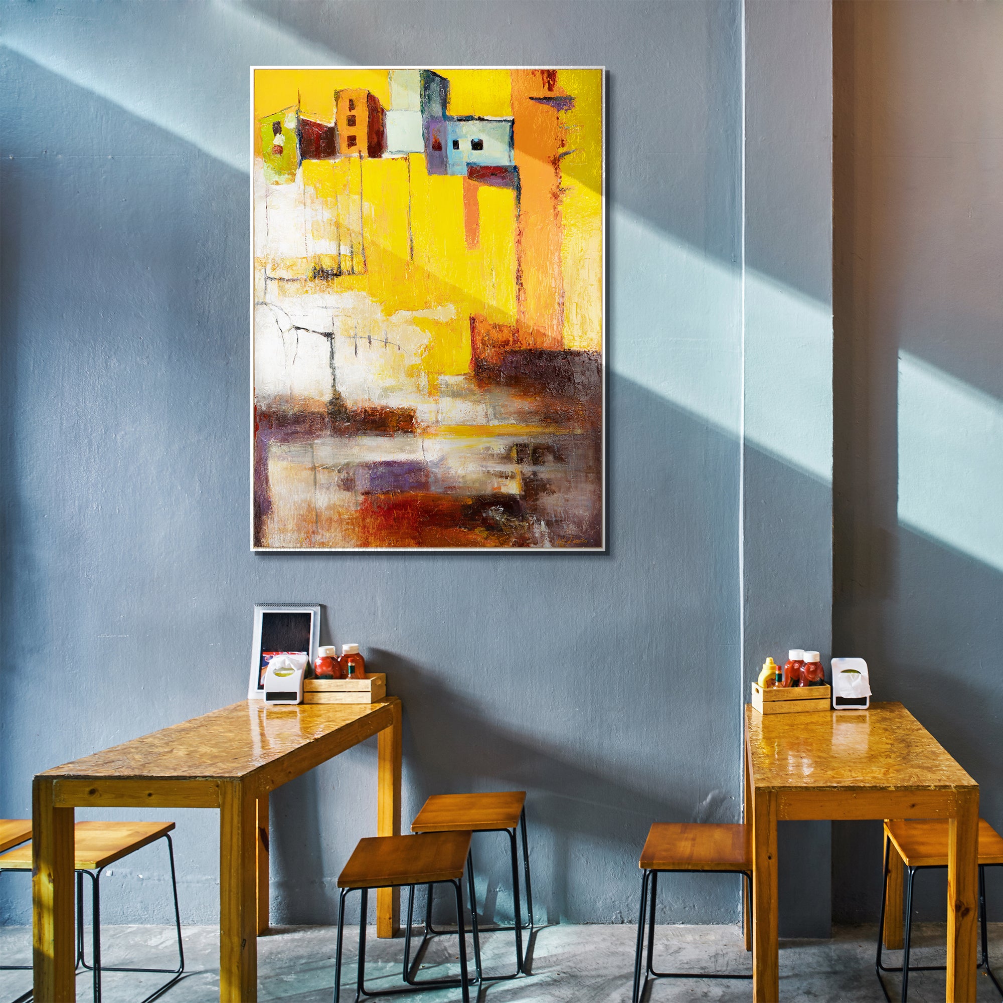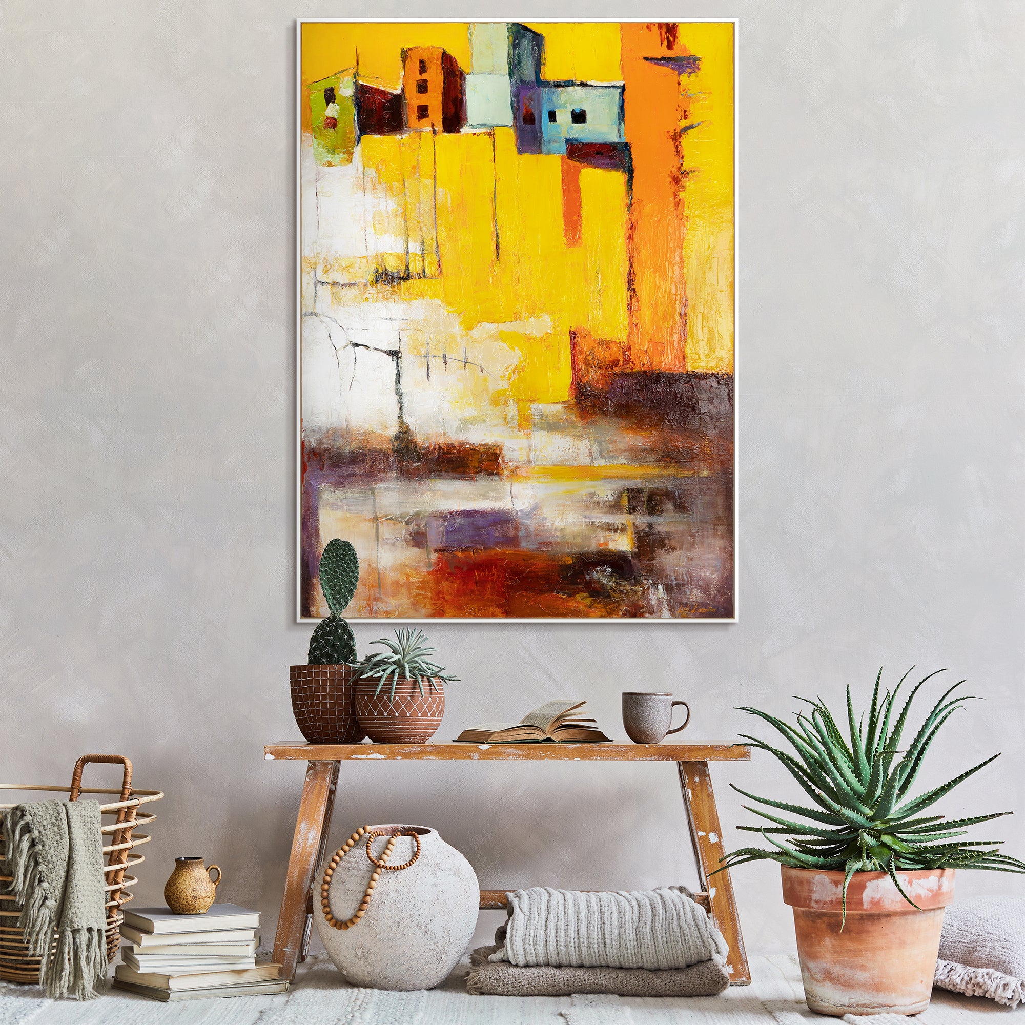 Tauchen Sie ein in die strahlenden Farben dieses handgemalten Acrylbildes „Gelbe Stadt“. Die kraftvollen Gelbtöne kombiniert mit dezenten Akzenten von Orange, Rot und Lila bringen Dynamik und Energie in jeden Raum.