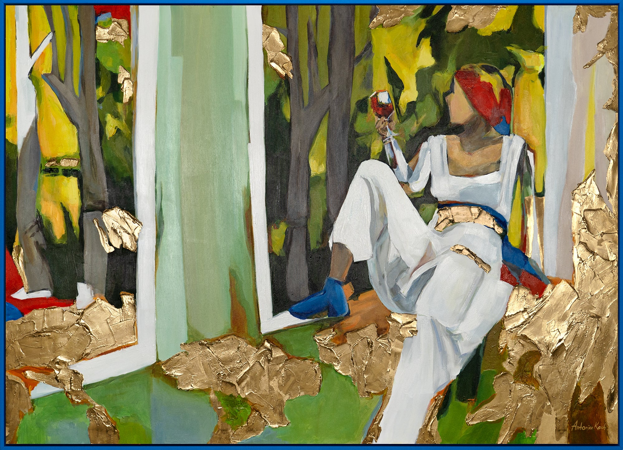 Dieses handgemalte Kunstwerk zeigt eine ruhige Figur im weißen Outfit, die mit einem Glas in der Hand an einem offenen Fenster sitzt. Die abstrahierte Szenerie ist in leuchtenden Grüntönen, edlem Gold und akzentuiertem Rot gehalten, ergänzt durch strukturierte goldene Applikationen, die dem Bild Tiefe und luxuriösen Glanz verleihen. Die harmonische Farbkomposition erzeugt ein Gefühl von Gelassenheit und eleganter Intimität.