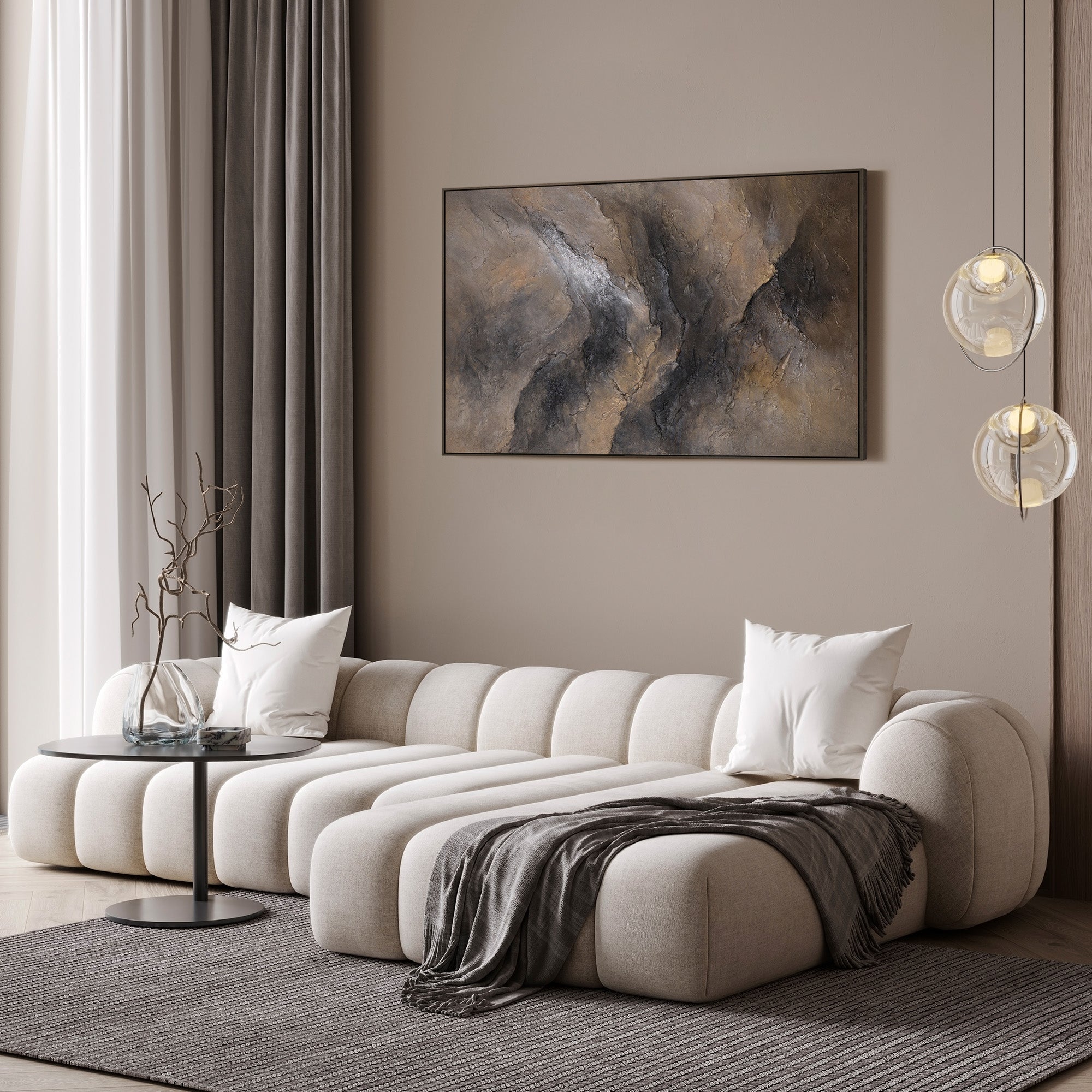 „Dunkelheit und Morgendämmerung“ steht für Übergang, Ruhe und innere Balance. Das Gemälde bringt Tiefe und Stabilität in den Raum und ergänzt moderne Interieurs mit einer ruhigen, zeitlosen Präsenz.