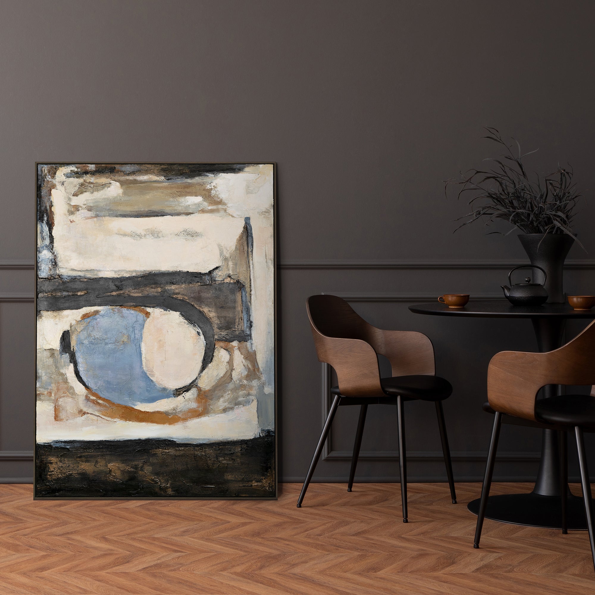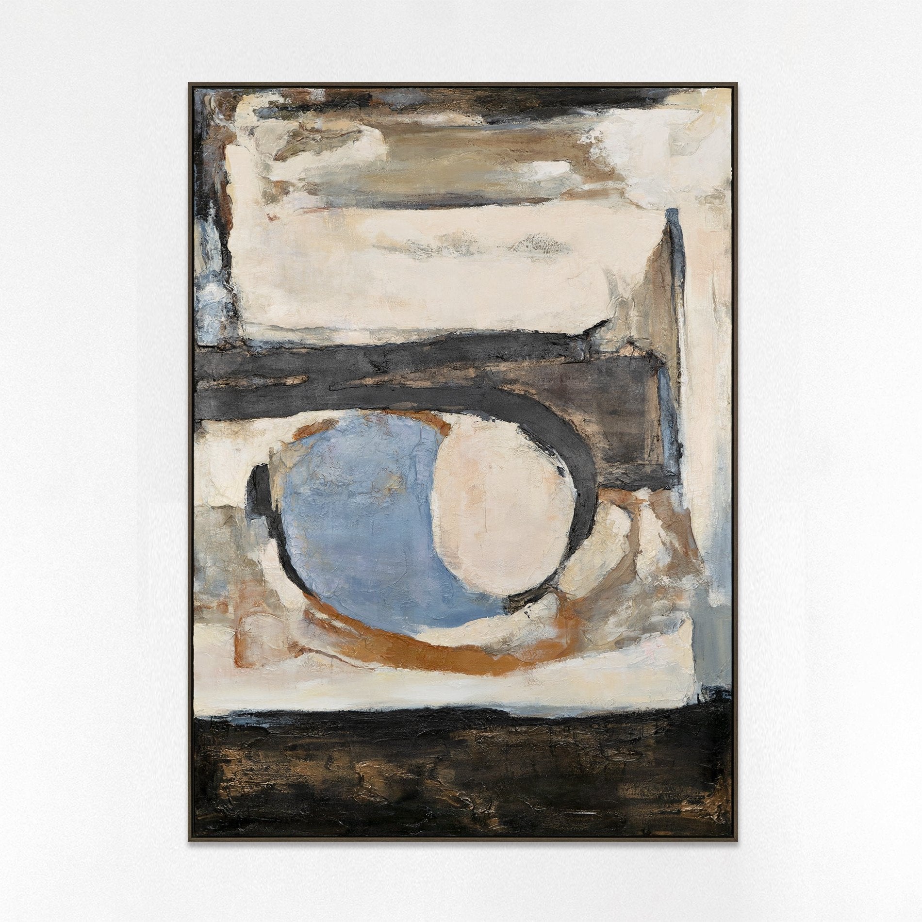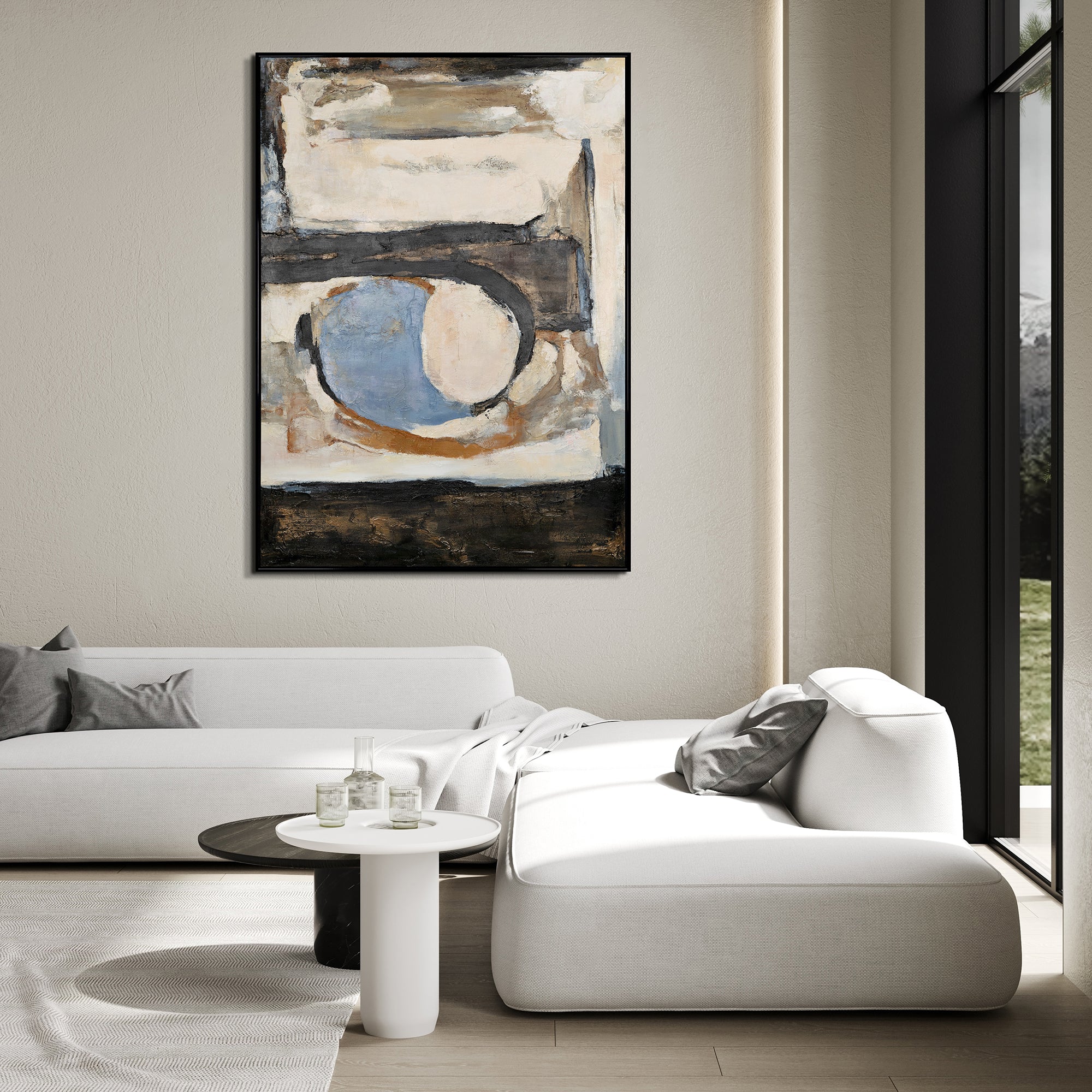 Dieses moderne abstrakte Gemälde fasziniert durch seine geometrischen Formen und harmonischen Farbkombinationen. In dezenten Beige-, Schwarz- und Blautönen gehalten, verleiht es Ihrem Raum eine zeitlose Eleganz und stilvolle Atmosphäre.