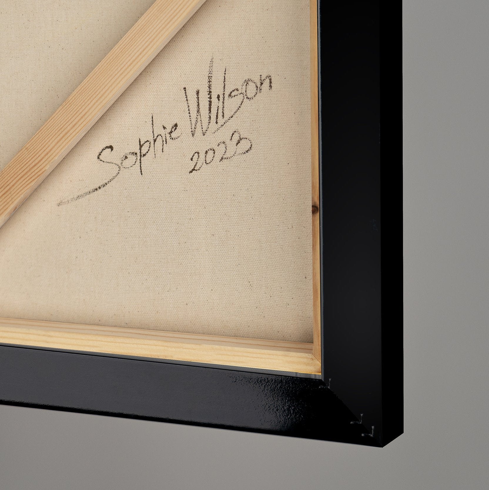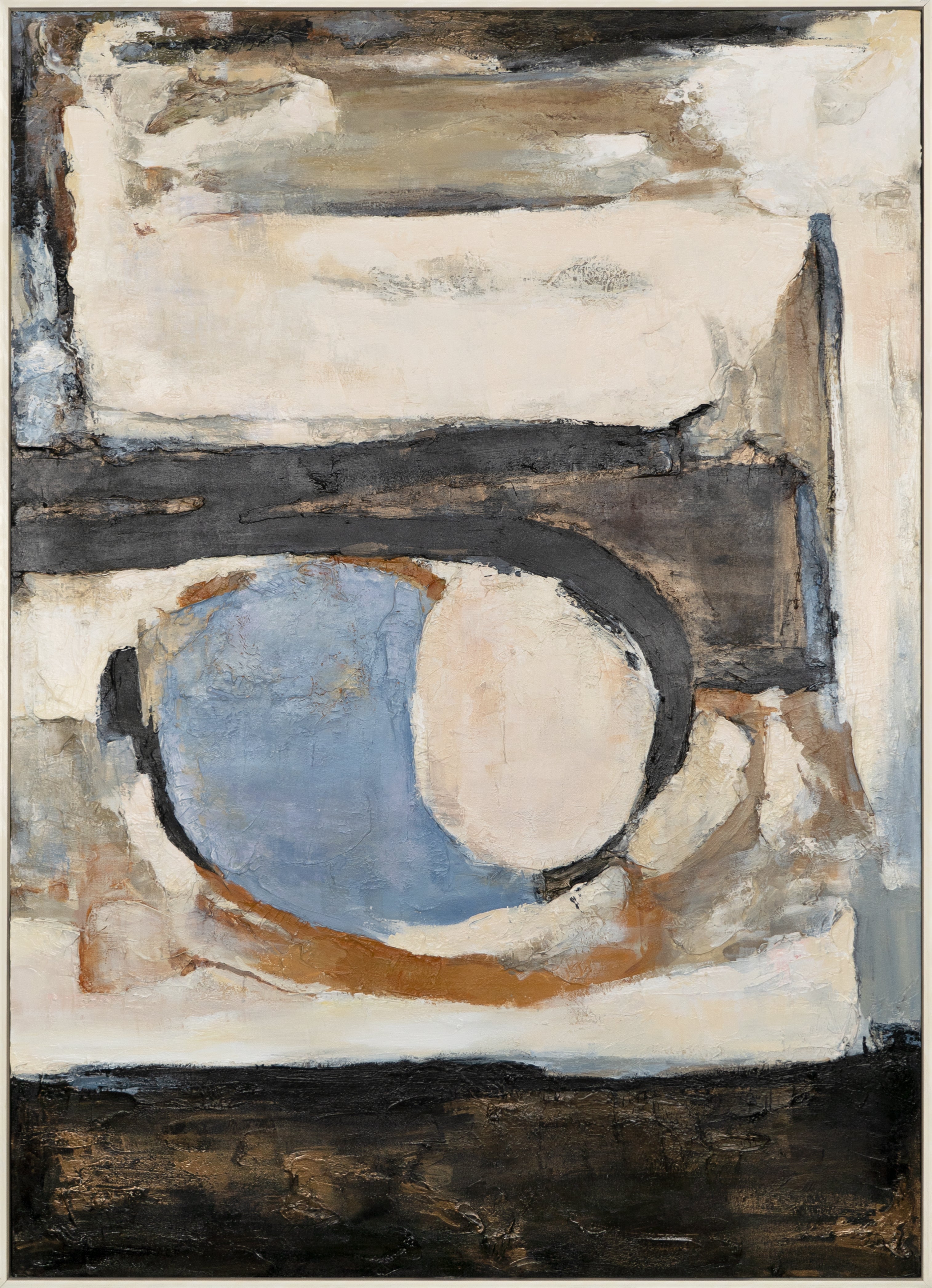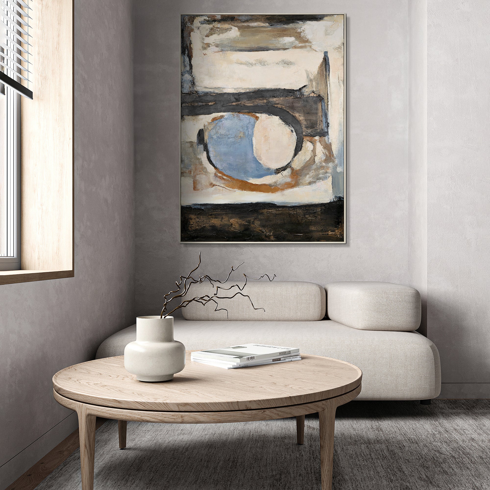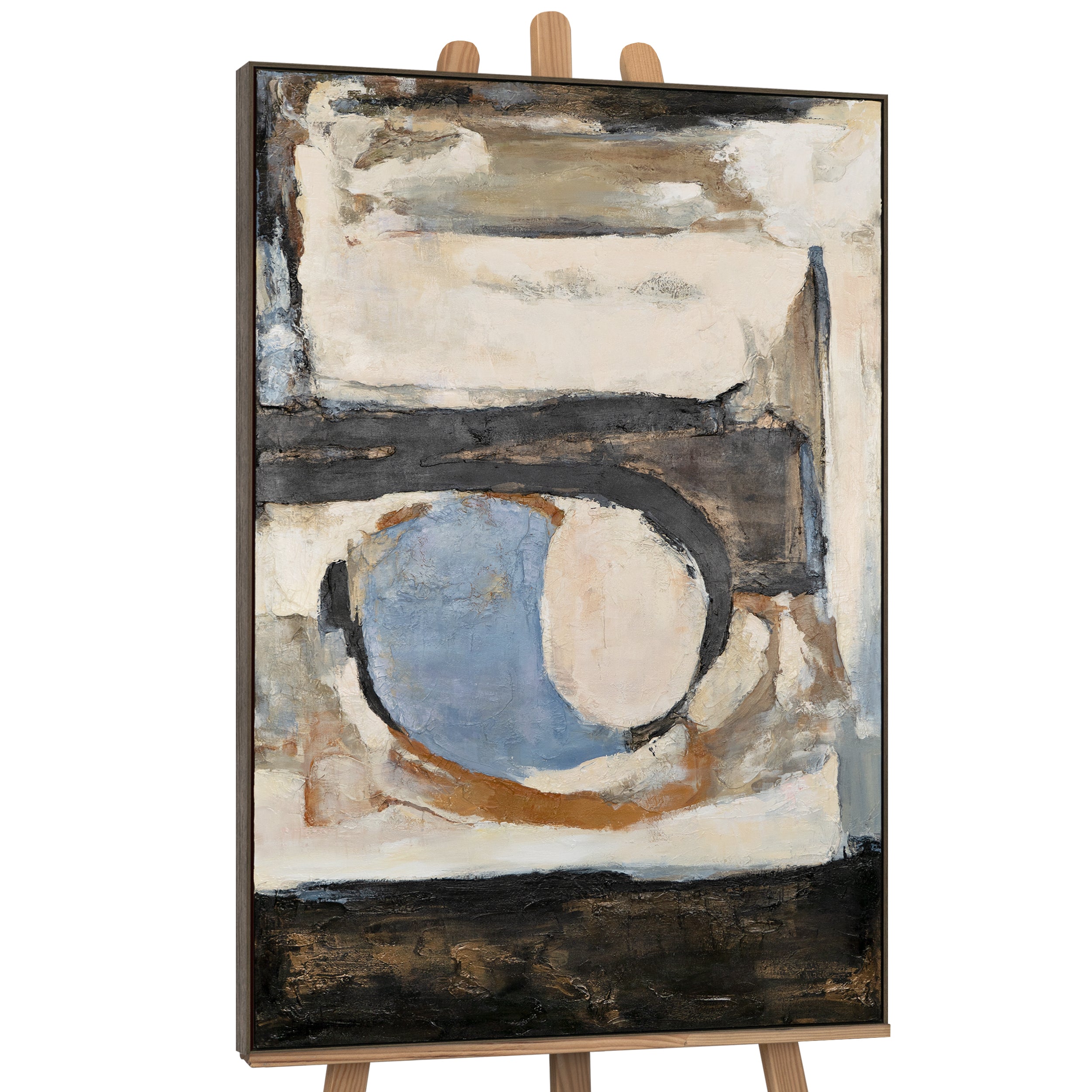 Dieses moderne abstrakte Gemälde fasziniert durch seine geometrischen Formen und harmonischen Farbkombinationen. In dezenten Beige-, Schwarz- und Blautönen gehalten, verleiht es Ihrem Raum eine zeitlose Eleganz und stilvolle Atmosphäre.