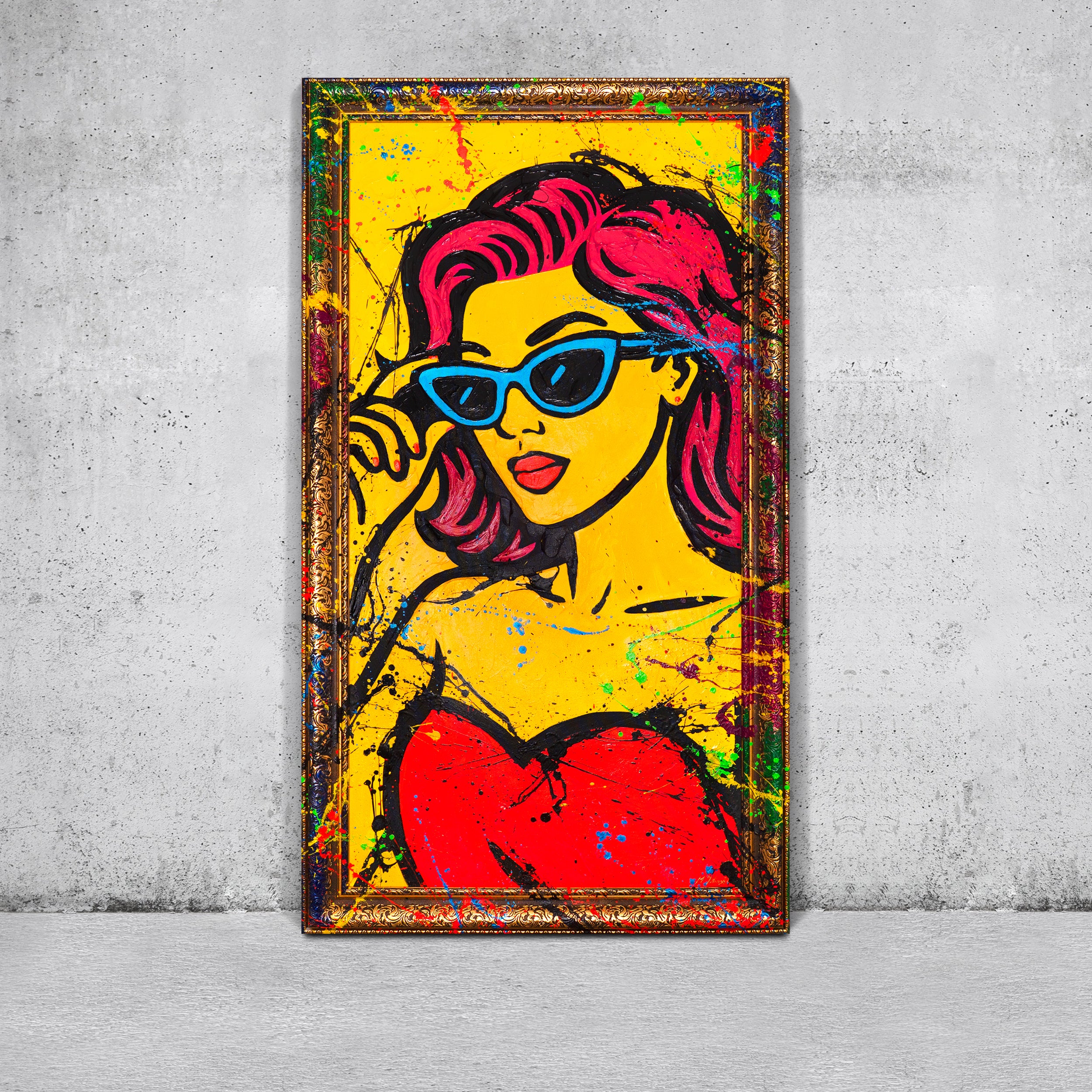 Das handgemalte Leinwandbild „Miss WOW“ ist ein echter Blickfang: Eine Frau im Pop-Art Comic-Stil mit leuchtend gelben und roten Farben, akzentuiert durch kräftige Linien und urbane Energie.